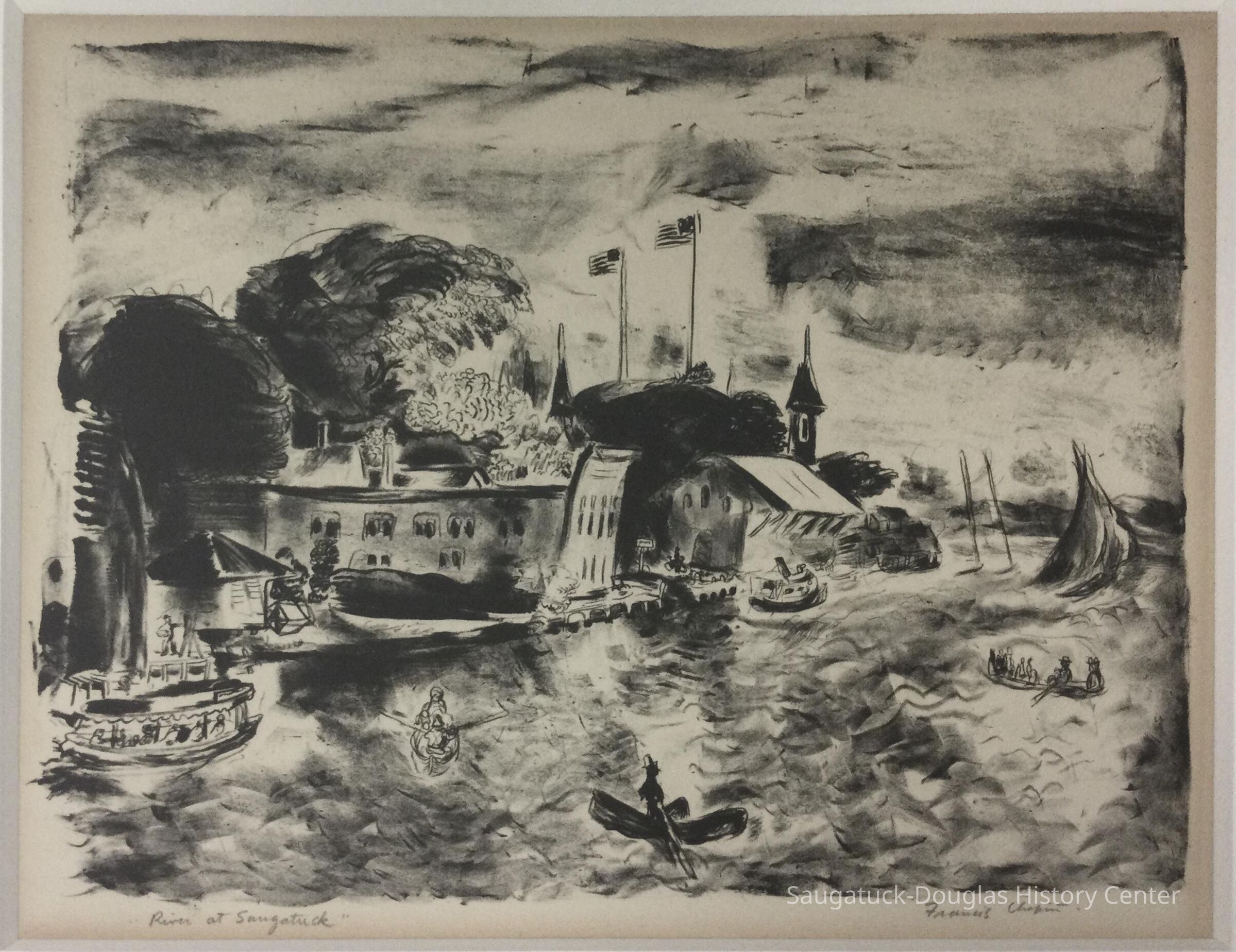 This is a lithograph print by Francis Chapin. It depicts the Kalamazoo river at Saugatuck. The view is of the Big Pavilion situated among smaller buildings, alongside small fishing boats and sailboats, as well as the chain ferry all the way to the left hand side of the piece.Type of Print