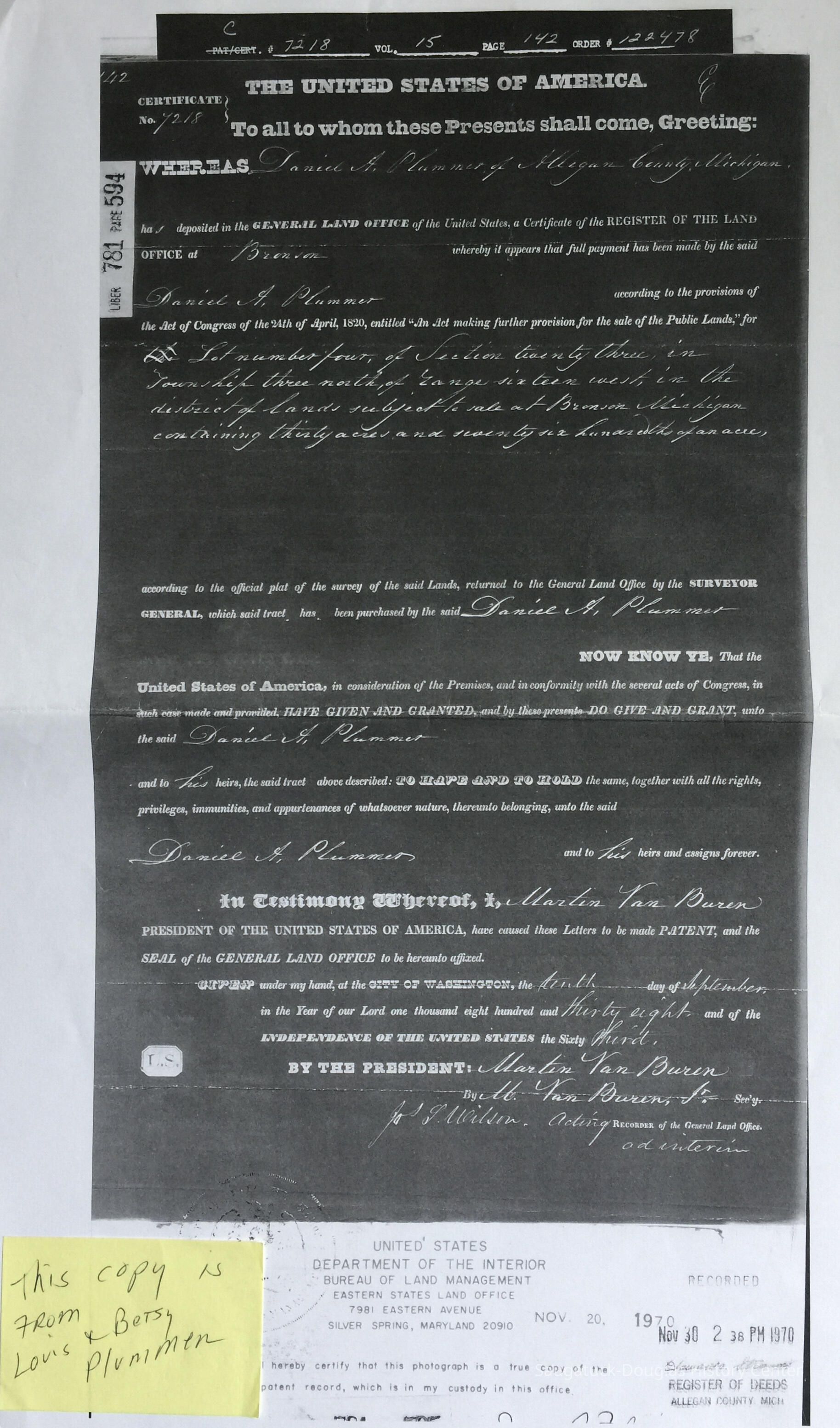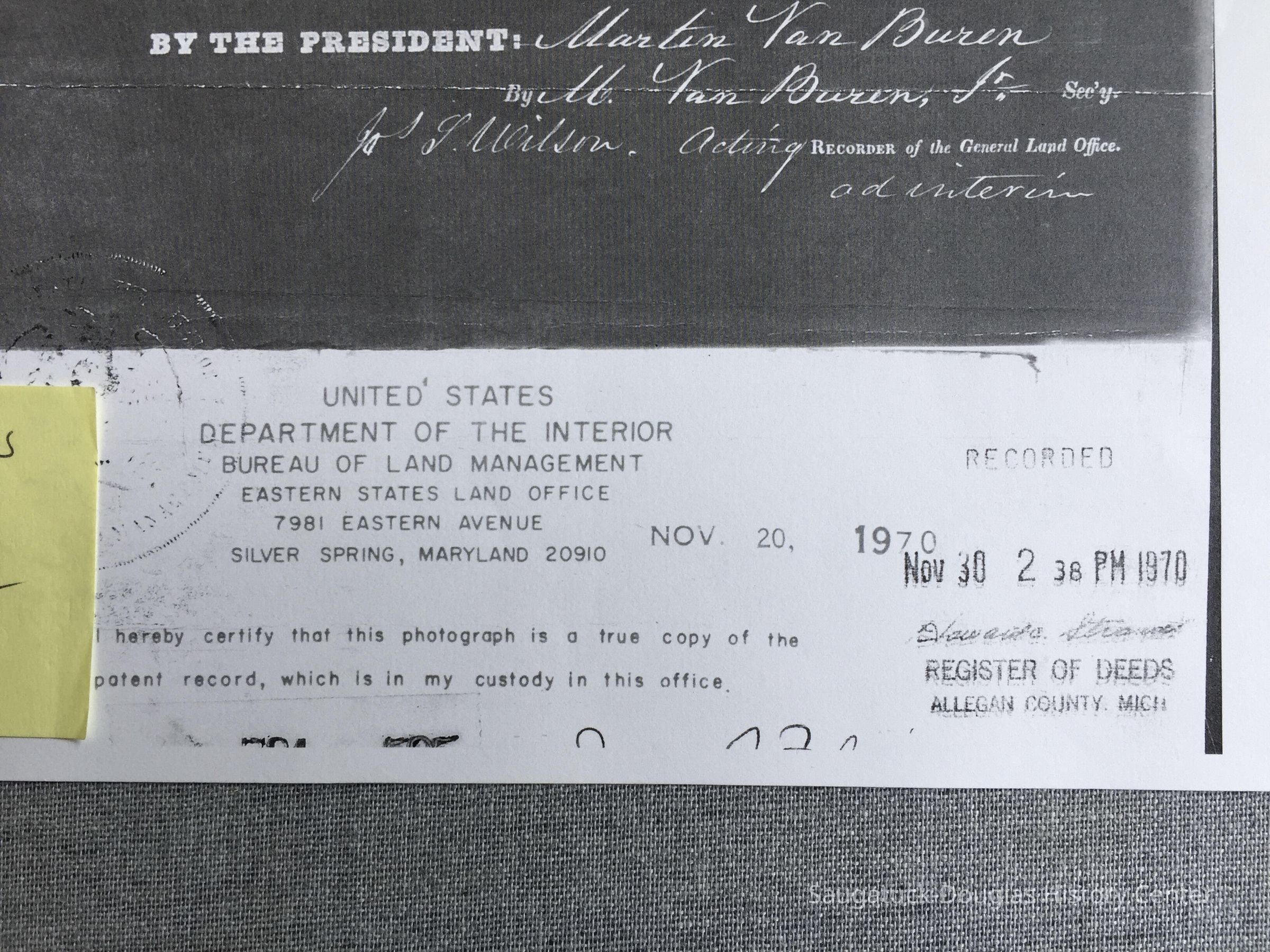 A 1970 photocopy of a 1838 legal document recording the sale of land from the Department of the Interior Bureau of Land Management, Allegan County.Cataloged By