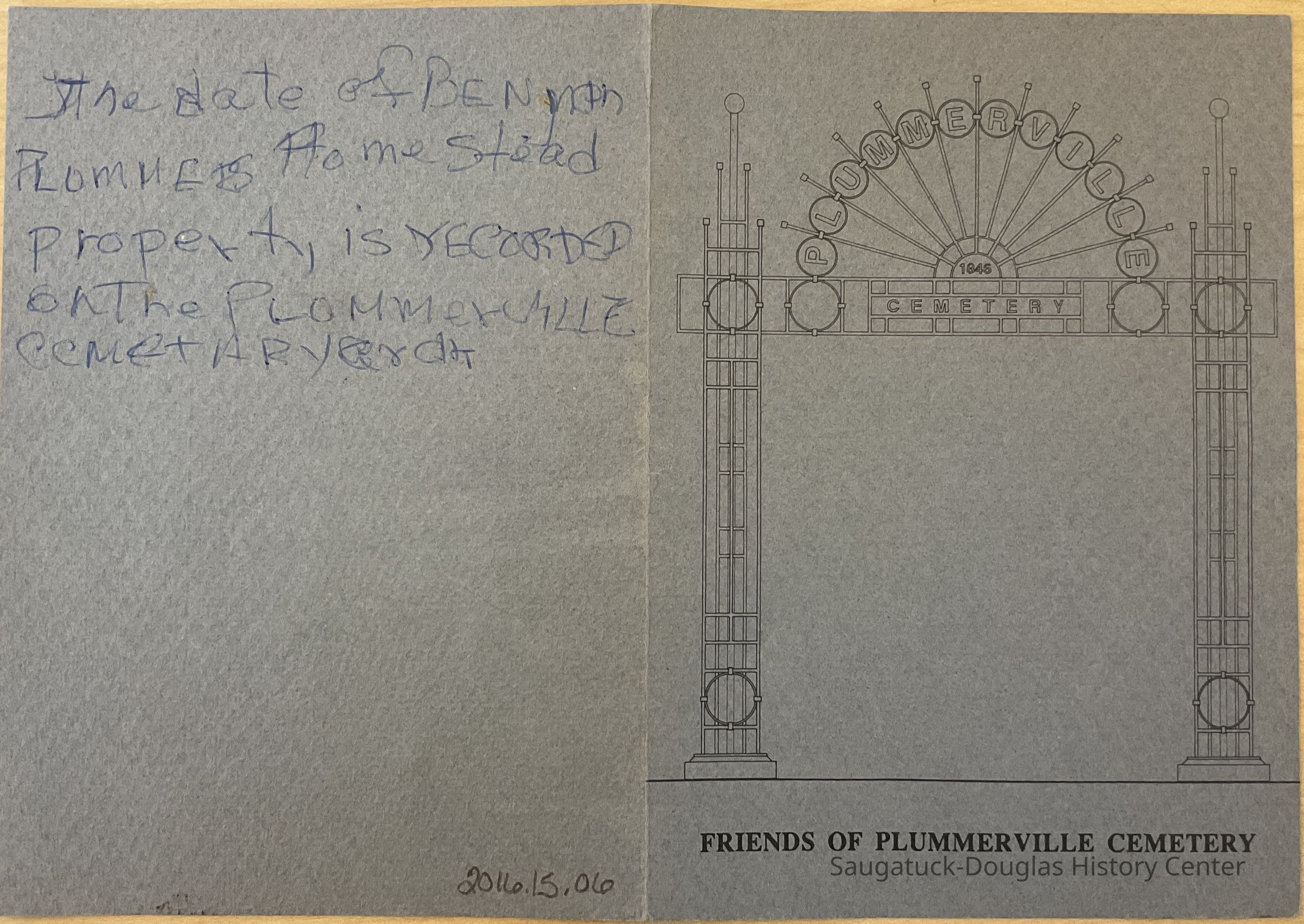 Friends of Plummerville Cemetery booklet regarding Plummerville Cemetery Memorial Arch Dedication Ceremony. Program for the ceremony and contributors to the memorial listed in booklet.Collection