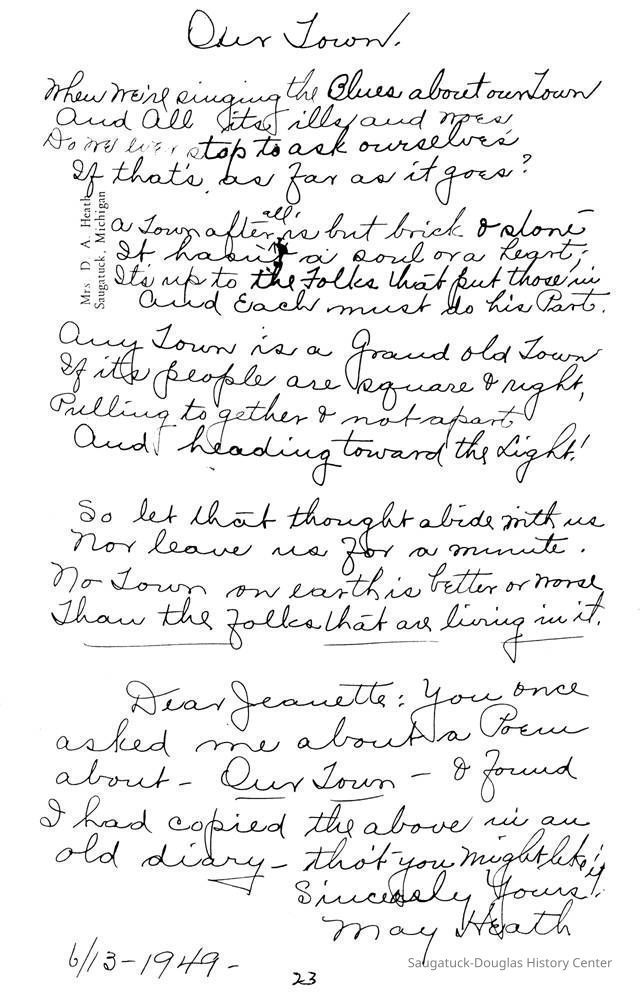 At right is a facsimile of a letter written in 1949 from Saugatuck historian May Francis Heath to Jeannette (Walker) Barr, the daughter of Dr. Robert J. Walker who served Saugatuck for nearly 50 years beginning in 1895. Mrs. Heath was responding to a request by Mrs. Barr for a poem that Mrs. Heath had quoted at some club meeting. She makes no note about whether she wrote the poem in question or copied it from another source.