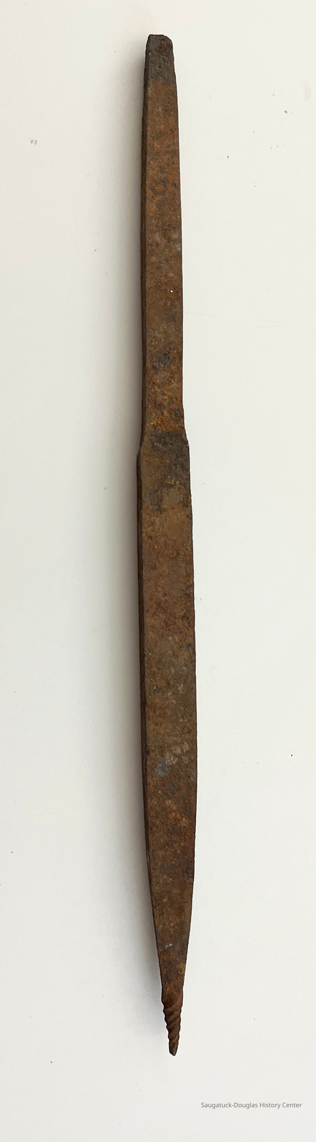 Solid metal tool with square profile and tapering tip that ends in a twisted thread. The tool may have once had a handle. The surface, though pitted with rust and use, is not textured like a rasp or file.Cataloged By
