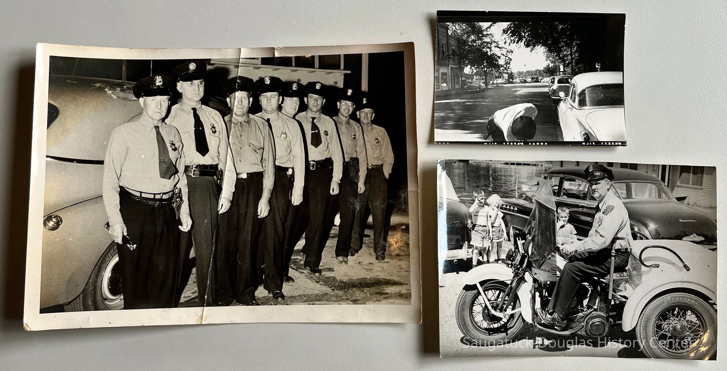 1. Eight officers lined up by a car ca 1948. 5x7" Left to right: Harry Newnham (chief), Art Troutman, ?, Henry Hungerford, ?, Joe Demski (became chief in mid 1950s), ?, ?.