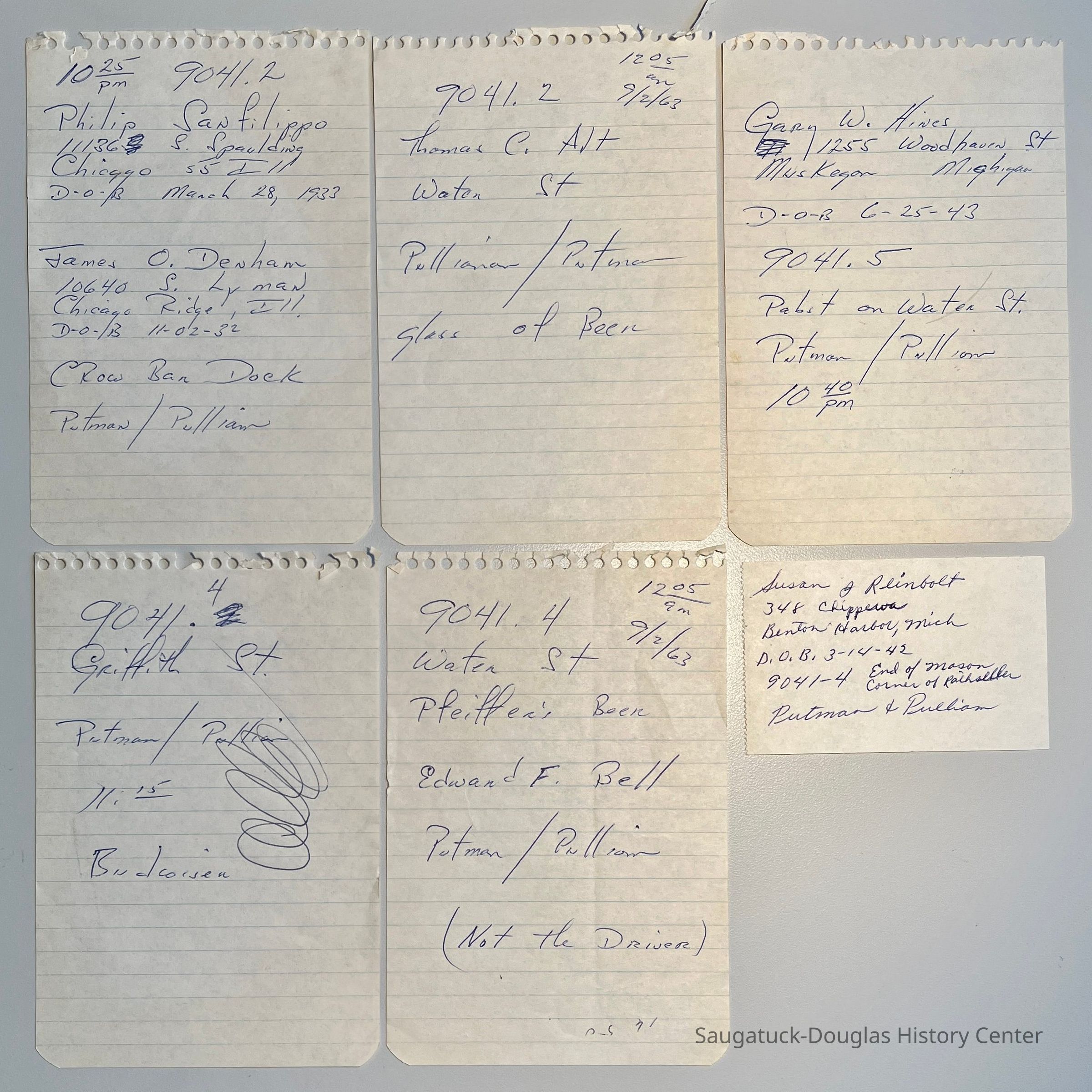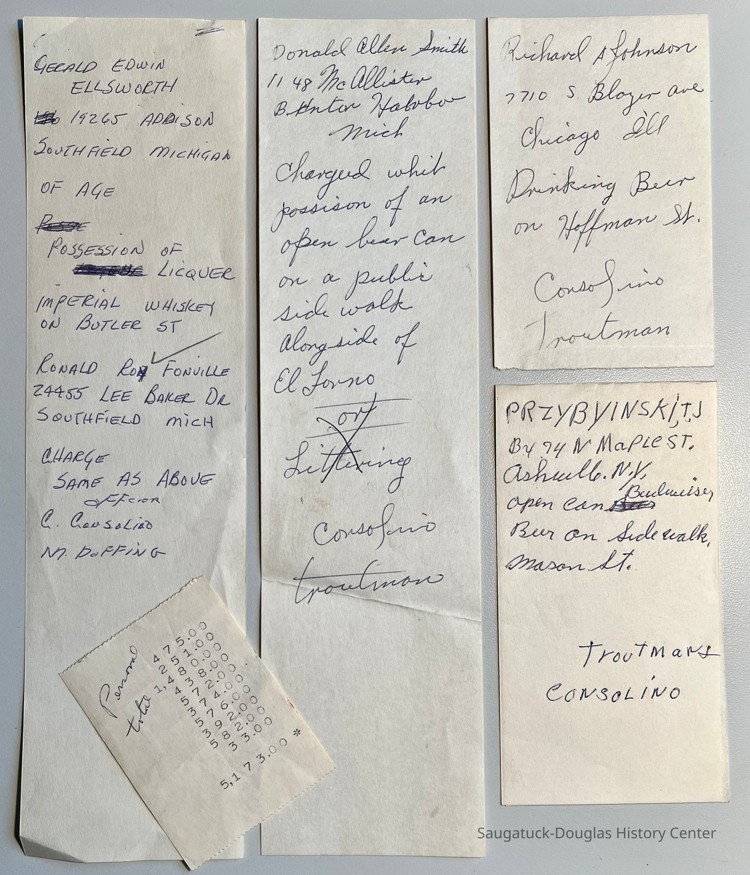 B. Fourteen pages from police officer's notebooks outlining the details of petty offenses, mostly alcohol possession. Notes include the name, address, date of birth of the offender and sometimes the time, place and details of the offense and name of police officers.