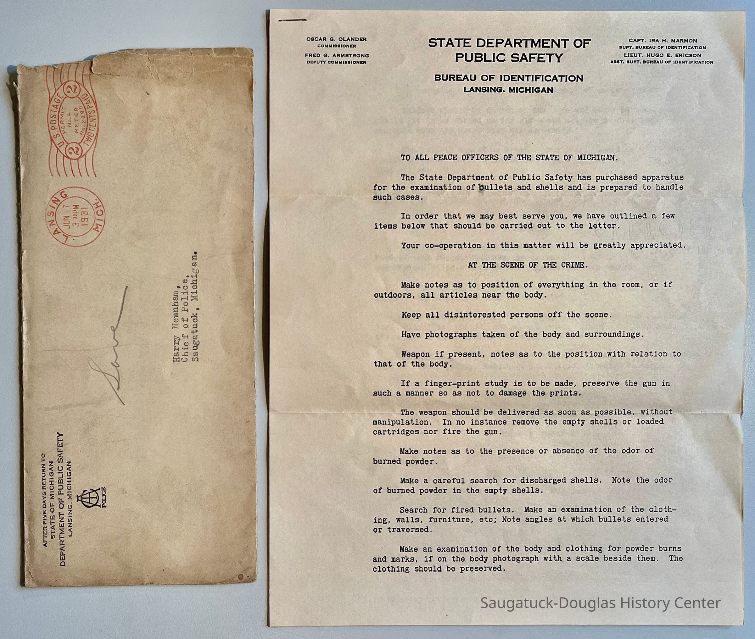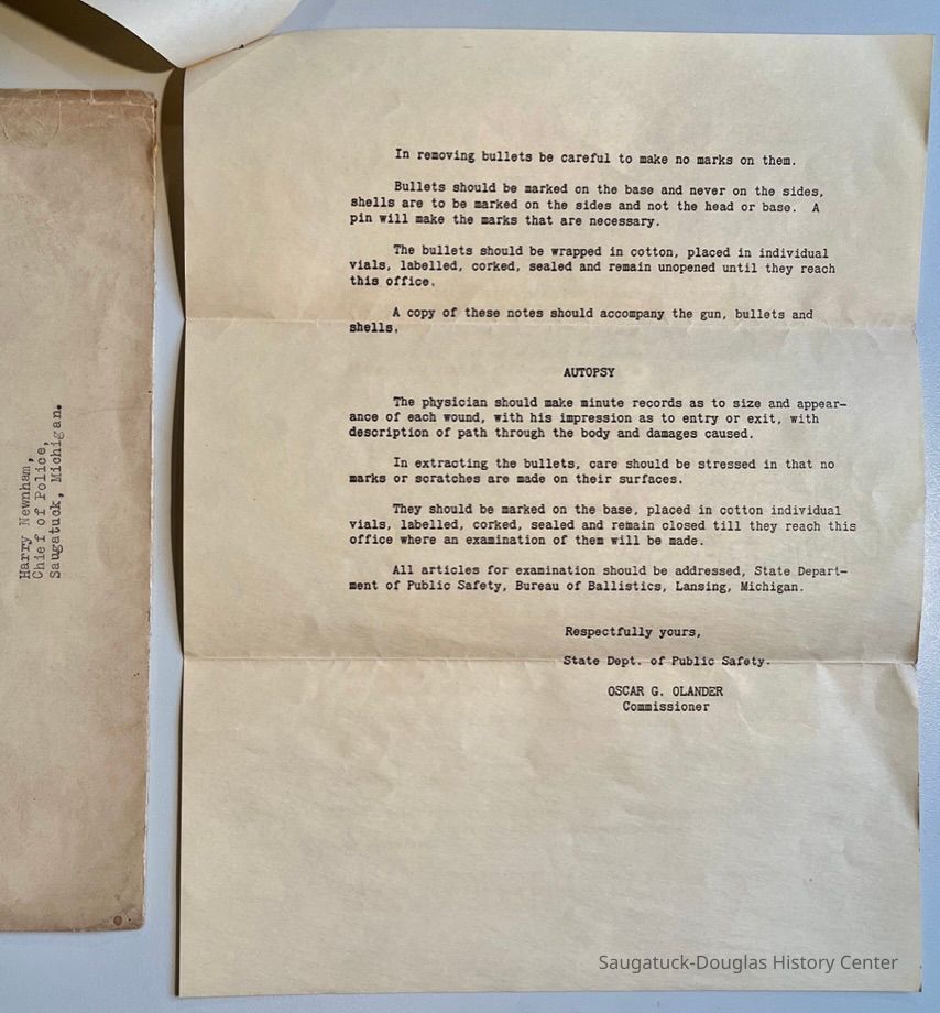 A. Letter to Harry Newnham, Chief of Police, from Oscar G. Olander of the Michigan State Department of Public Safety with tips about how to handle firearms evidence at crime scenes. Two page letter and envelope, postmarked 1931.