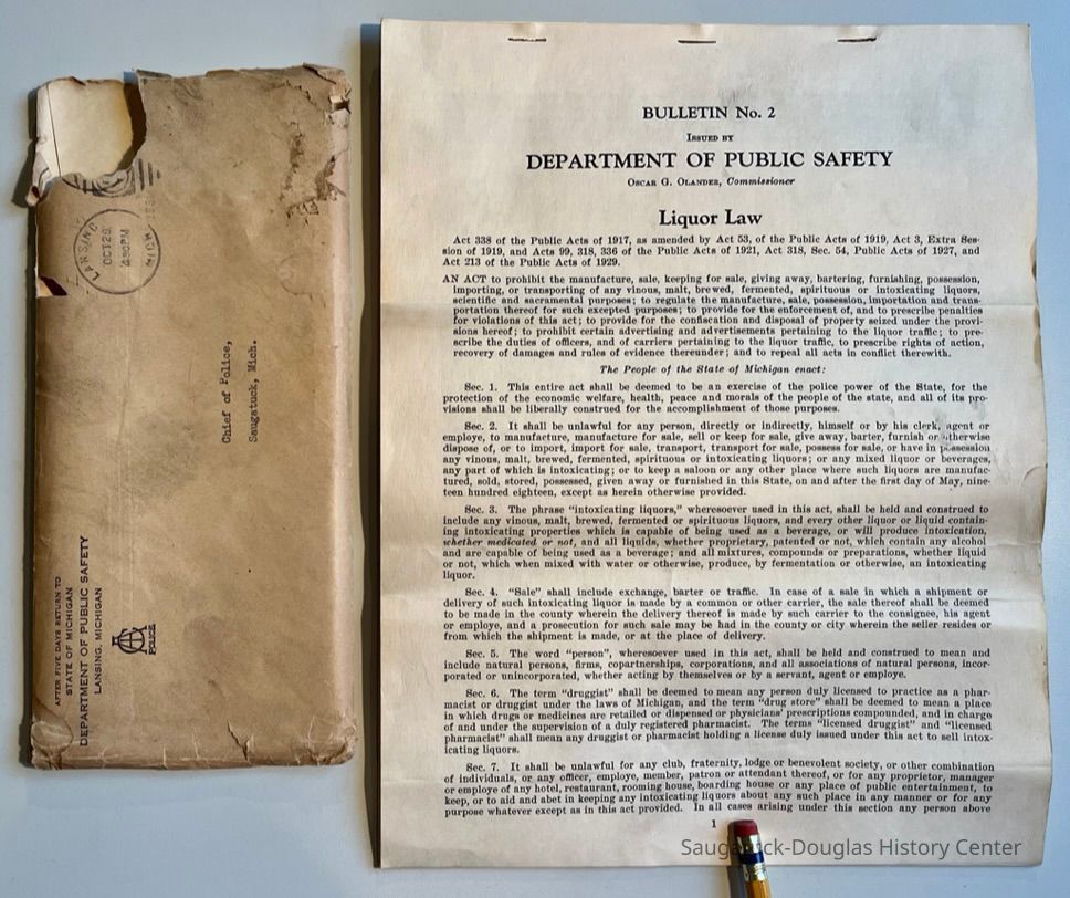 C. Bulletin No. 2 Department of Public Safety Liquor Law, a 15-page document and envelope mailed to Saugatuck Chief of Police. Postmarked 1931