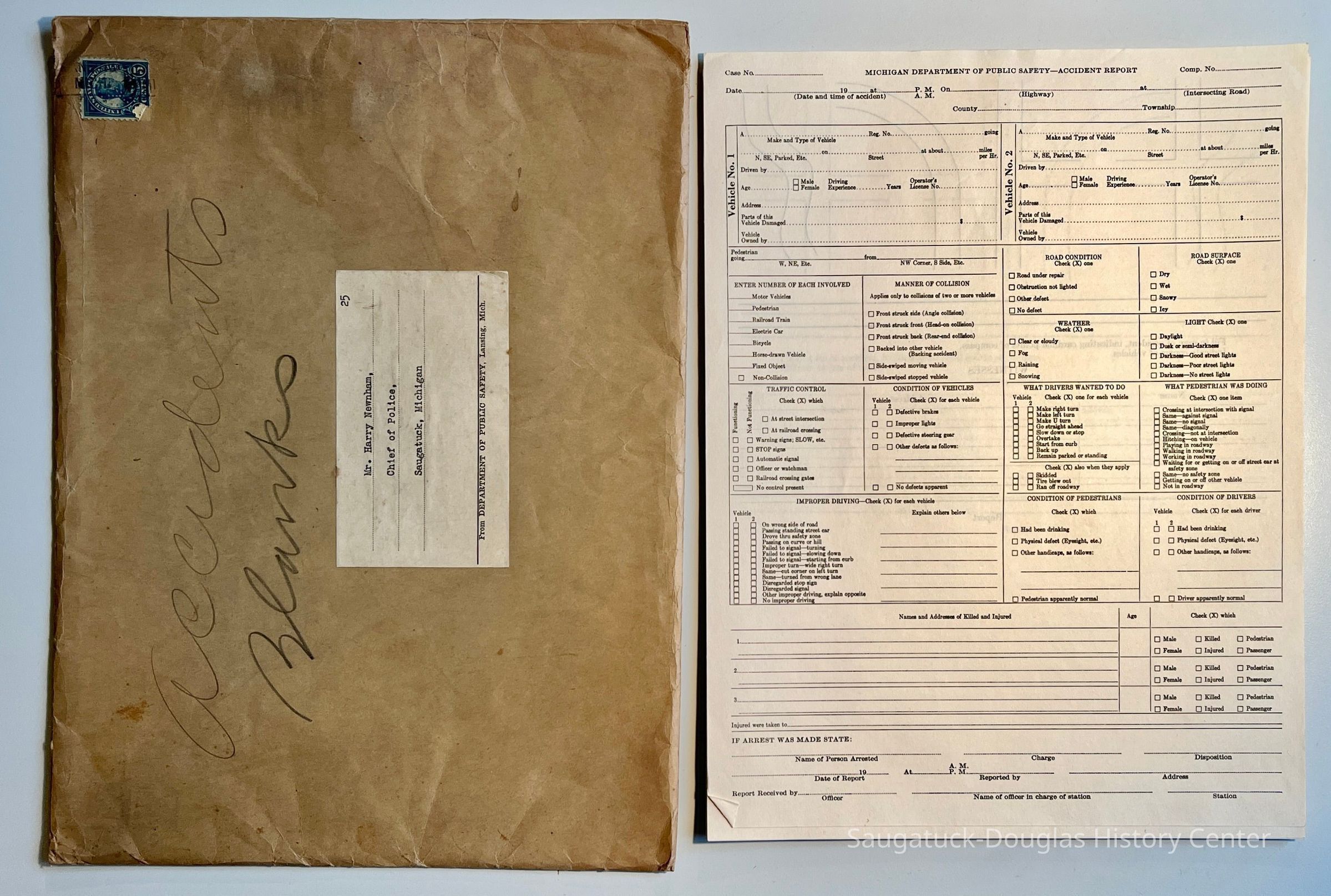 D. Five Michigan State Department of Public Safety blank accident report forms and envelope addressed to Harry Newnham.Collection