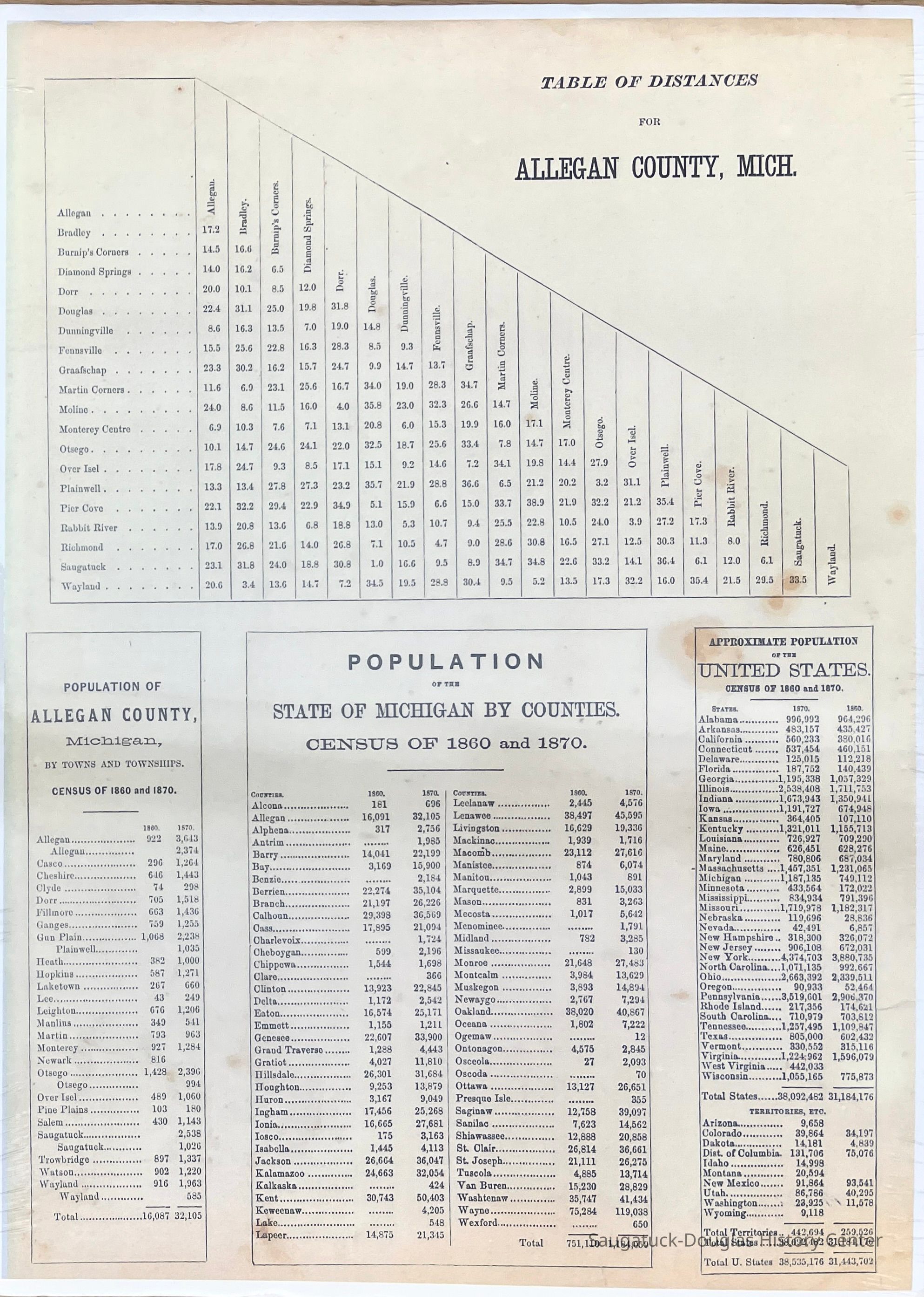 Allegan County polulation chart 1873, Allegan County table of distances 1873, Population state of Michigan by counties 1870-1880, United States population by 1860 and 1870, Allegan County recordsArchive Details