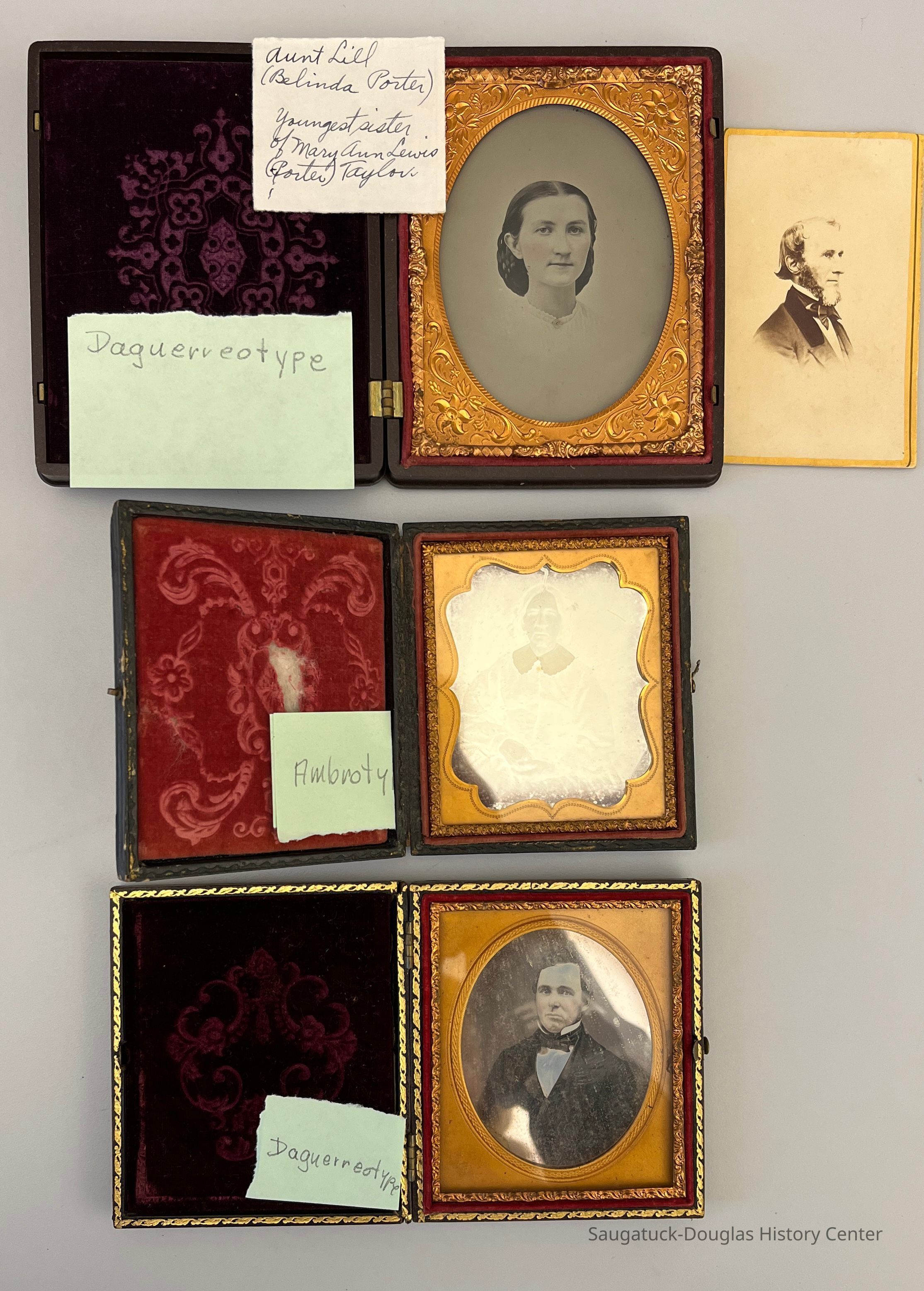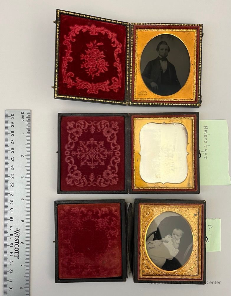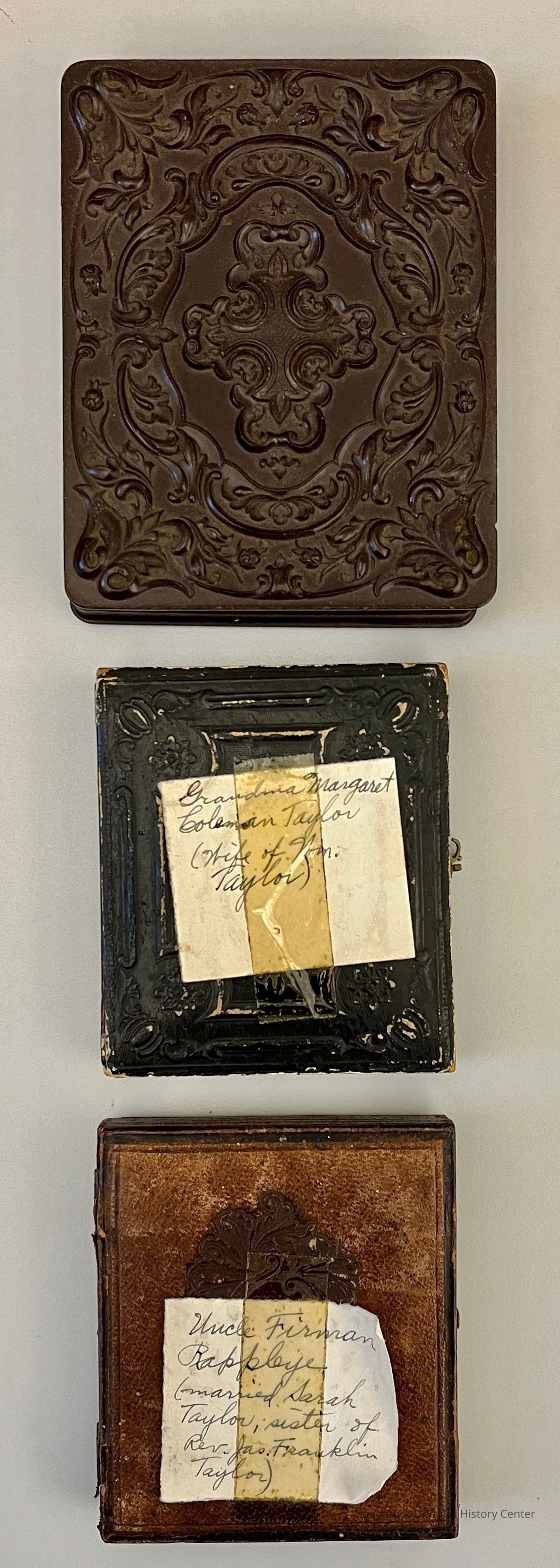 Collection of 12 daguerreotype and ambrotype photos in decorative cases. The largest is 5 inches high, most are around 3 inches high, the smallest is 2 inches high. Many have notes taped to the cover or tucked inside. Green paper notes identify the photo processCollection