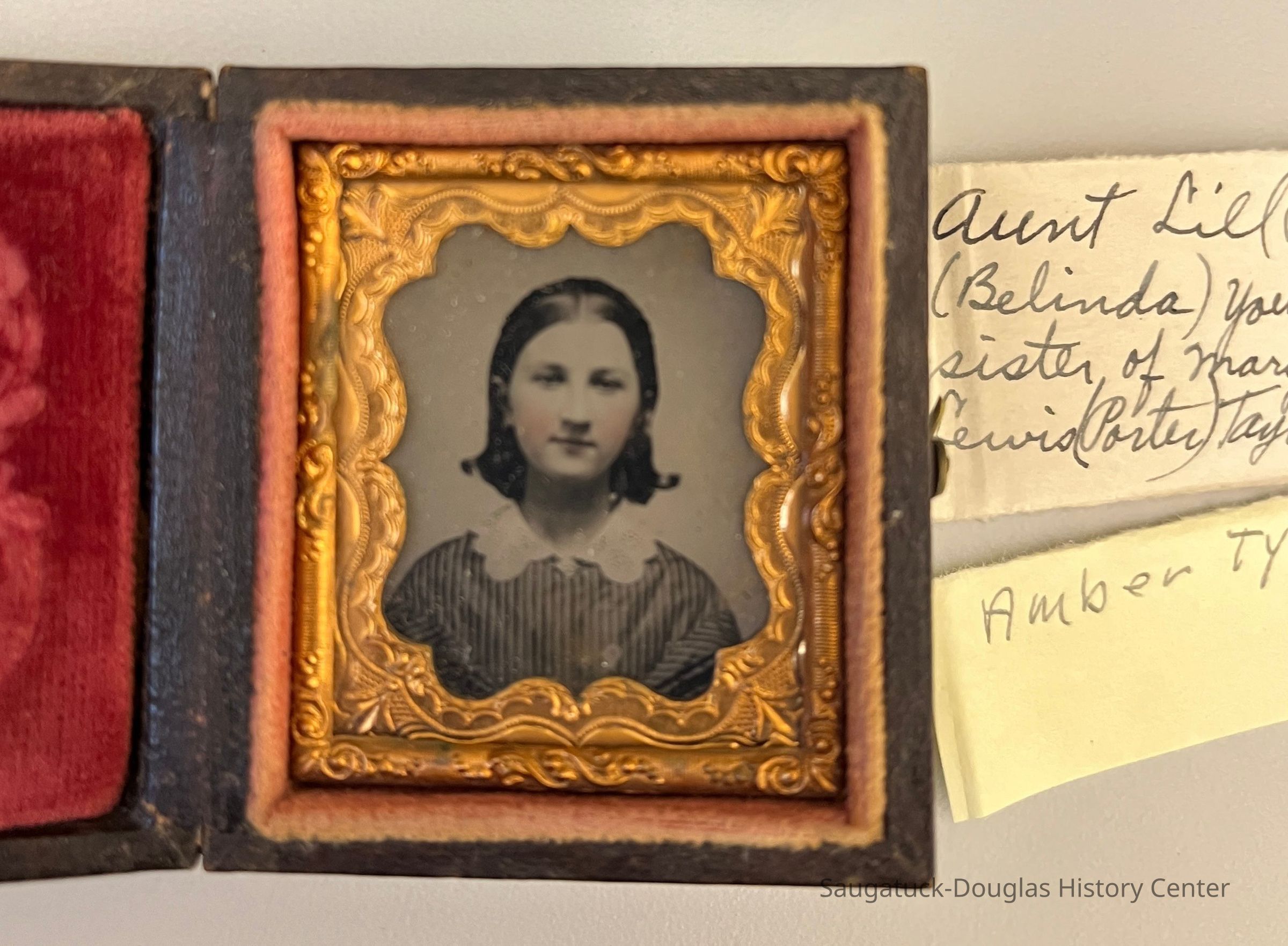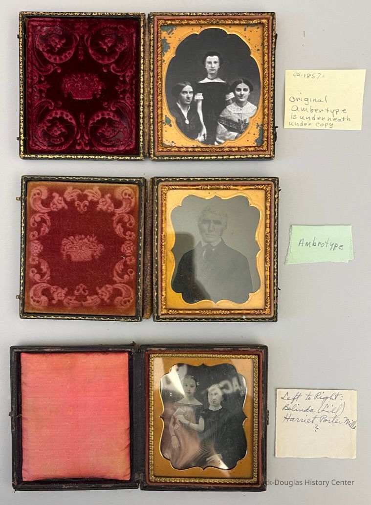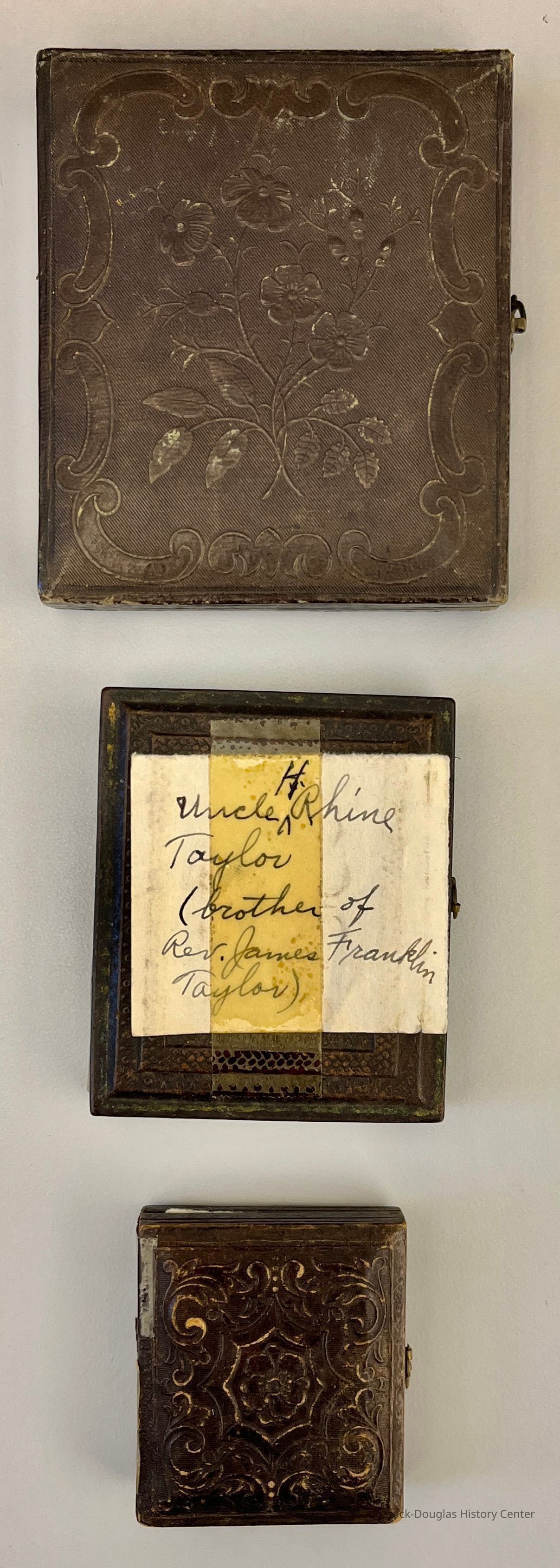 Collection of 12 daguerreotype and ambrotype photos in decorative cases. The largest is 5 inches high, most are around 3 inches high, the smallest is 2 inches high. Many have notes taped to the cover or tucked inside. Green paper notes identify the photo processCollection