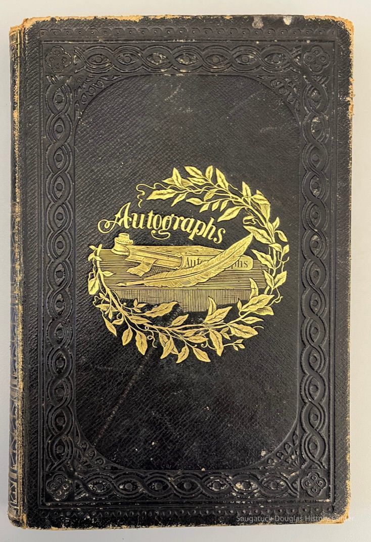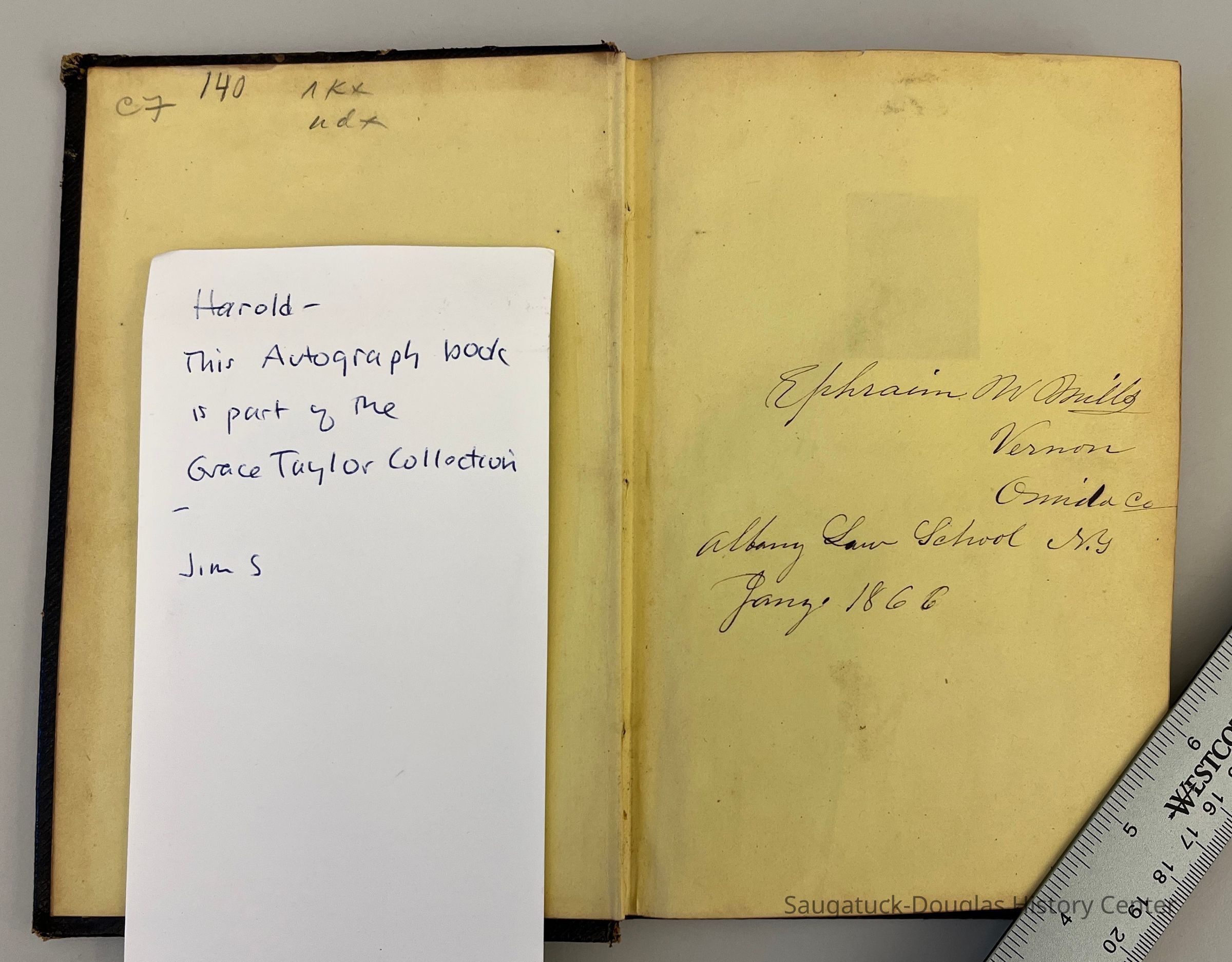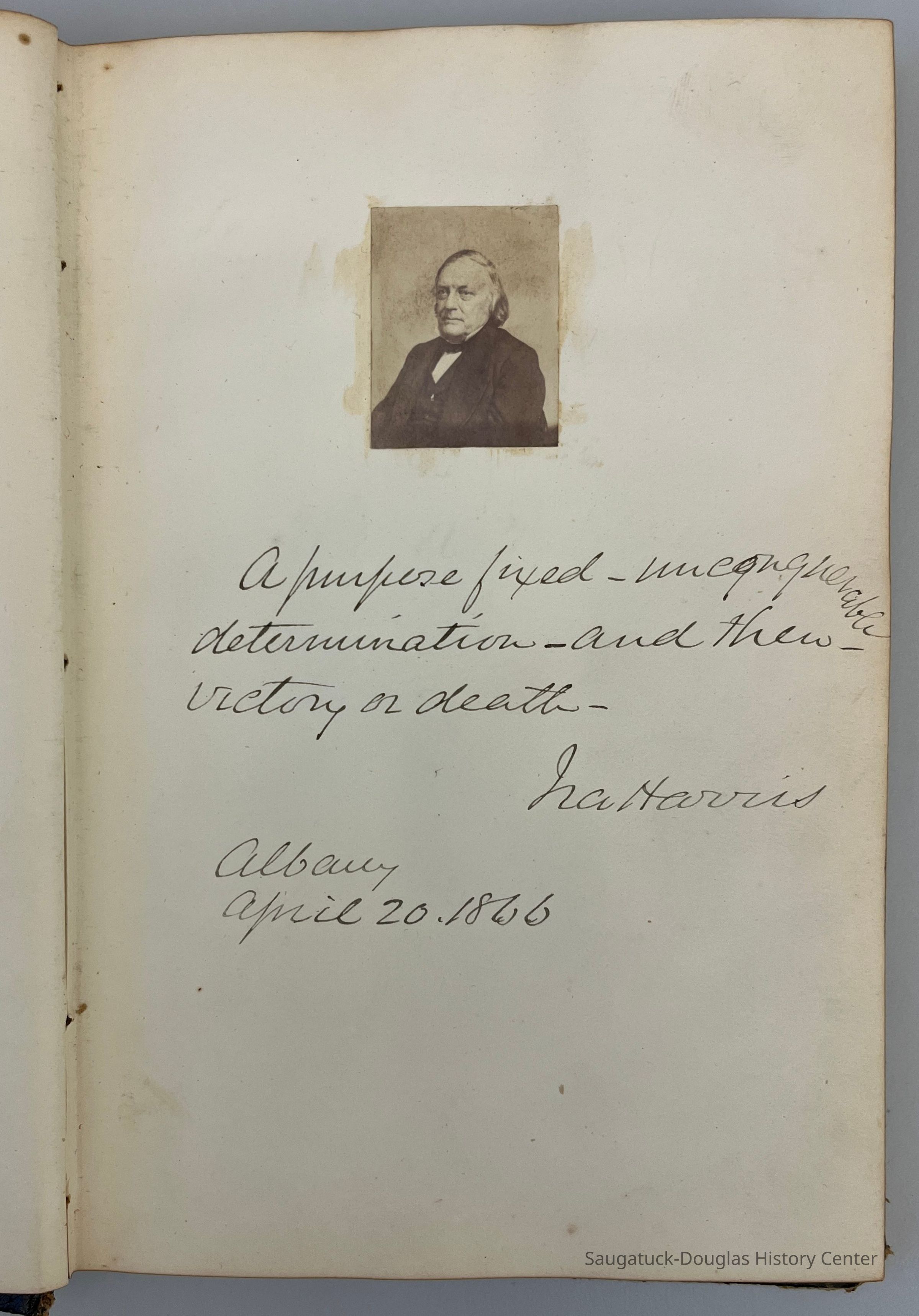 Autograph album dated 1866 Albany Law School with what seems to be class photos pasted on each page with the autograph.