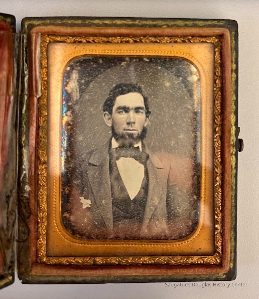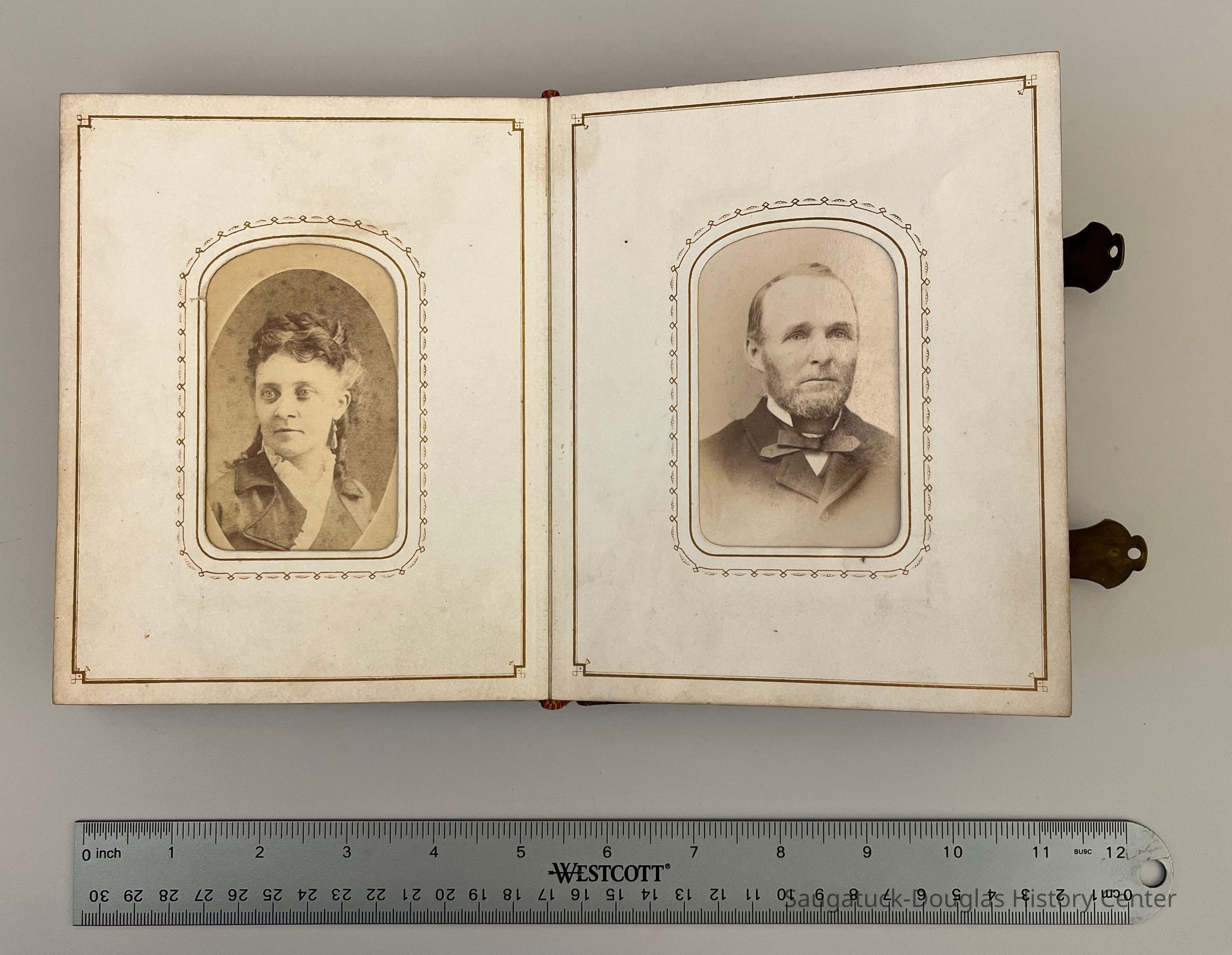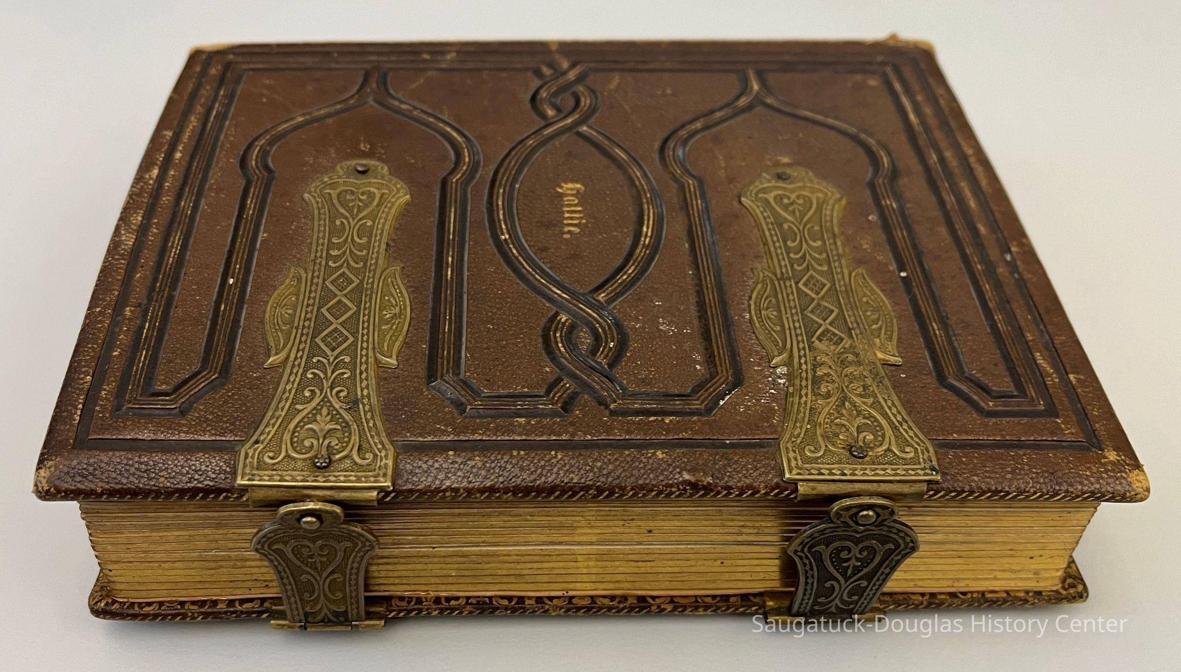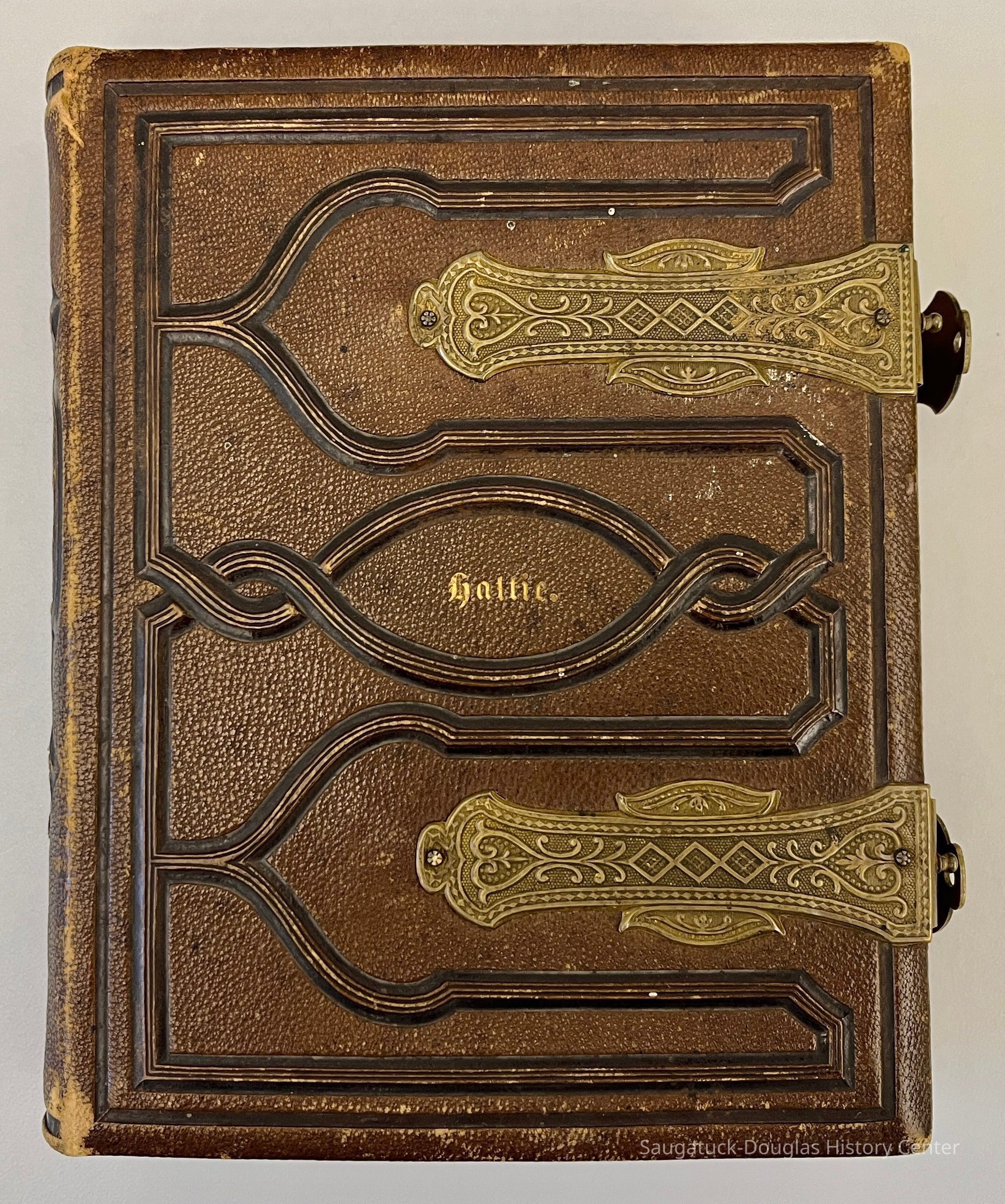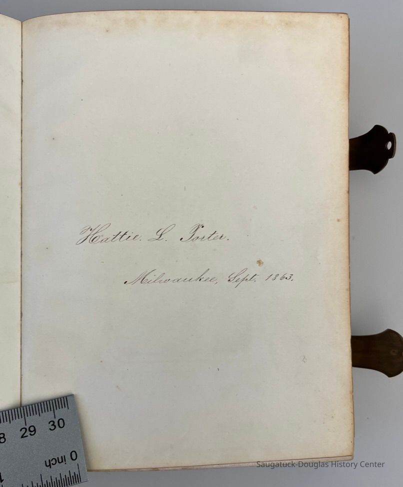 Brass-latched leather photo album imprinted "Hattie." on the cover. 8x5" inscribed inside with "Hattie L. Porter, Milwaukee, Sept 1863"