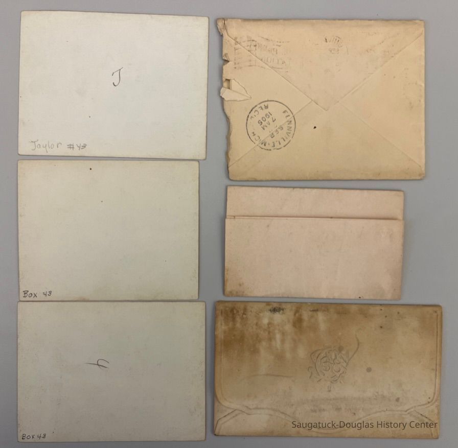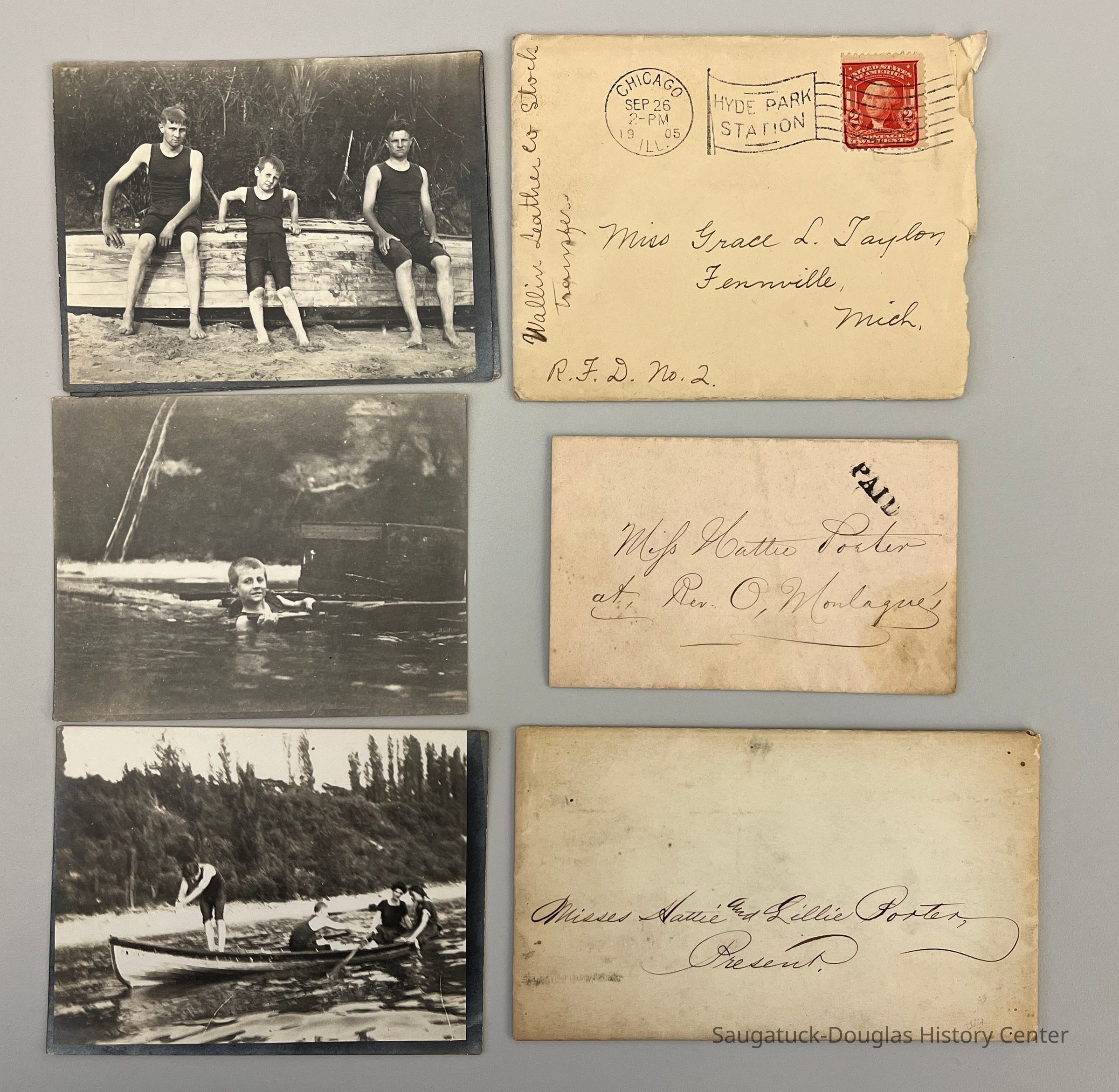 Four photos of boys in long swimsuits with a rowboat and letters to Miss Grace L Taylor of Fennville and Misses Hattie and Lillie Porter