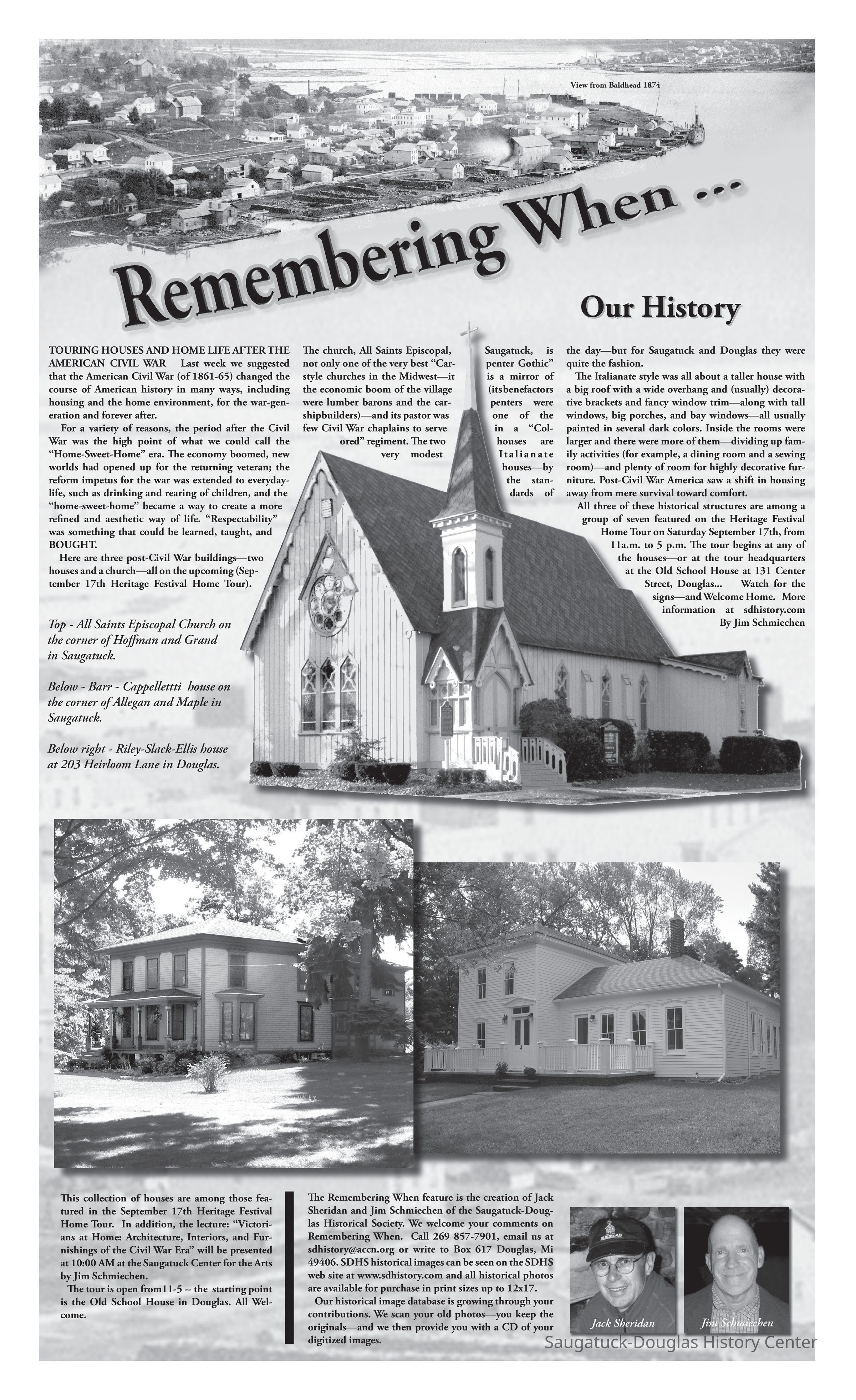 Here are three post-Civil War buildings—two houses and a church—all on the upcoming (September 17th Heritage Festival Home Tour). The church, All Saints Episcopal, Saugatuck, is not only one of the very best “Carpenter Gothic” style churches in the Midwest—it is a mirror of the economic boom of the village (its benefactors were lumber barons and the carpenters were shipbuilders)—and its pastor was one of the few Civil War chaplains to serve in a “Colored” regiment. The two houses are very modest Italianate houses—by the standards of the day—but for Saugatuck and Douglas they were quite the fashion.