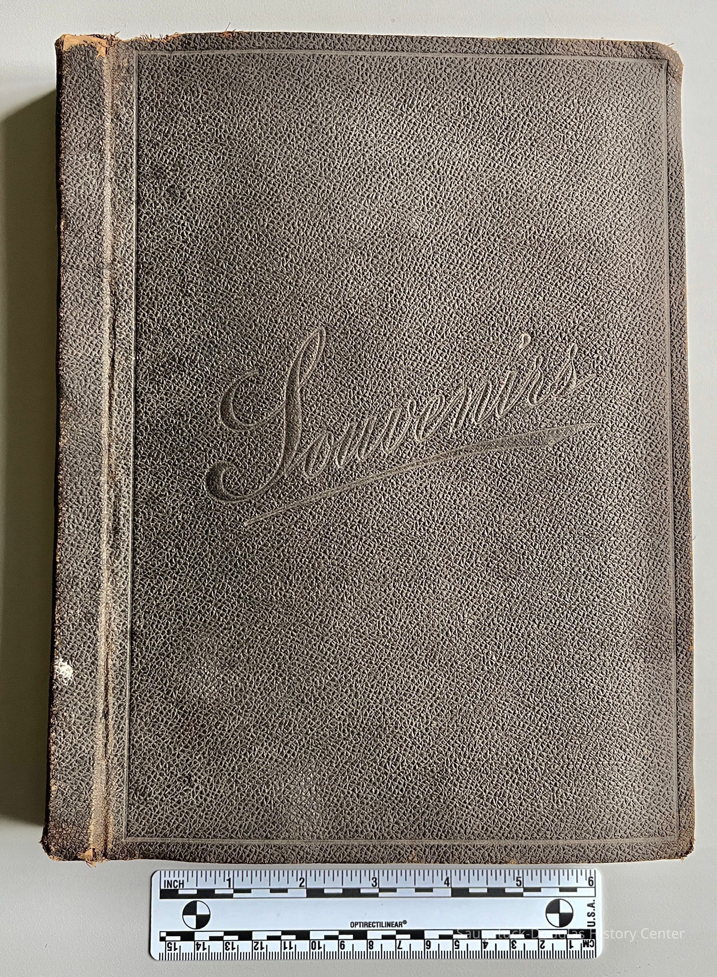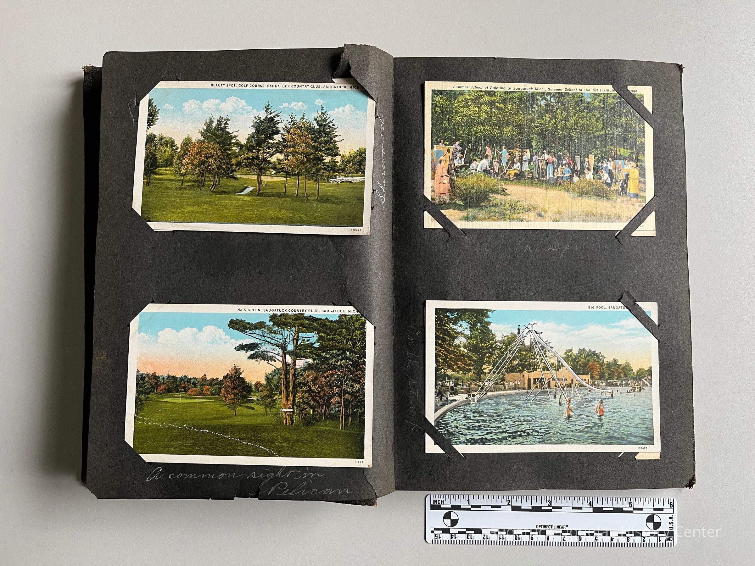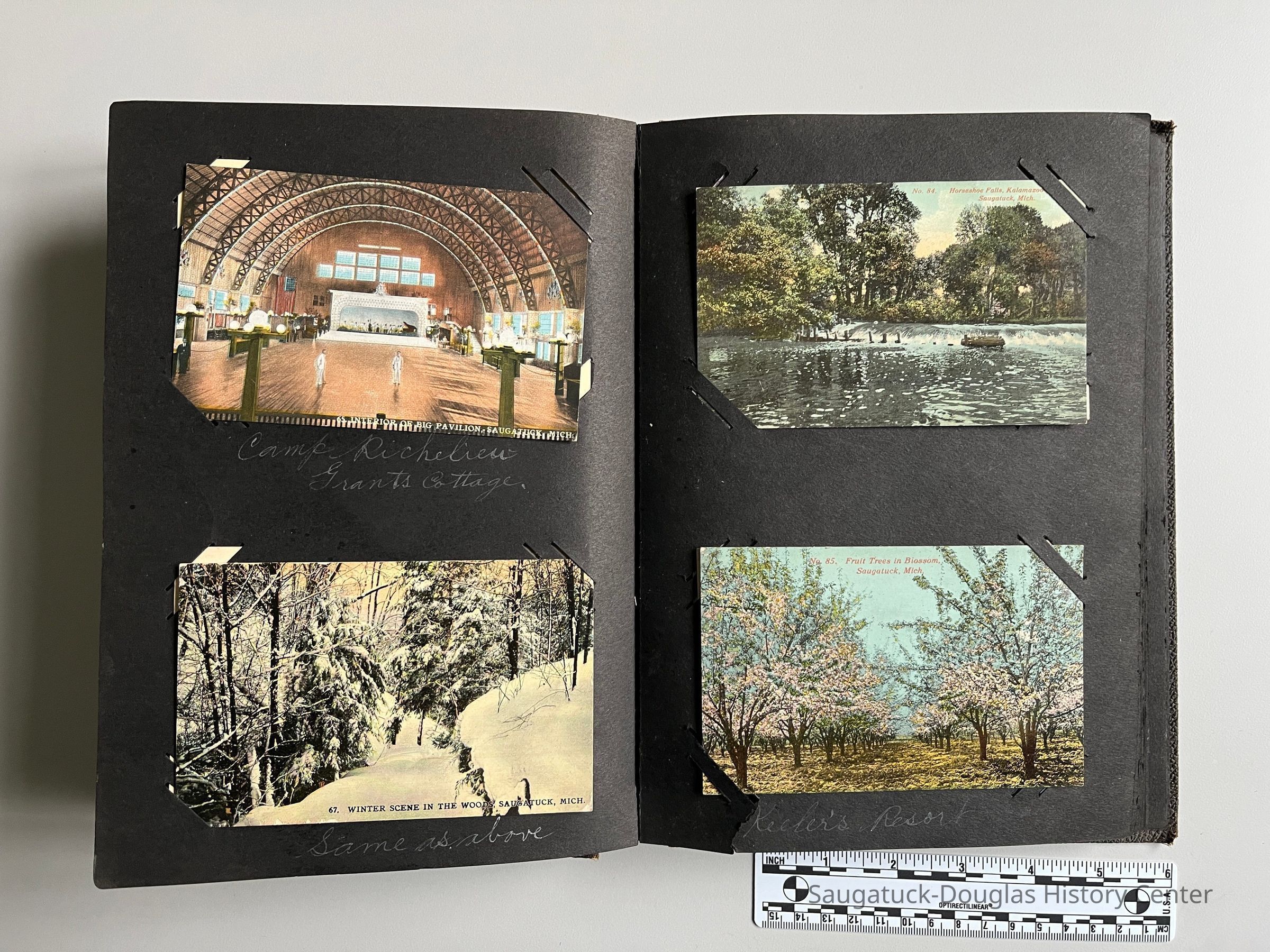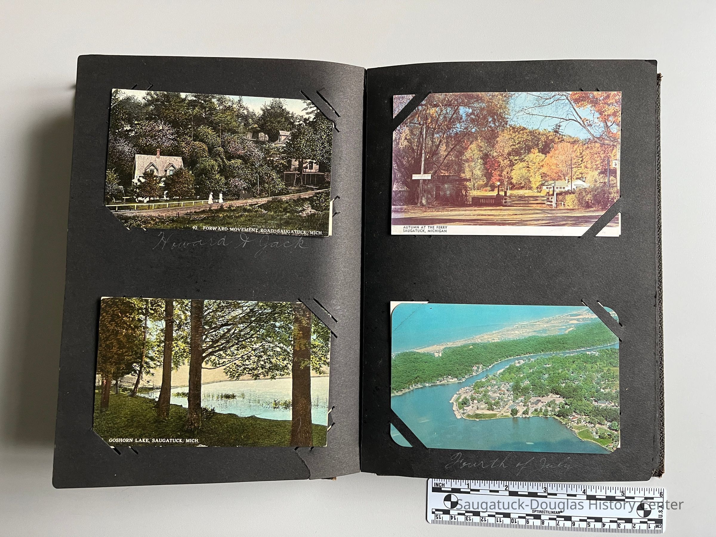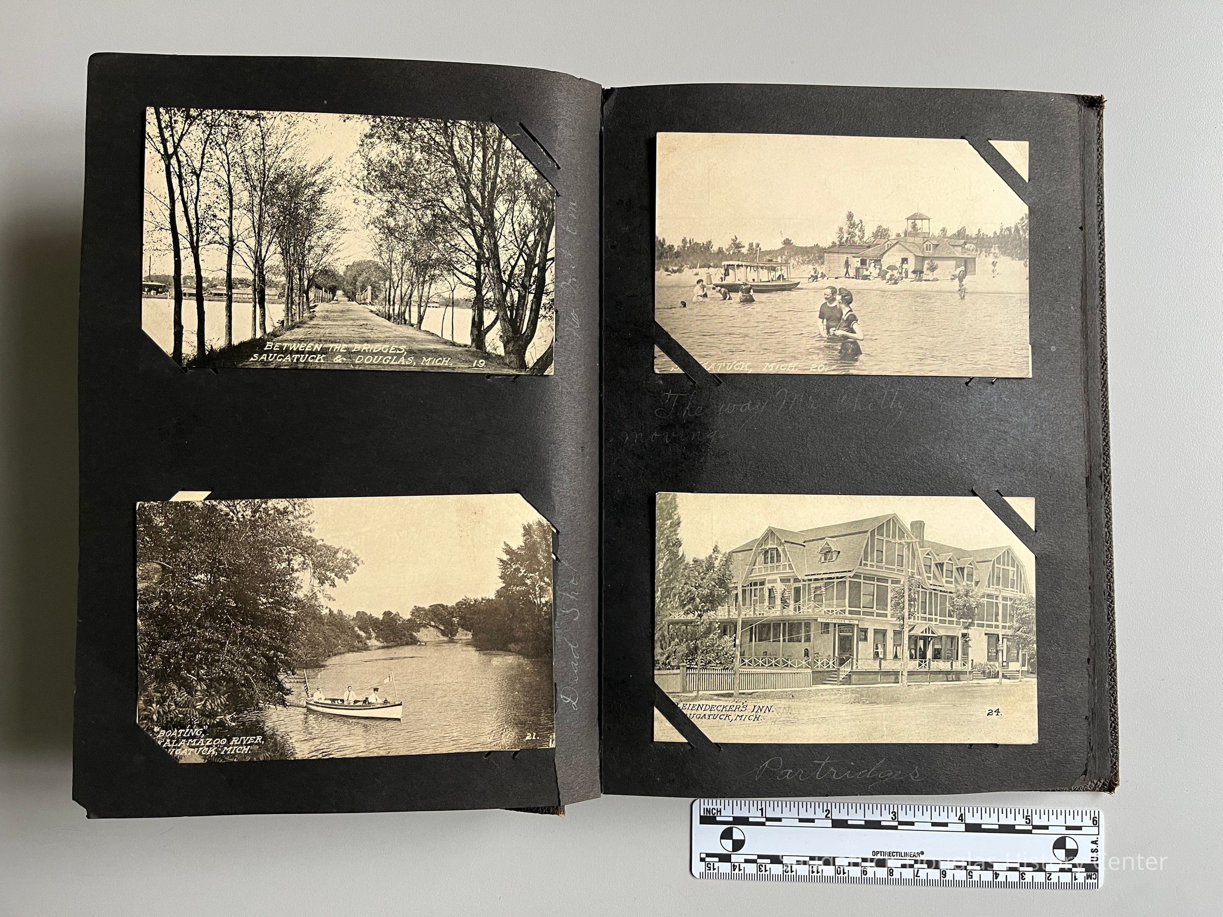 Dark brown photo album with the word "Souvenirs" imprinted on the textured cover. The album was repurposed to house a collection of Saugatuck-area picture postcards but penciled photo captions from the previous occupants remain on the black paper pages.Subject Person/Organization