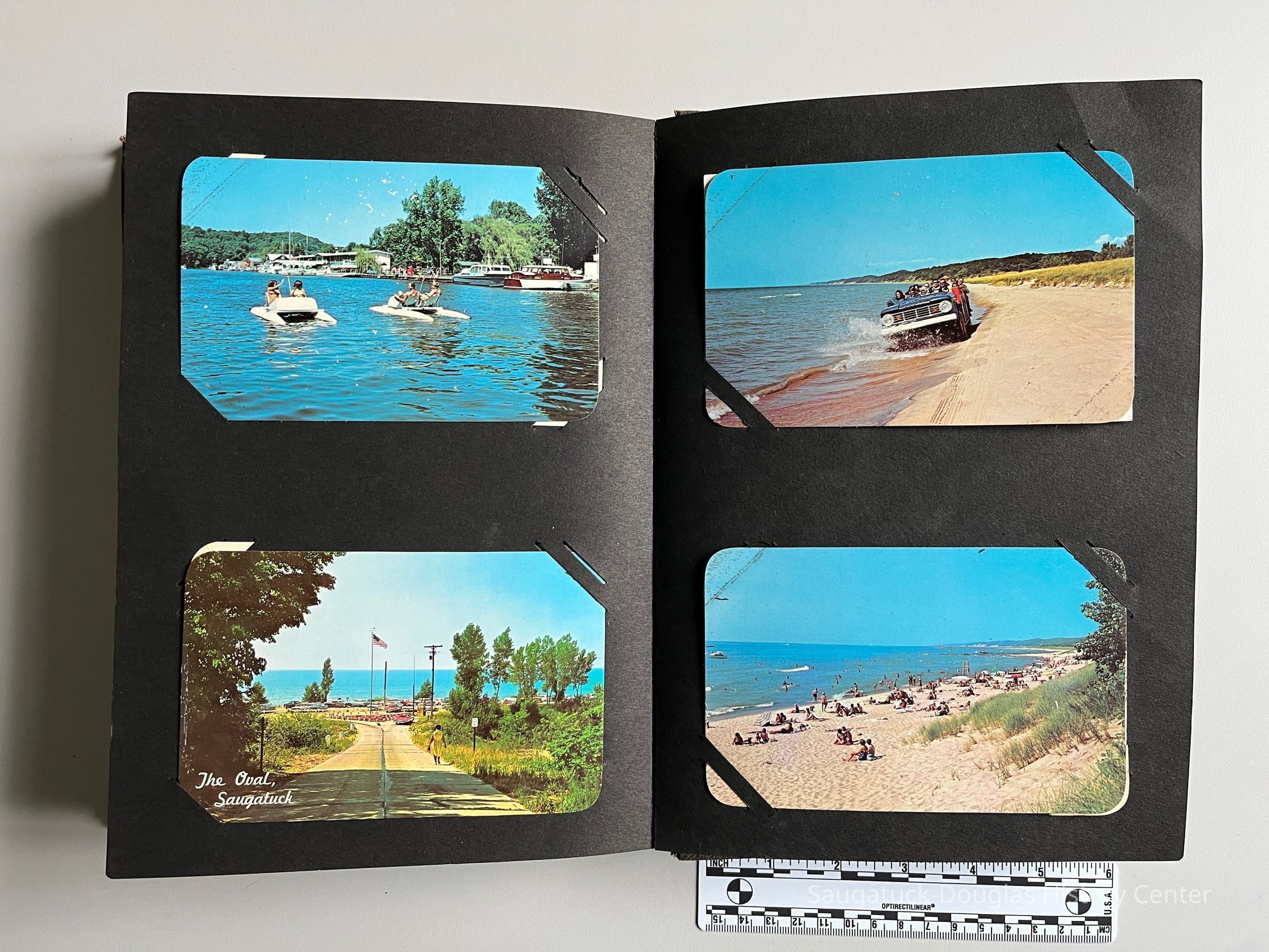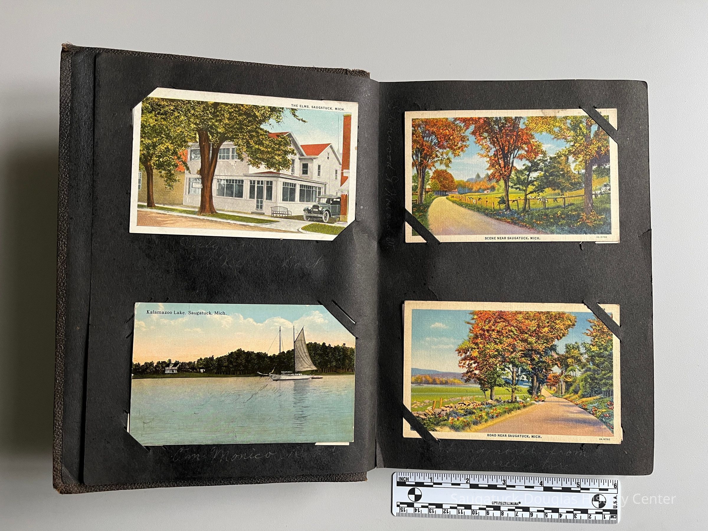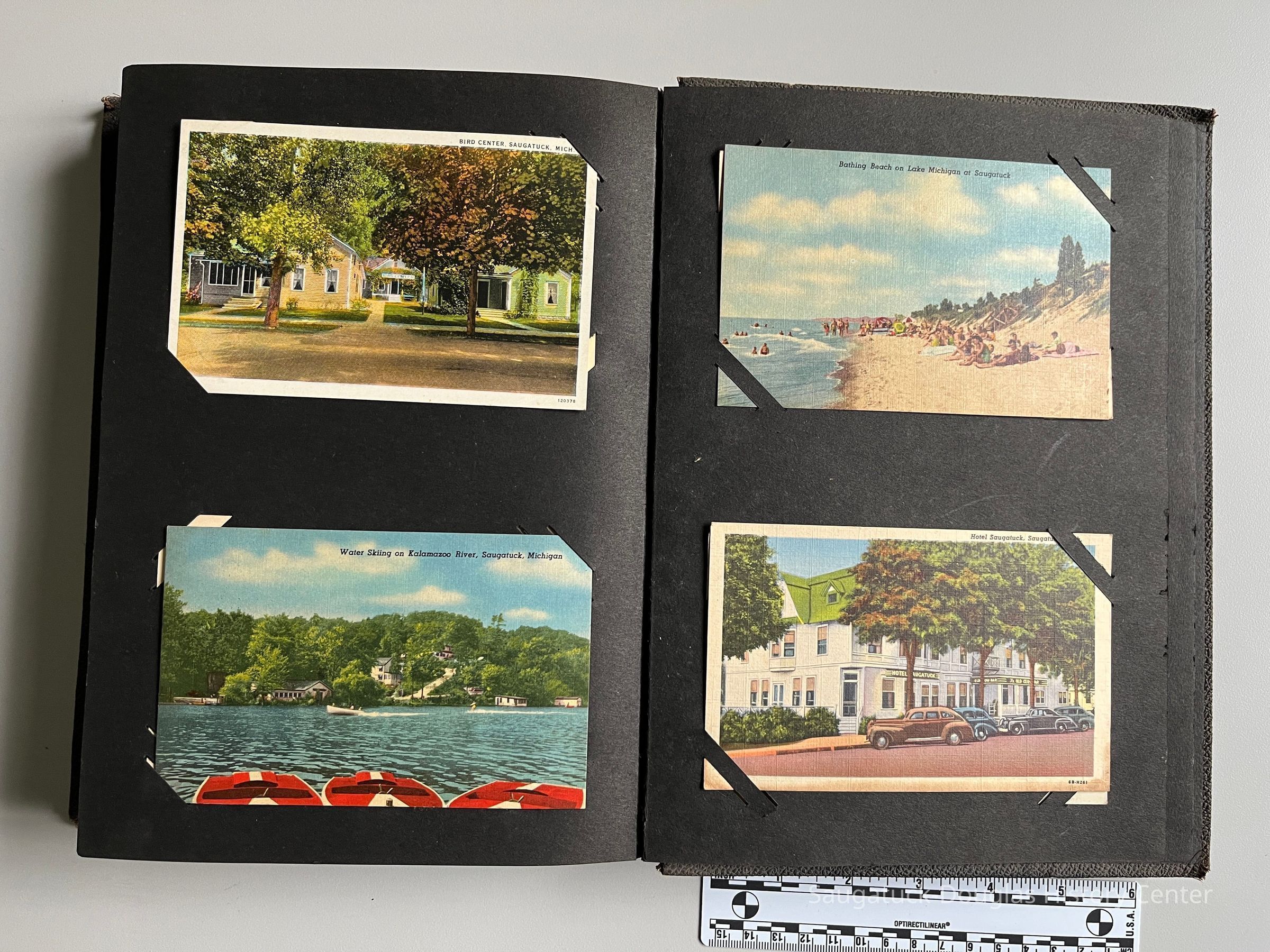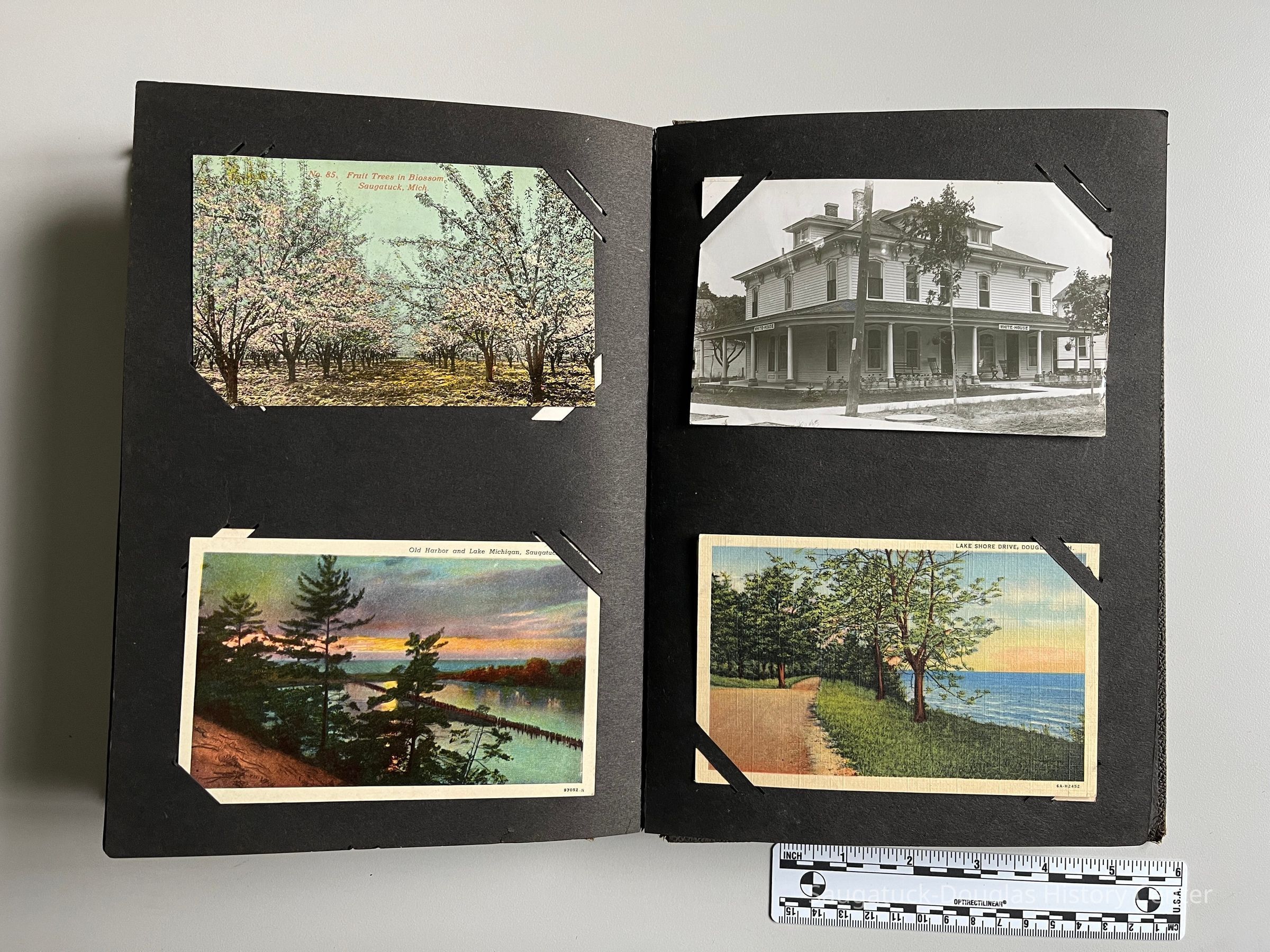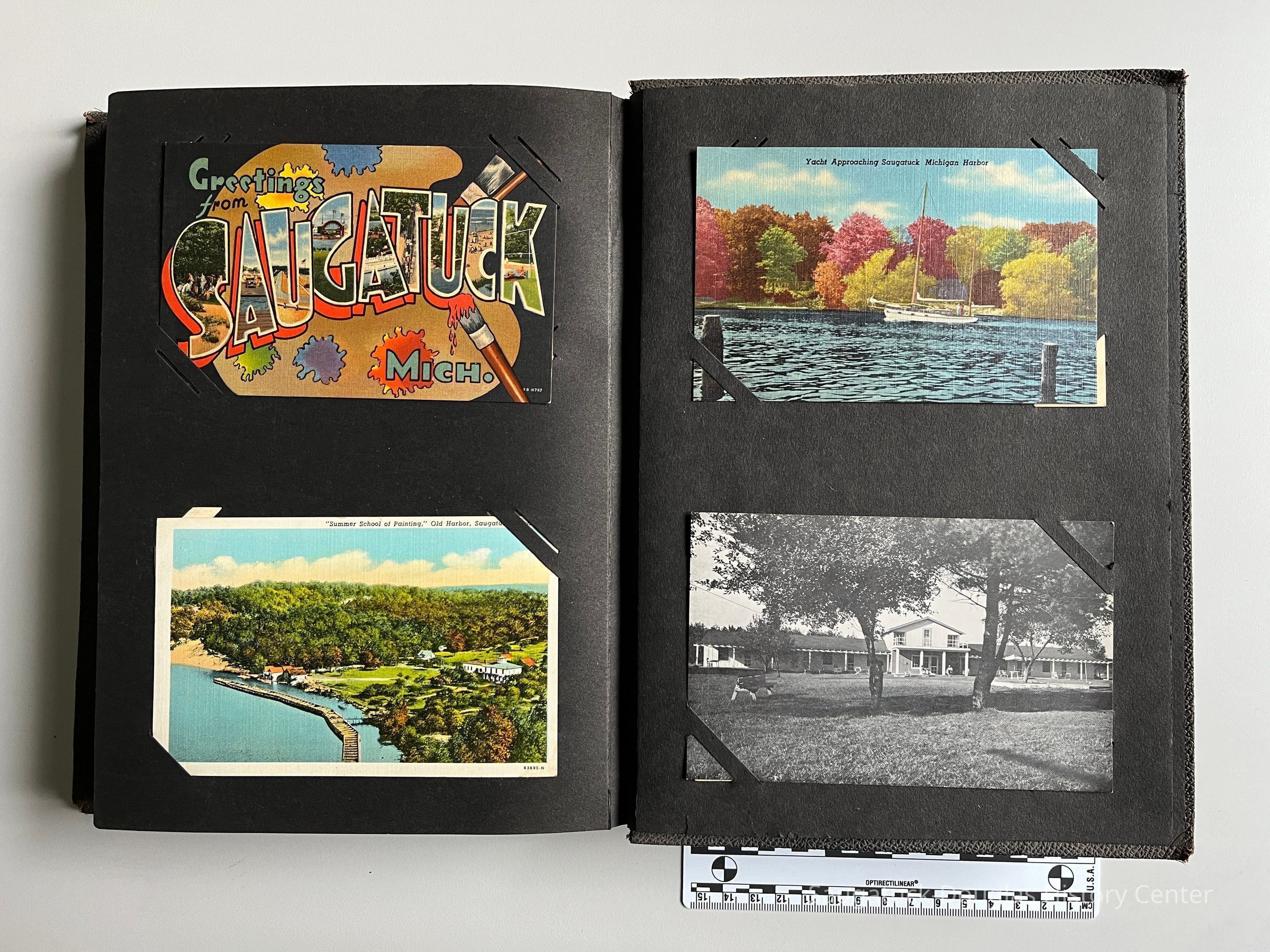 Dark brown photo album with the word "Souvenirs" imprinted on the textured cover. The album was repurposed to house a collection of Saugatuck-area picture postcards but penciled photo captions from the previous occupants remain on the black paper pages.Subject Person/Organization