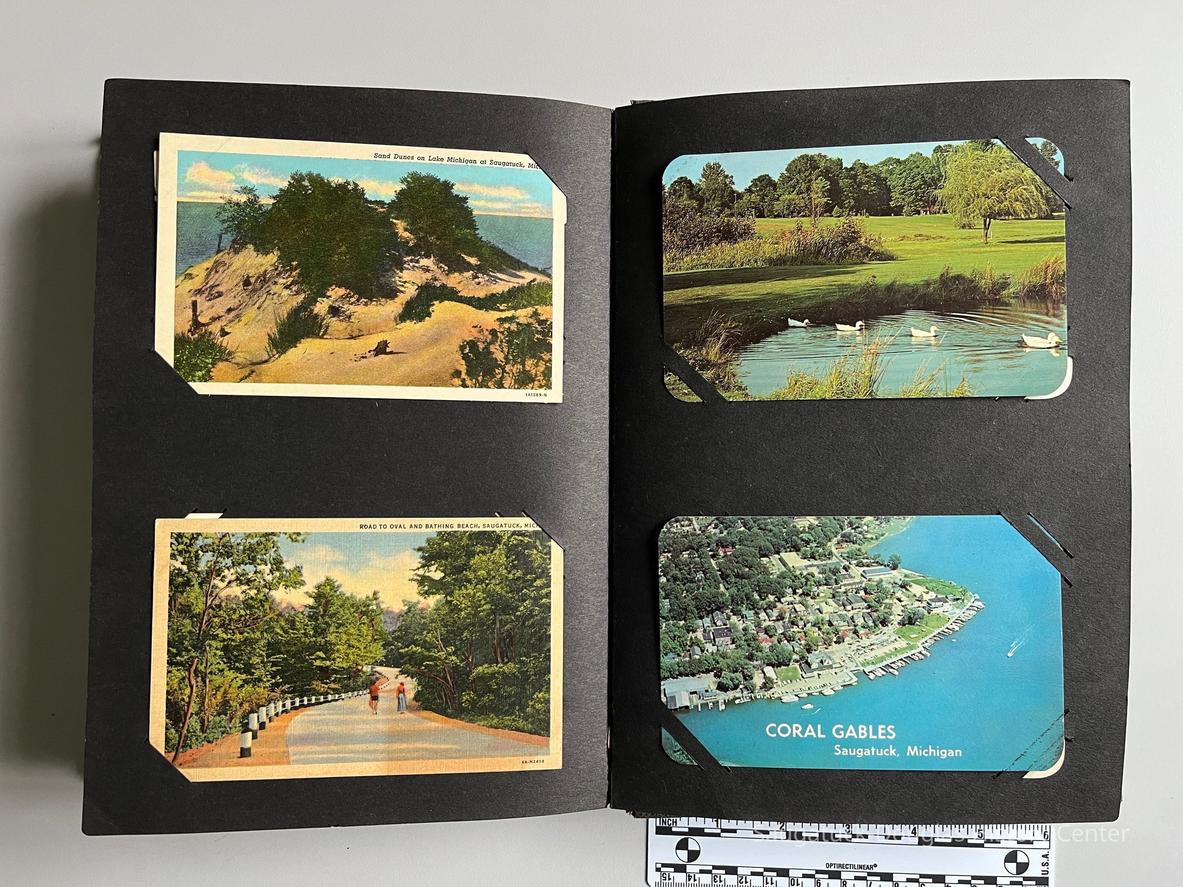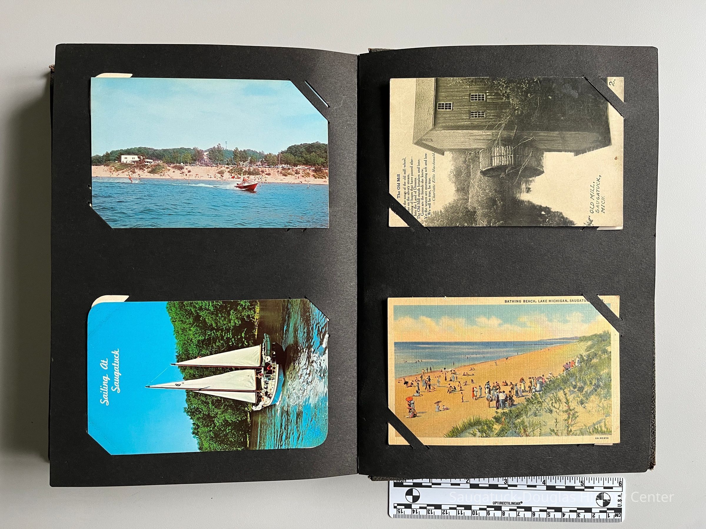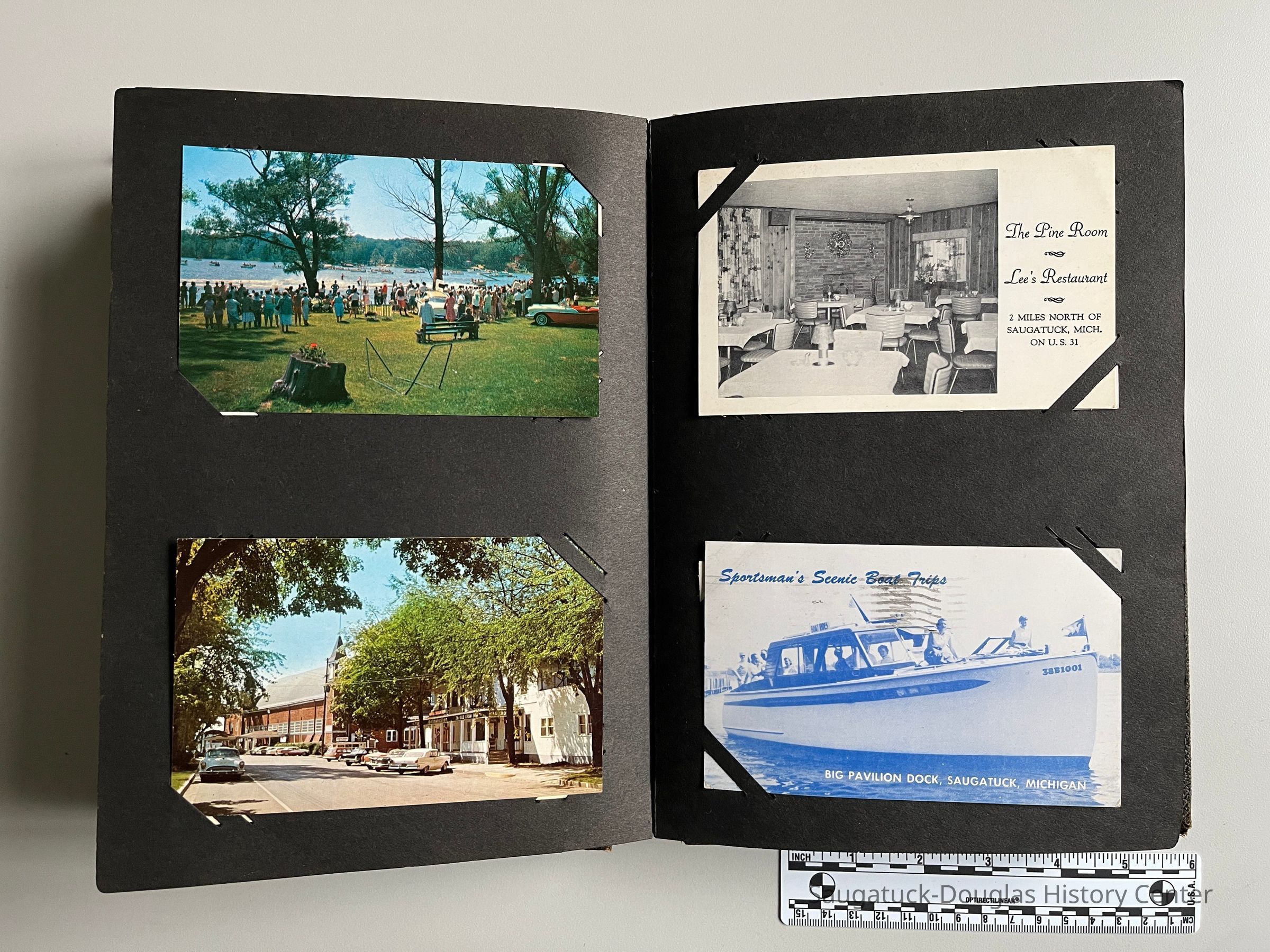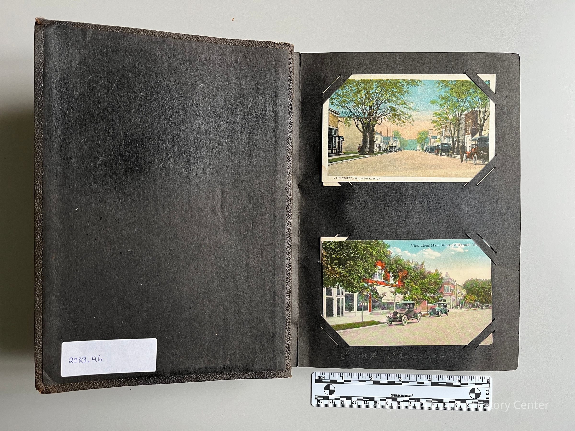 Dark brown photo album with the word "Souvenirs" imprinted on the textured cover. The album was repurposed to house a collection of Saugatuck-area picture postcards but penciled photo captions from the previous occupants remain on the black paper pages.Subject Person/Organization