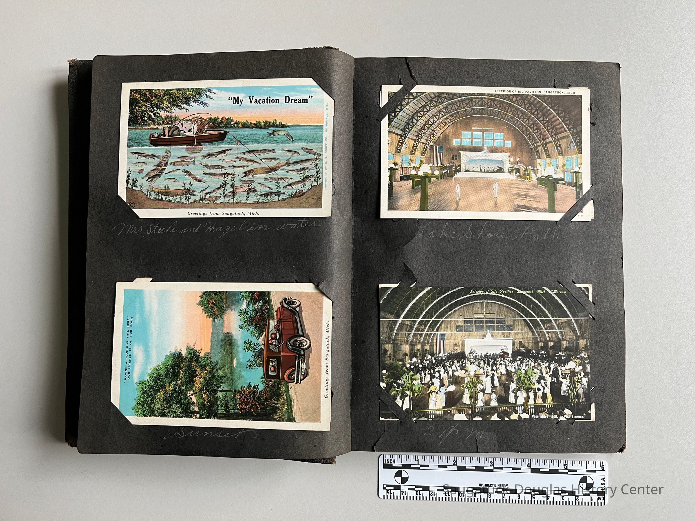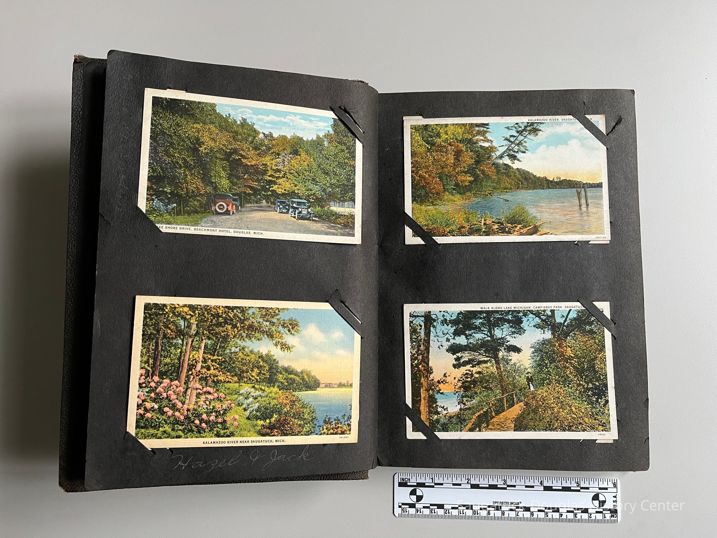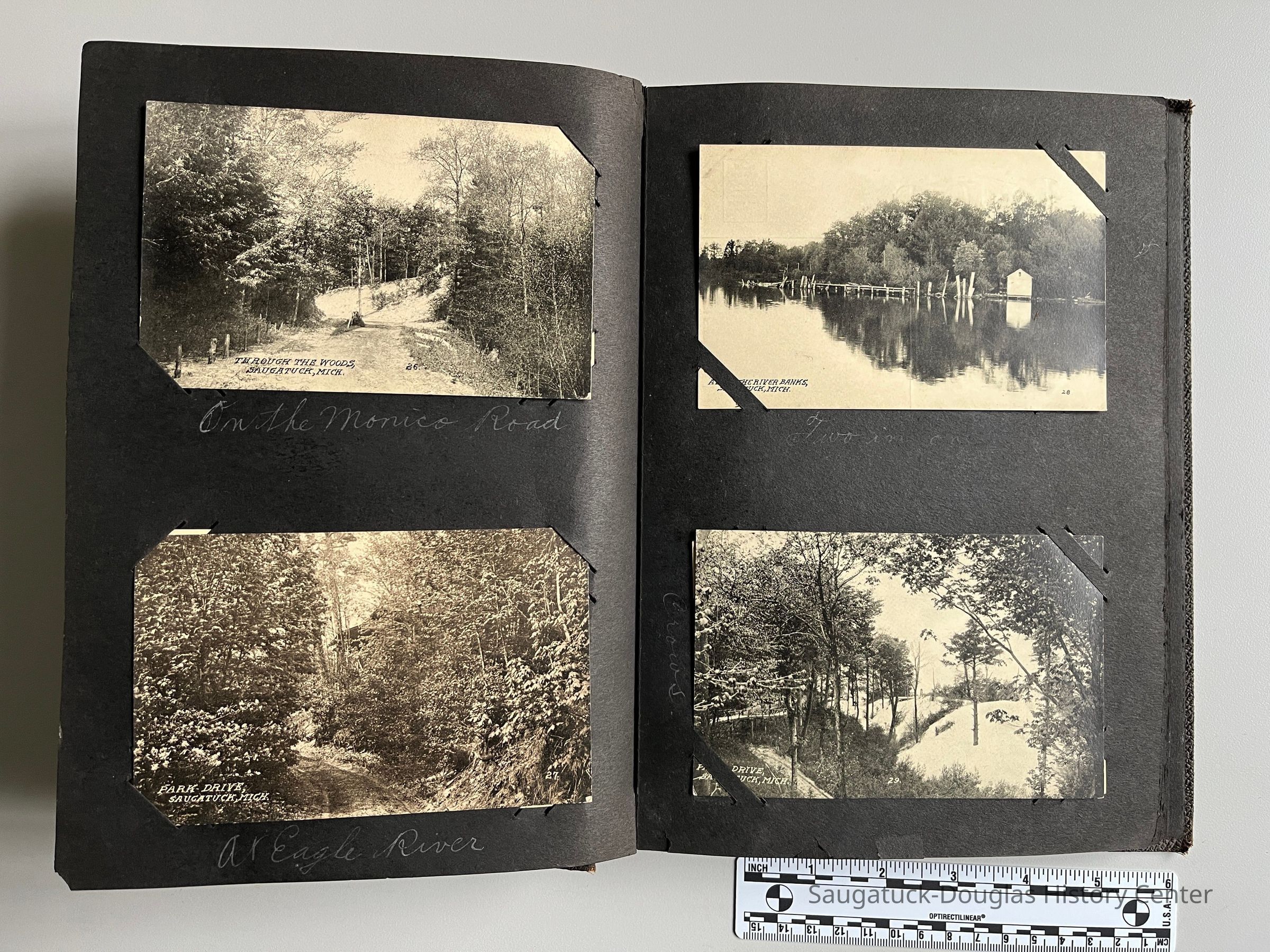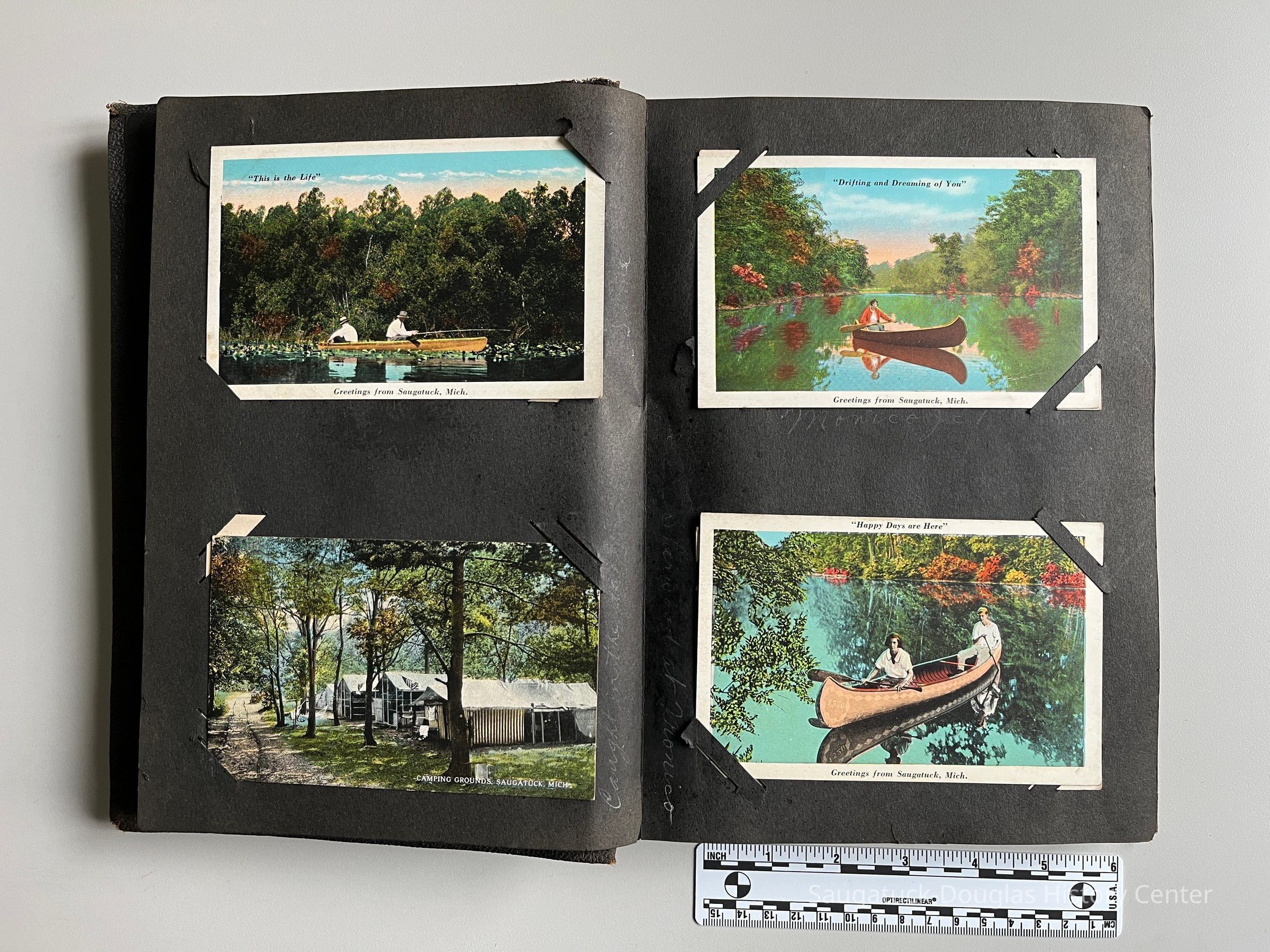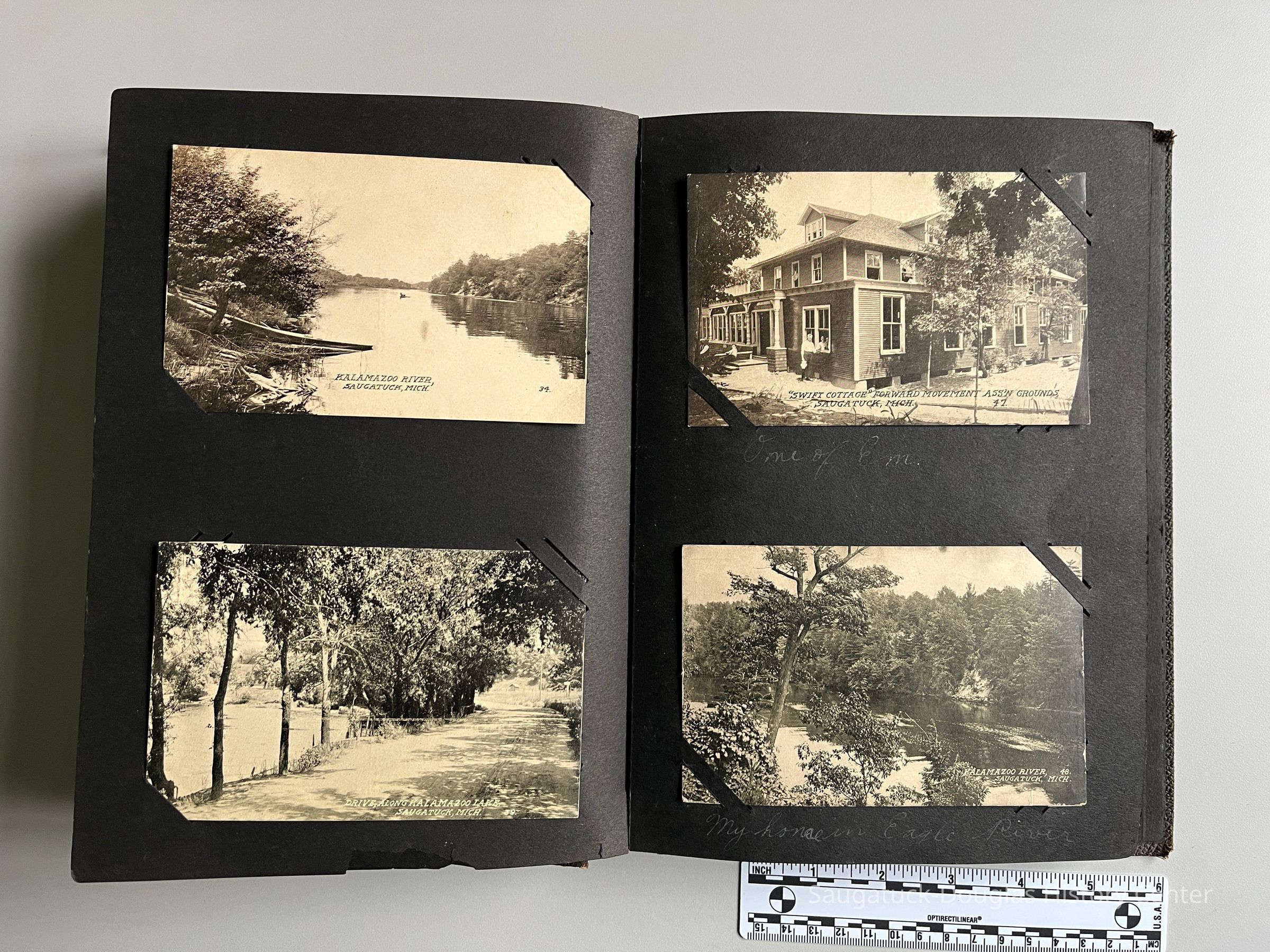 Dark brown photo album with the word "Souvenirs" imprinted on the textured cover. The album was repurposed to house a collection of Saugatuck-area picture postcards but penciled photo captions from the previous occupants remain on the black paper pages.Subject Person/Organization