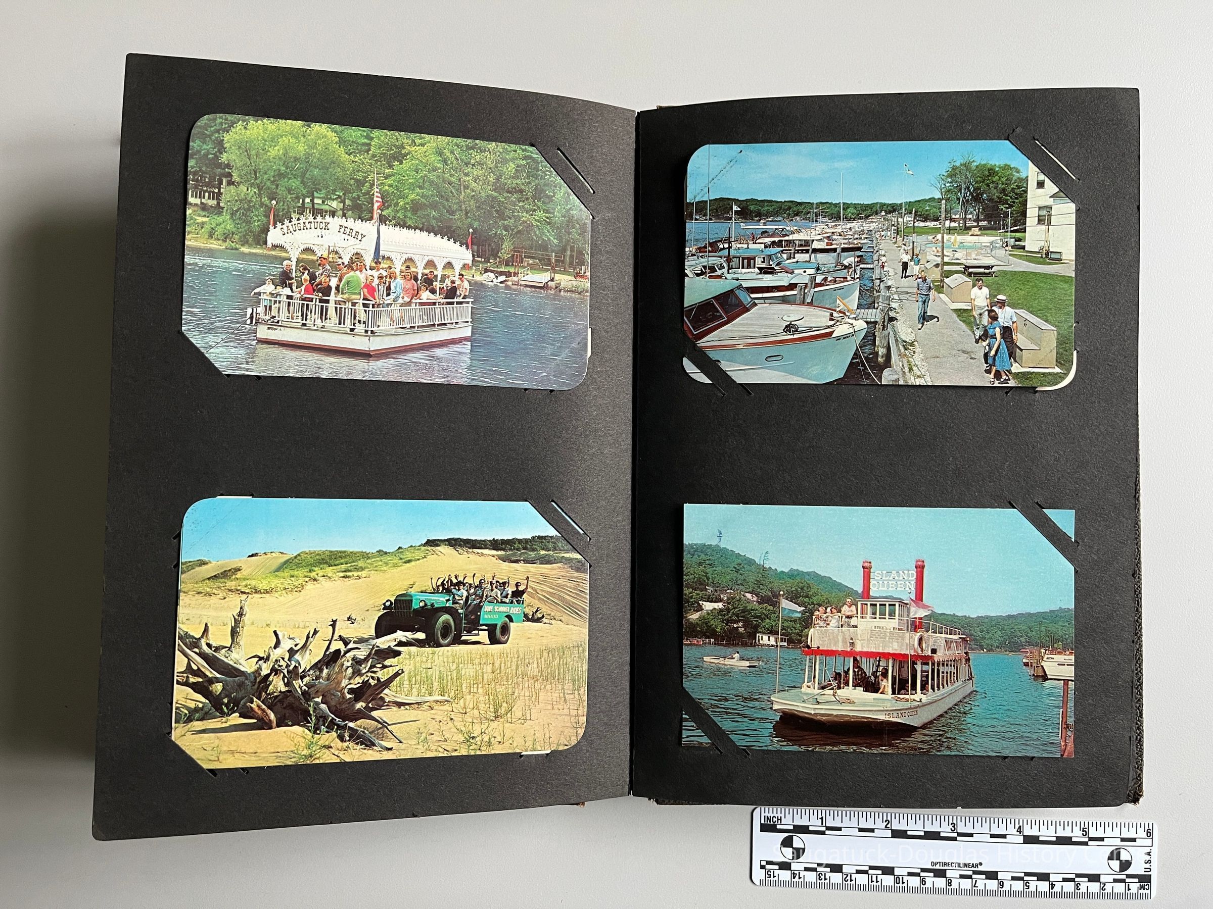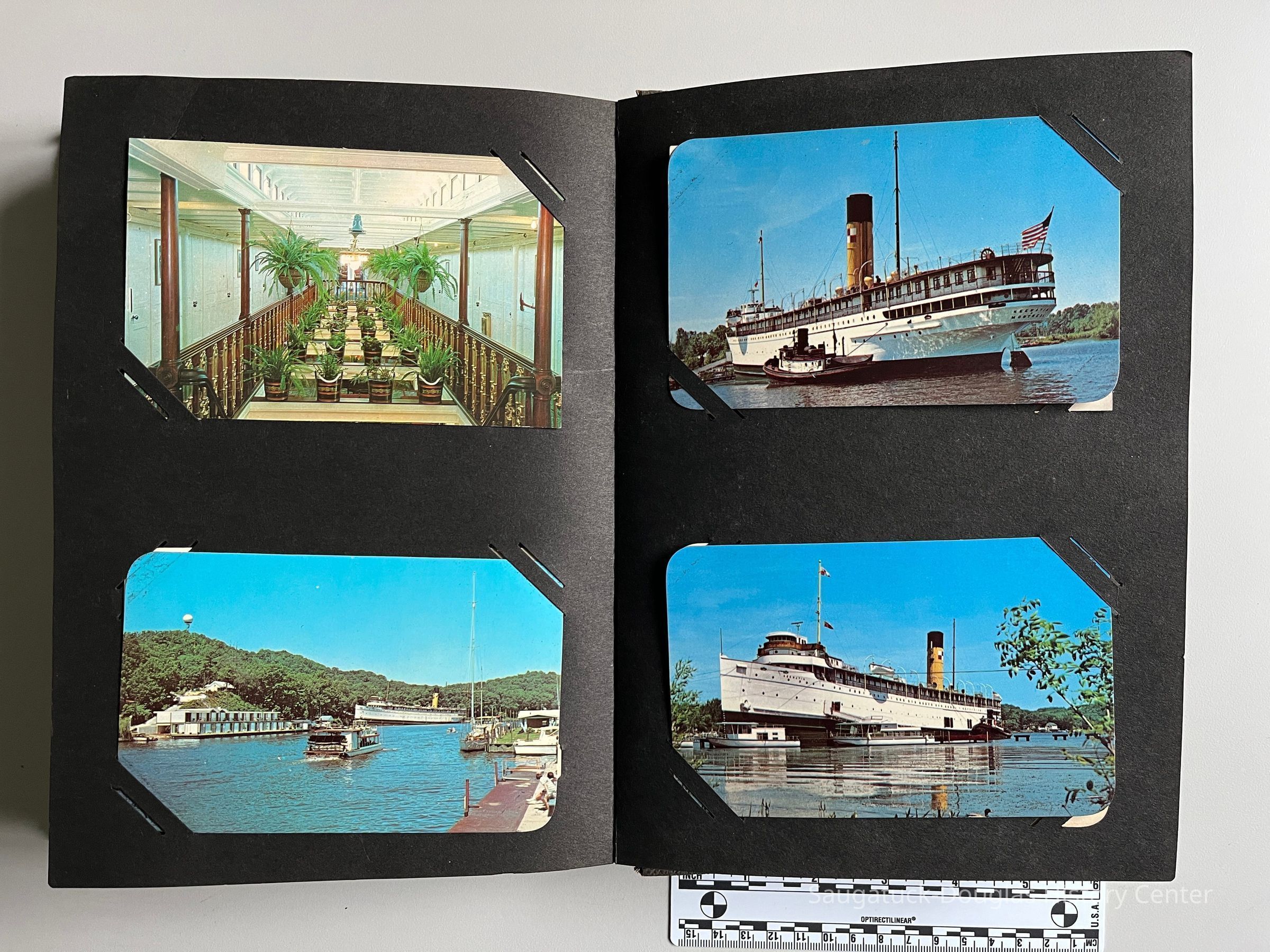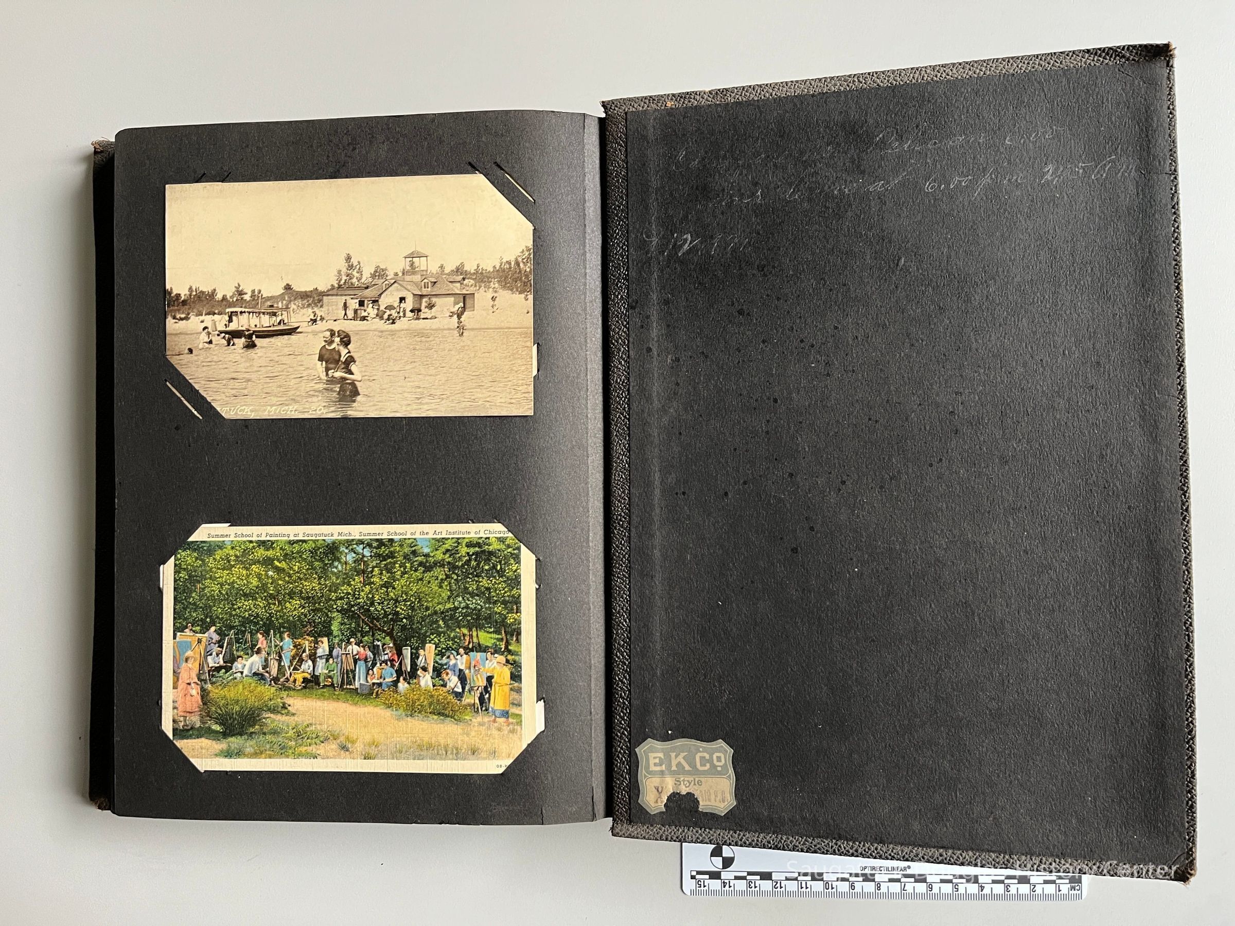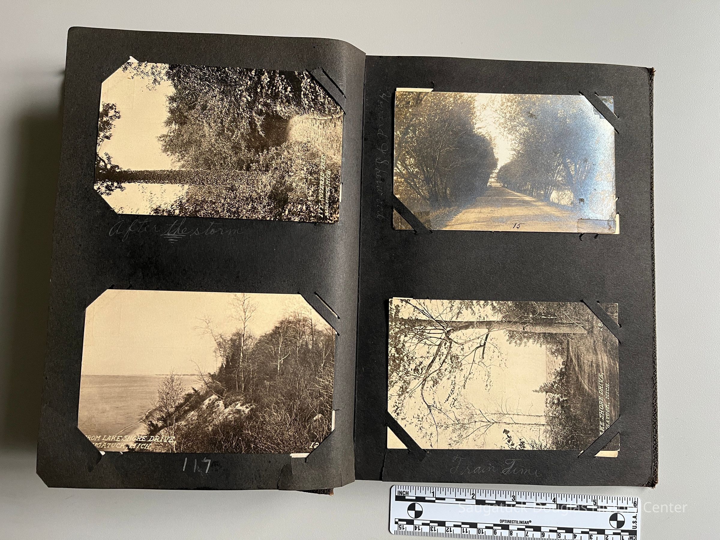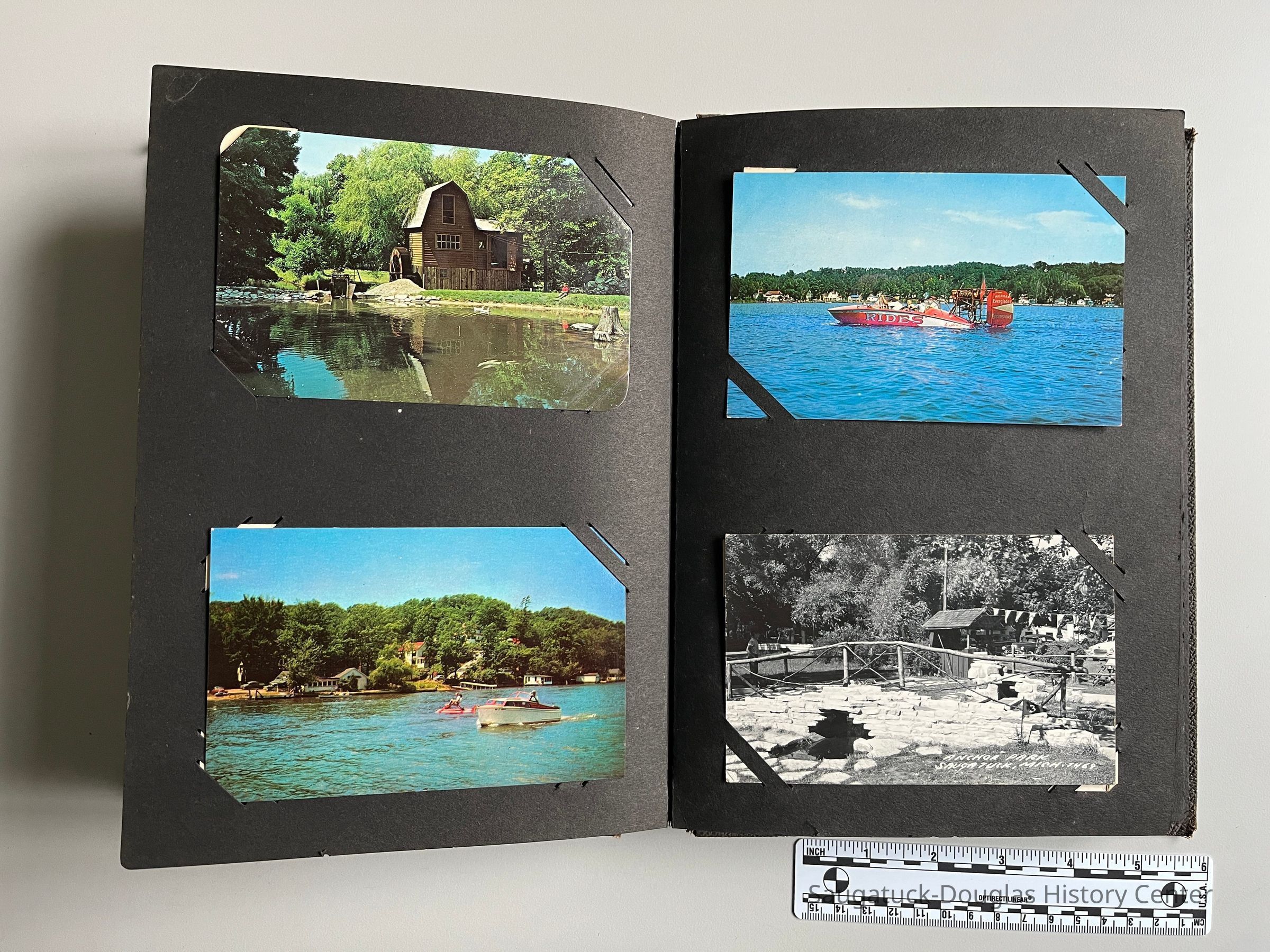 Dark brown photo album with the word "Souvenirs" imprinted on the textured cover. The album was repurposed to house a collection of Saugatuck-area picture postcards but penciled photo captions from the previous occupants remain on the black paper pages.Subject Person/Organization
