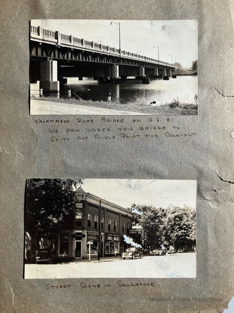Kalamazoo River Bridge on US 31 "We row under this bridge to go to Hot Pickle Point for Cook-out", b/w real photo card.