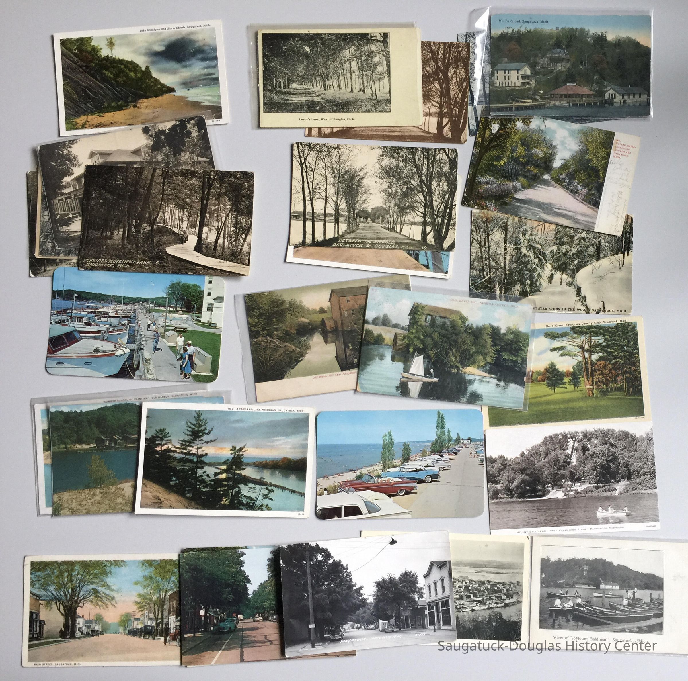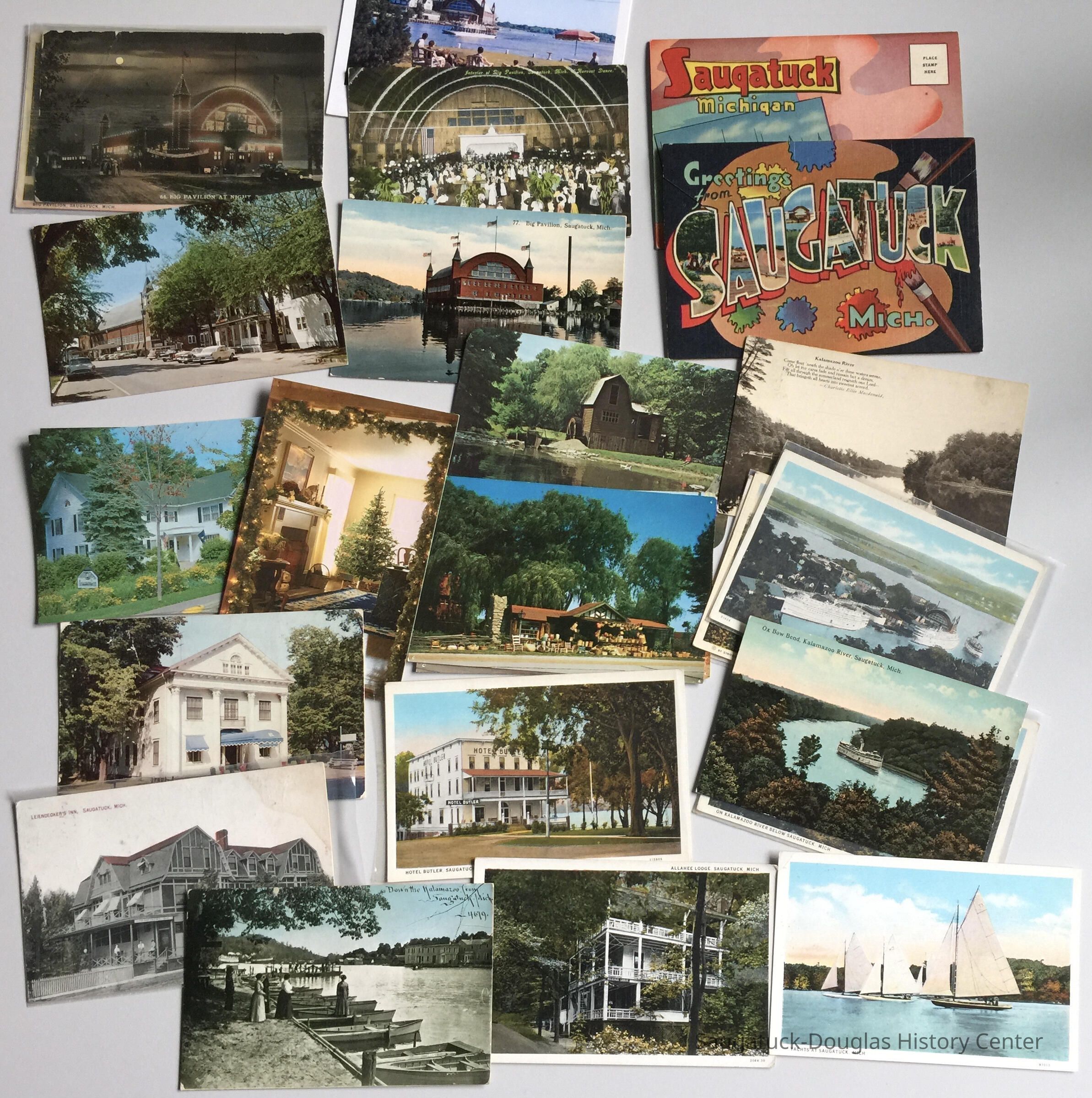 42-postcard collection of Saugatuck and Douglas tourism scenes including Butler Street, Pavilion, steamships, Wickwood Inn, lake, Willow Bend Farm Market, Lover's Lane, between the bridges, Saugatuck country club, oval beach, the boardwalk, ox-bow, forward movement park, Peterson Mill, Hotel Butler, Maplewood Hotel, Pier Cove mill, yachts, Leiendecker's Inn, Allahee Lodge, winter scene