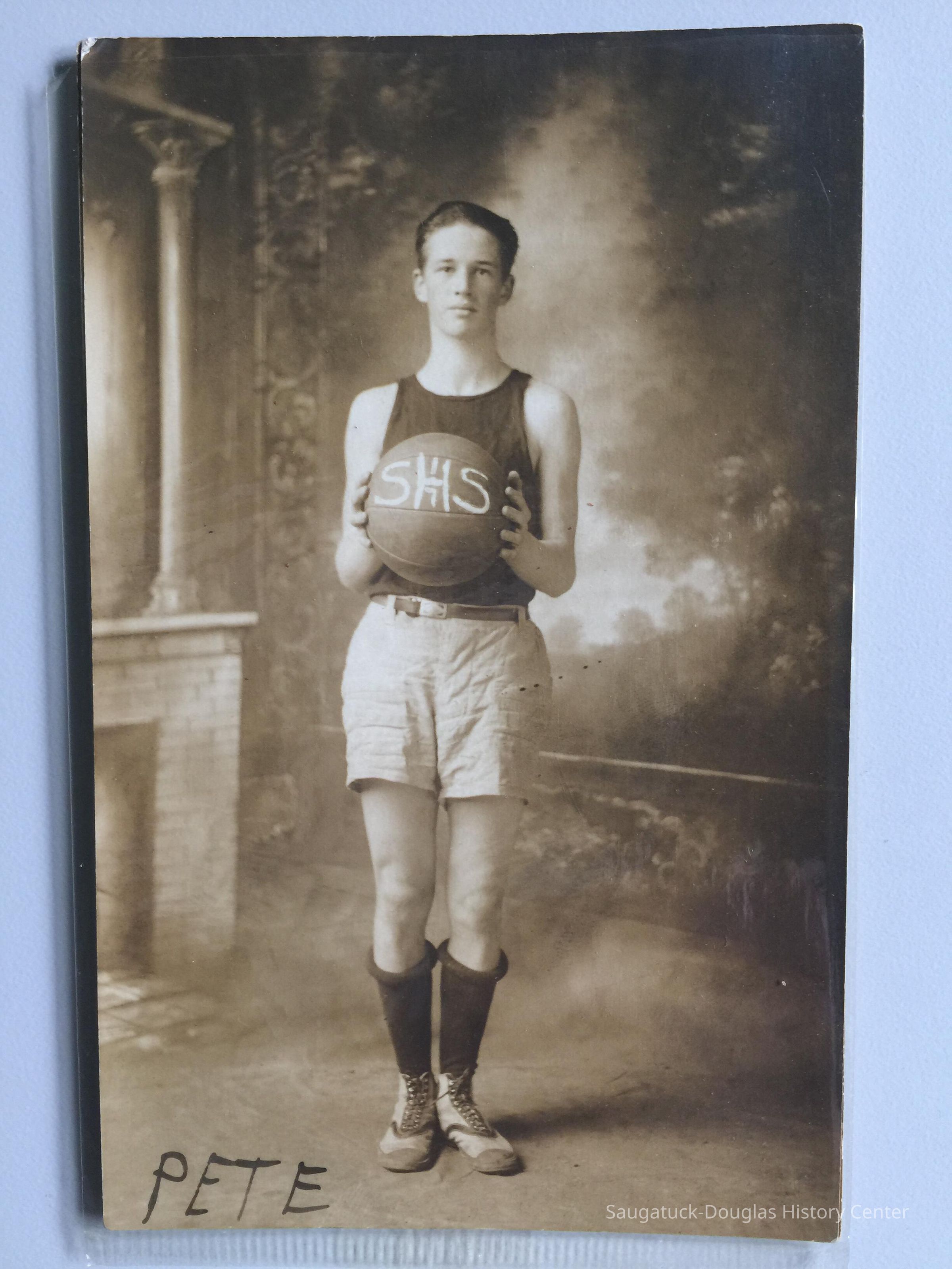 Two real-photo cards of a family at a table and a boy posing with a SHS basketball with PETE written on the bottom corner