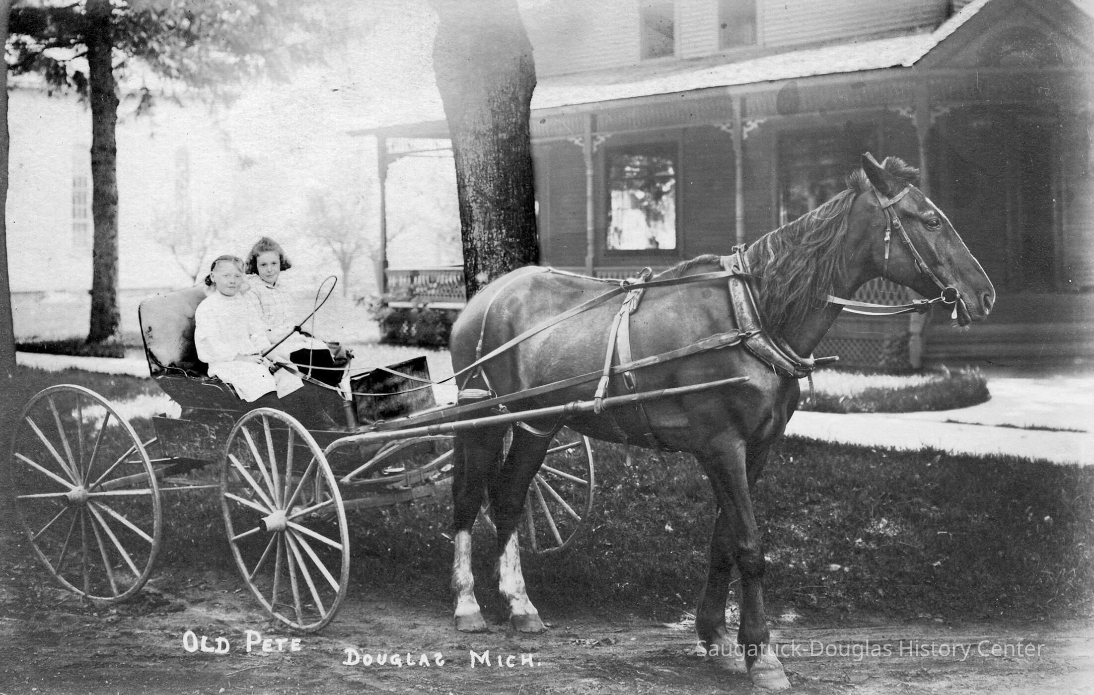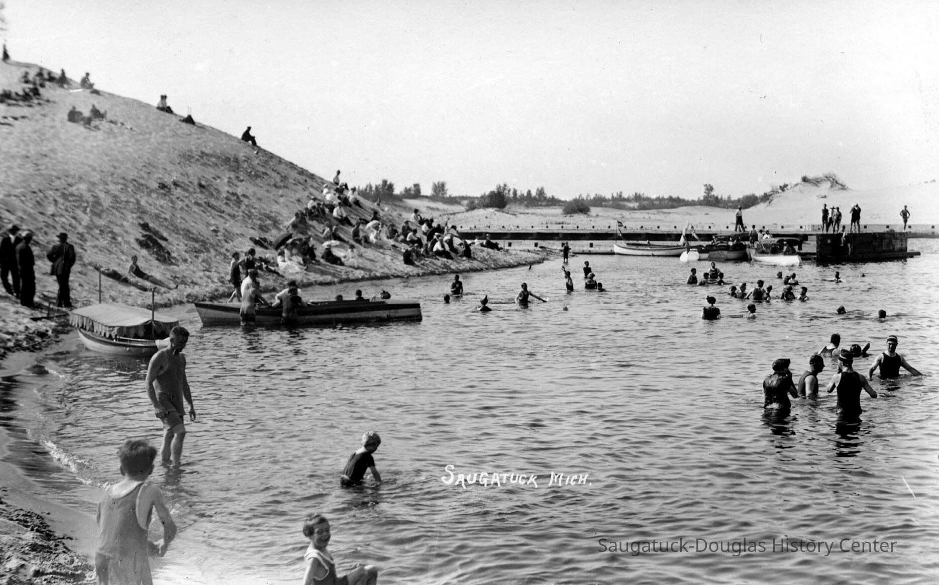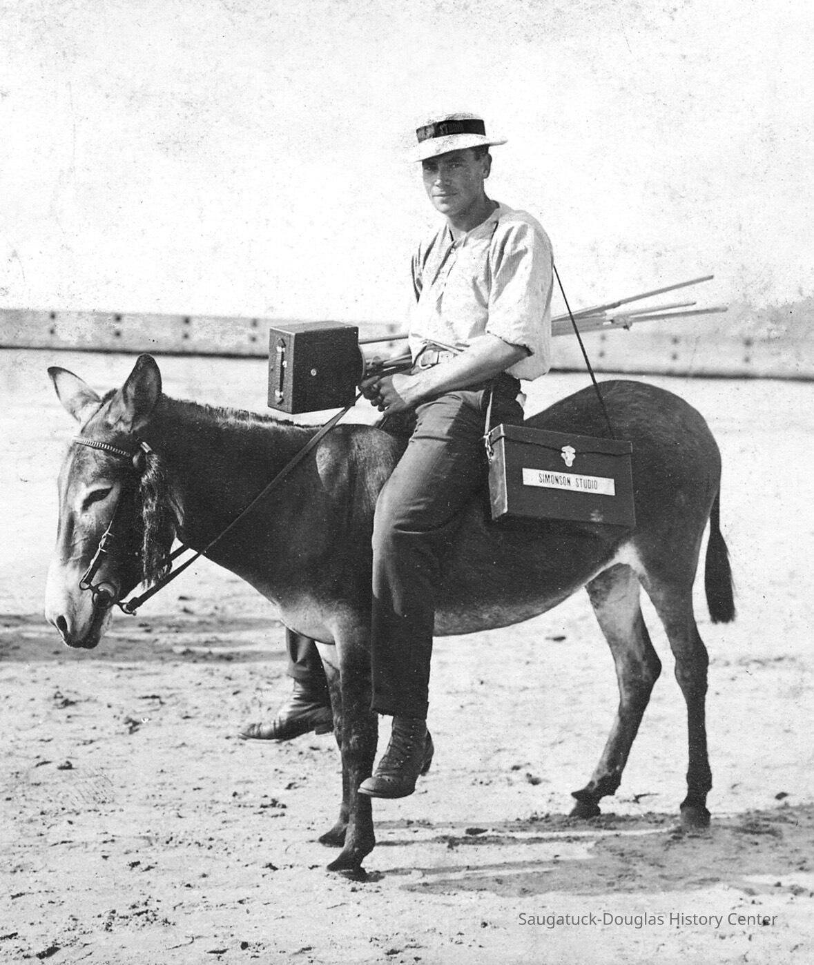 This golden age of postcard publishing from 1898 to 1920 coincided with a boom in Saugatuck tourism. About 1907 Herman Simonson saw an opportunity to make his photo hobby his business and was quick to grab the brass ring. Herman had an eye for the kind of photo that made a great postcard. Saugatuck was the place that had it all, including visitors with money to spend. There were plenty of Chicagoans who wanted to remind the folks back home of the good times on the beach, at the Big Pavilion, climbing Mt. Baldhead, camping along the river, boating--what a wonderful vacation they were having! Simonson embellished the interesting scene with any natural prop that came along. His innovations included his employee-Dynamite the donkey- fancy new touring cars, a ferry full of ladies, crowds streaming off a steamer into the brightest spot on the Great Lakes!
