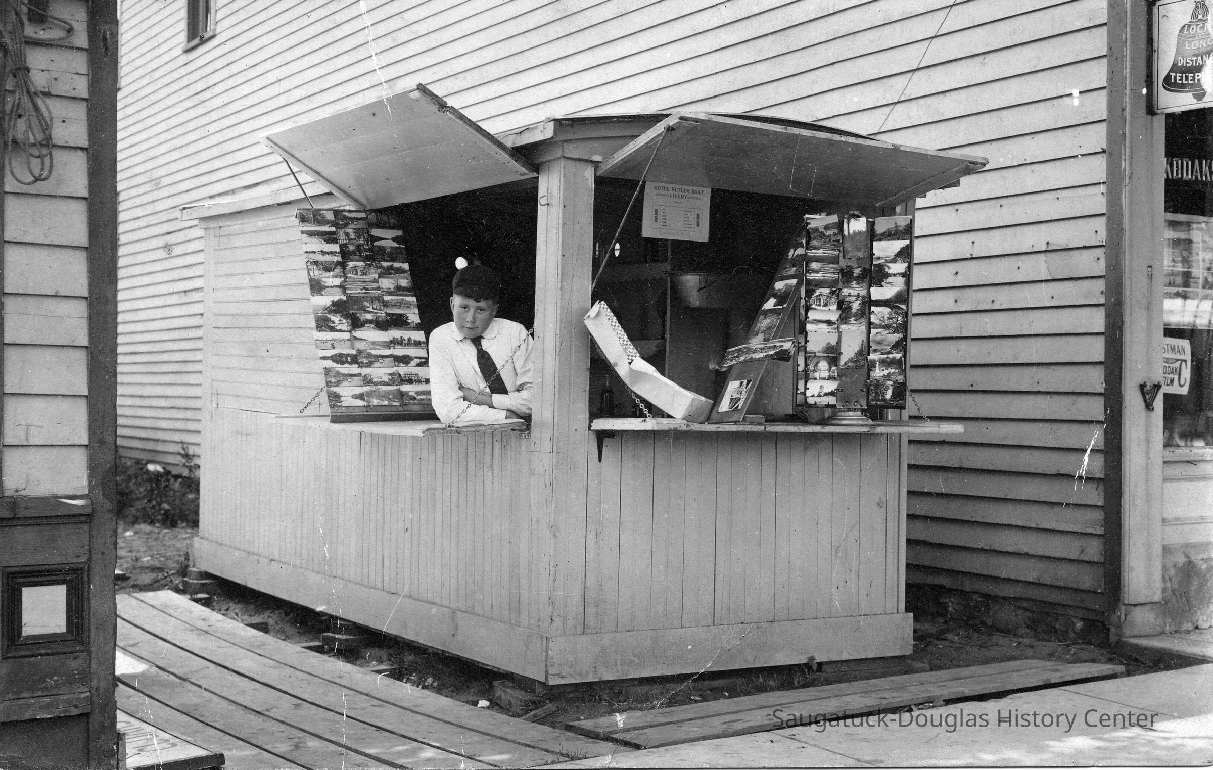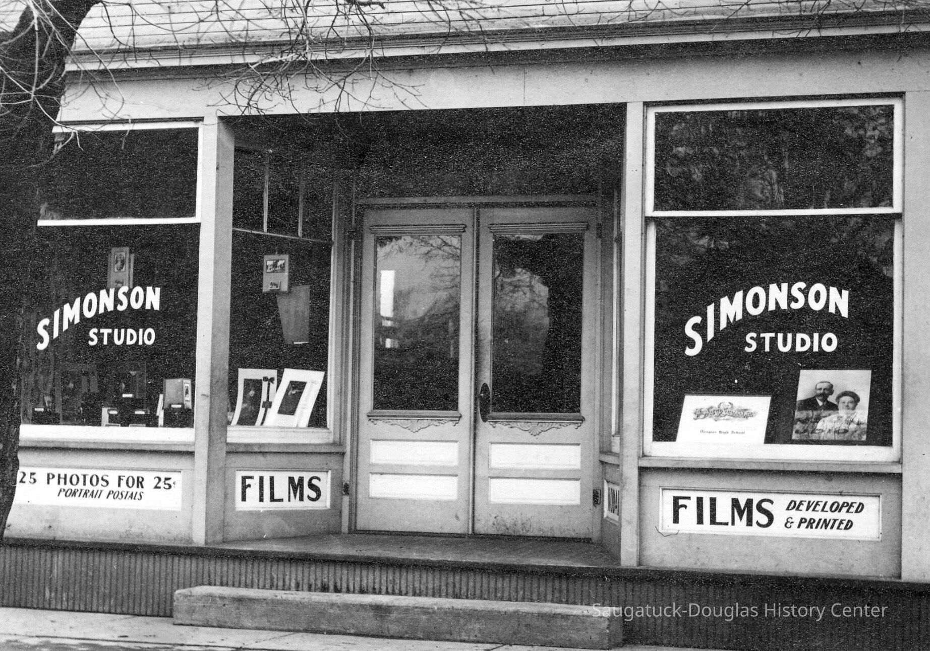 Operating from his shop-studio on Culver Street (now site of the Loaf and Mug) and a smaller shop on Water Street near the ferry landing he and assistants took thousands of photographs. Their greatest contribution to the record of our history was the production of “real photo” postcards taken between 1907 and 1920. These were imaged on a large glass plate or later on film and provided a sharp postcard sized photograph for the front of the card. The back of the card was divided for the address and the message. Simonson or one of his assistants would take a photo (at the scene of the action), develop the negative overnight, print it with duplicates on heavy postcard sized photo paper and deliver the order the next day. In addition to custom order, good shot postcards were sold to the public.