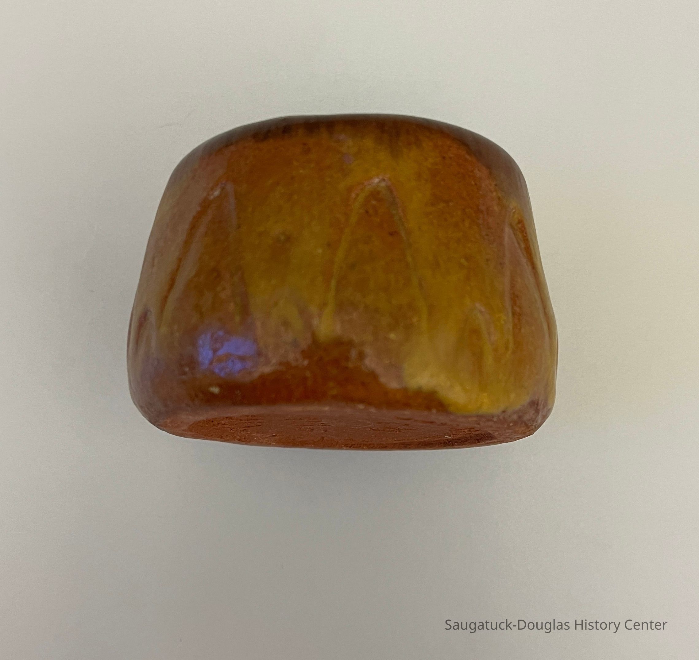Hand-built pot made of orange terracotta clay. The pot is finished with brown and dark yellow glazes. The pot has raised areas that flow downward from the rim.