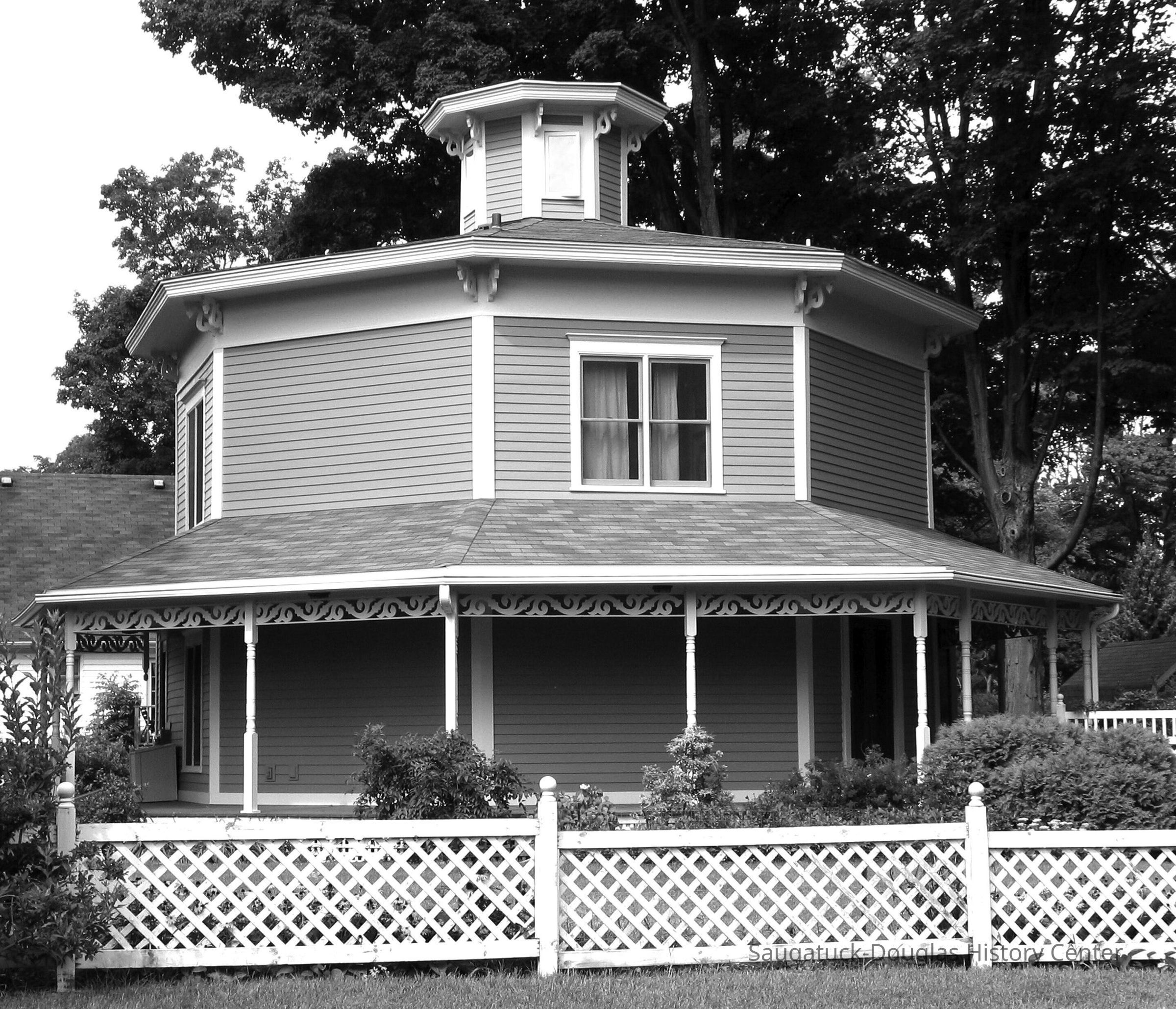 On the other side of Douglas village—where people of greater means moved to be away from the noise and low-life of the mill, a rather radical house was built: the Octagon House. The owner was an enterprising boat captain and the architect was a New Yorker by the name of Orson Fowler. We say “radical house” because this is what Fowler proposed: a ‘modern’ plan which replaced the traditional room-connected-to room layout with an open-plan layout whereby the main rooms were open to one another, with an efficient kitchen, “air-conditioning” (via the porches/cupola), wide wrap-around porches, a separate room for children—and a new fangled thing called “clothes closets.”