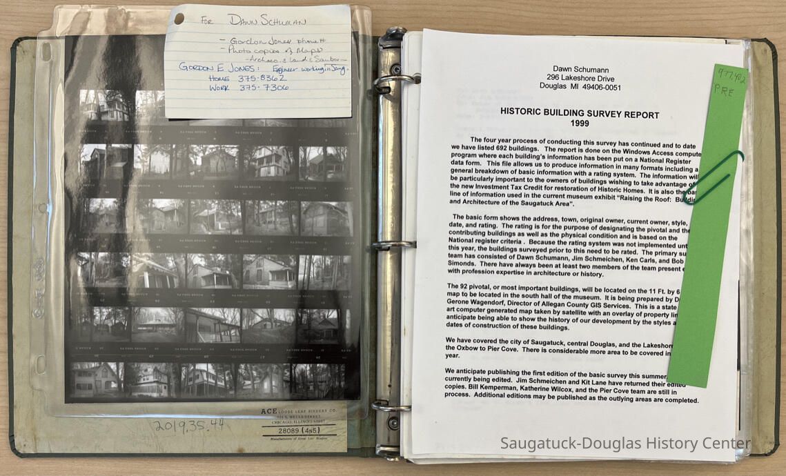 Green three ring binder Belonged to Dawn Schumann, circa 1997. Includes notations, survey printout, maps, photos, and original slides of houses circa 1997Context