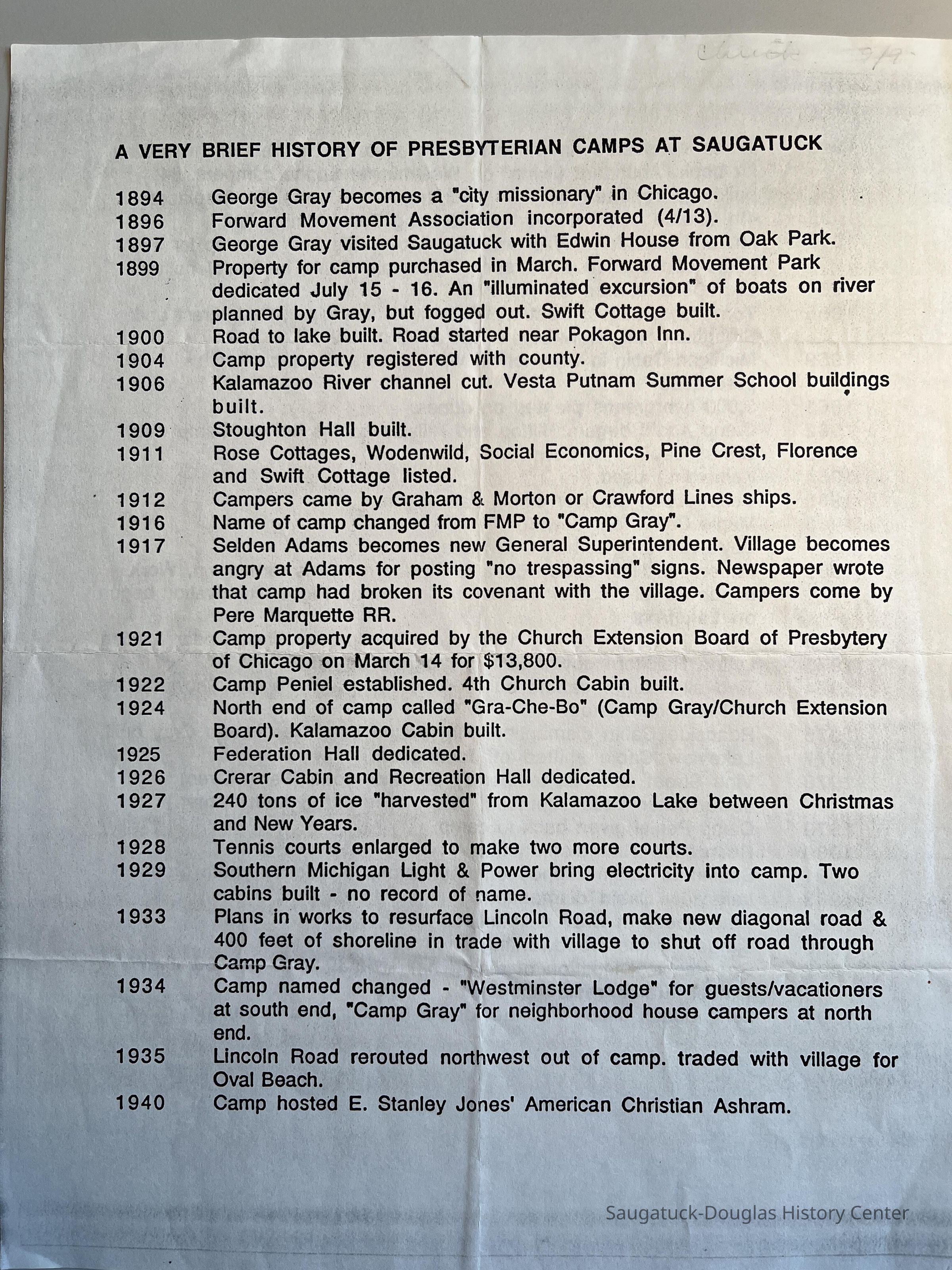 A VERY BRIEF HISTORY OF PRESBYTERIAN CAMPS AT SAUGATUCK