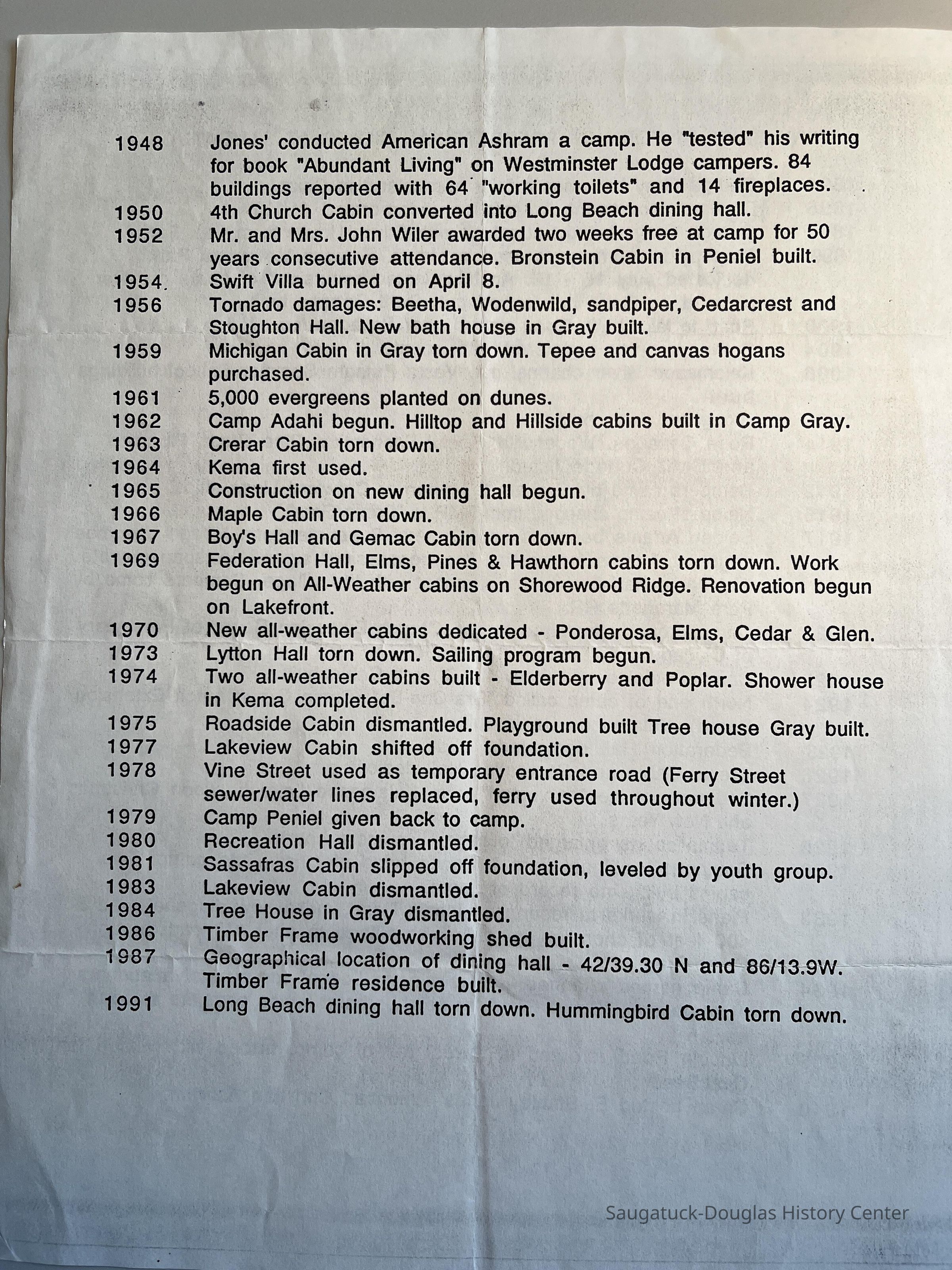 1969 Federation Hall, Elms, Pines & Hawthorn cabins torn down. Work begun on All-Weather cabins on Shorewood Ridge. Renovation begun on Lakefront.