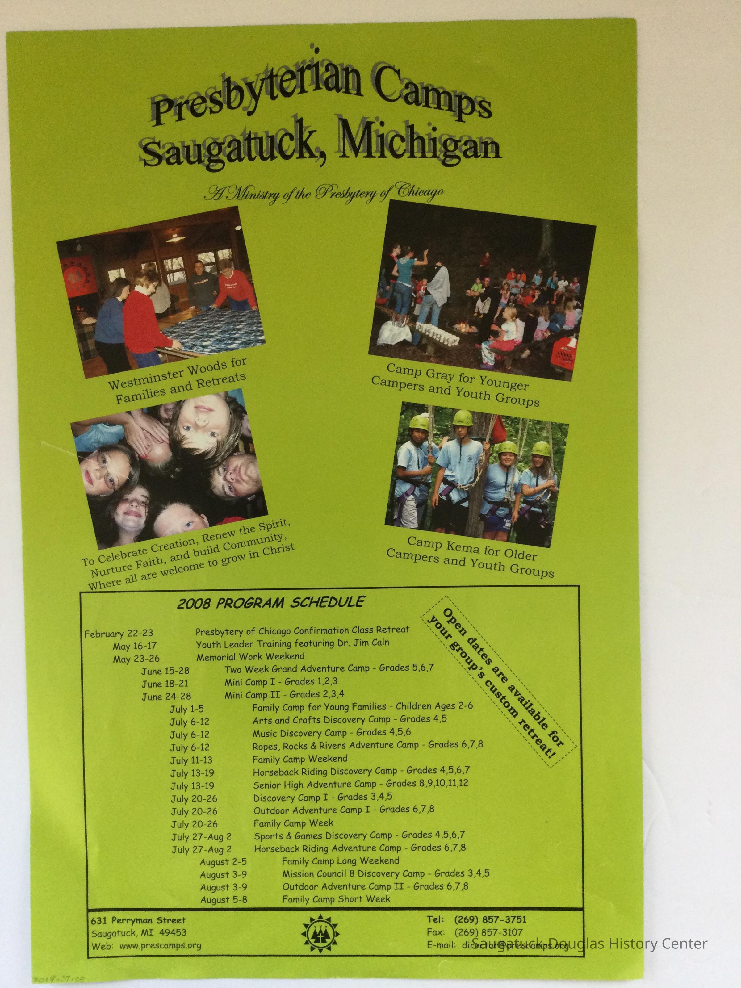 A two sided poster ( 11x17") with photographs of Children at the Presbyterian Camp enjoying tjhe various activities. On the reverse side is a 2008 program schedule listing the various theme camping weeks.Collection