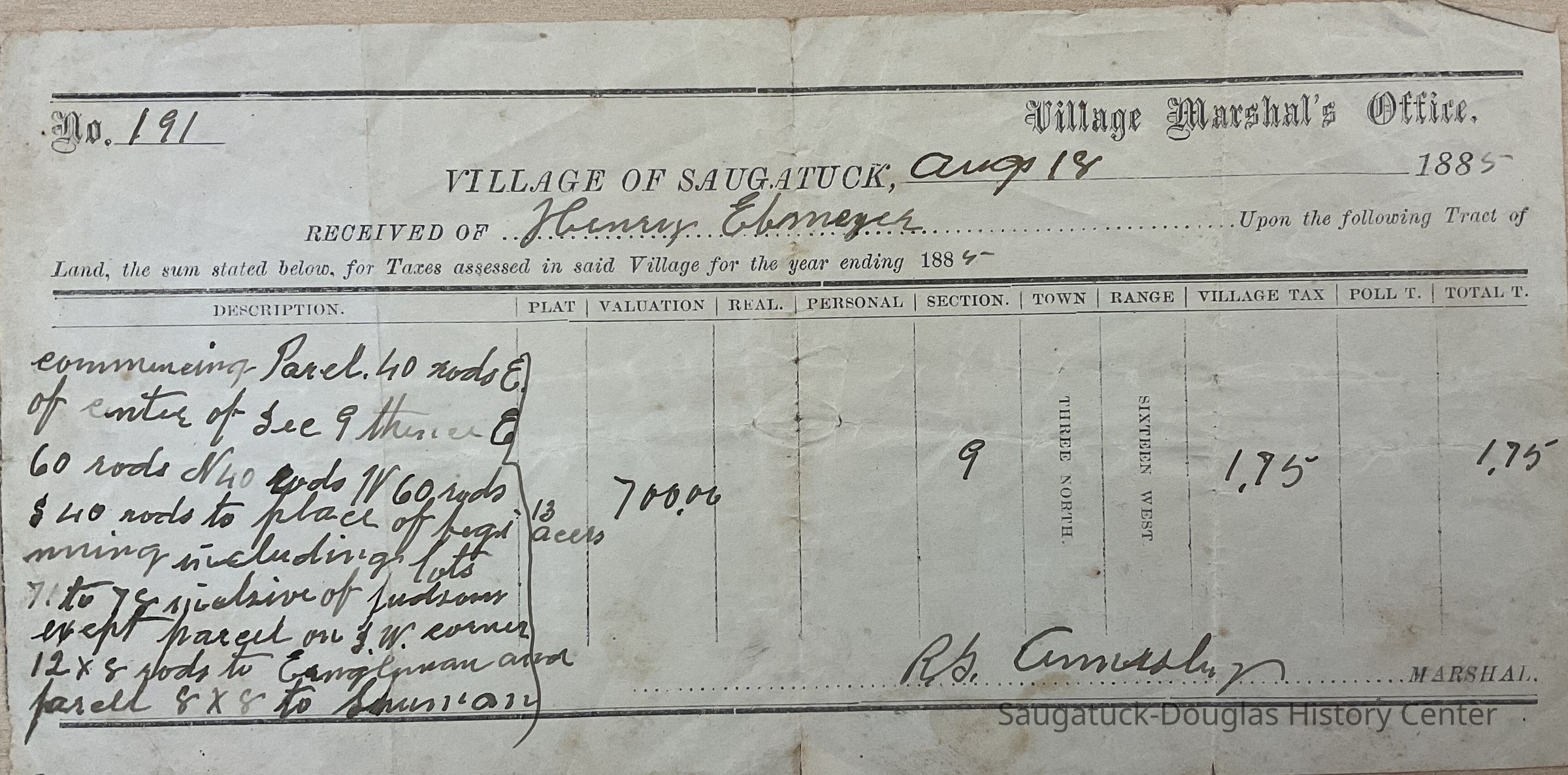 Village of Saugatuck 1885 tax receipt for $1.75 received from Henry Ebmeyer.Collection