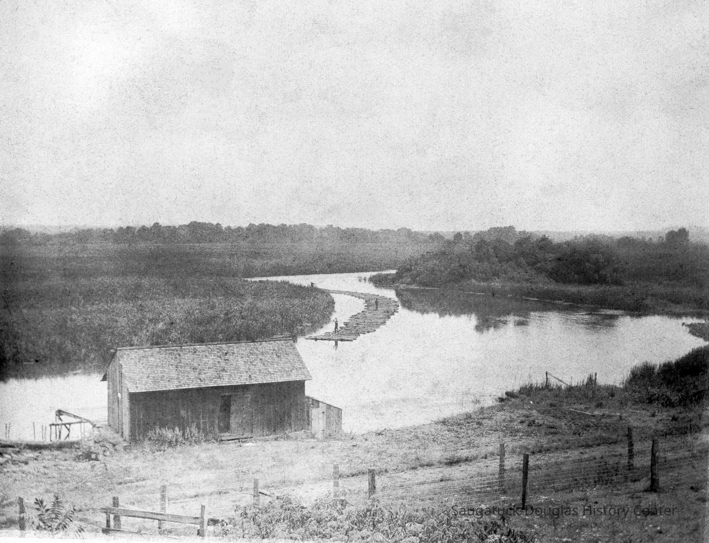 The photo depicts a small building by a road and line of wire fencing. The road side of the building has a door, no windows, a shed roofed extension and a dock on its river side. In the distance two men can be seen on a raft of logs moving down the Kalamazoo River.Photograph Details