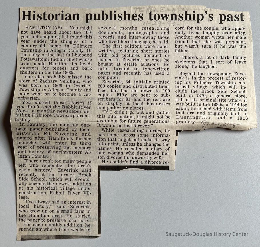 Newspaper clipping dated 11-29-1992 with headline "Historian publishes township's past" Hamilton (AP) Interview with Zuverink.
