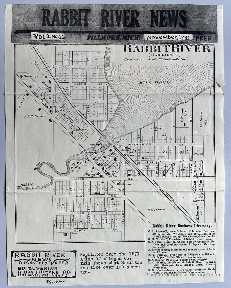 Vol 2 No. 11, dated November 1991, with map reprinted from 1873 Atlas of Allegan Co. and Rabbit River business directory.