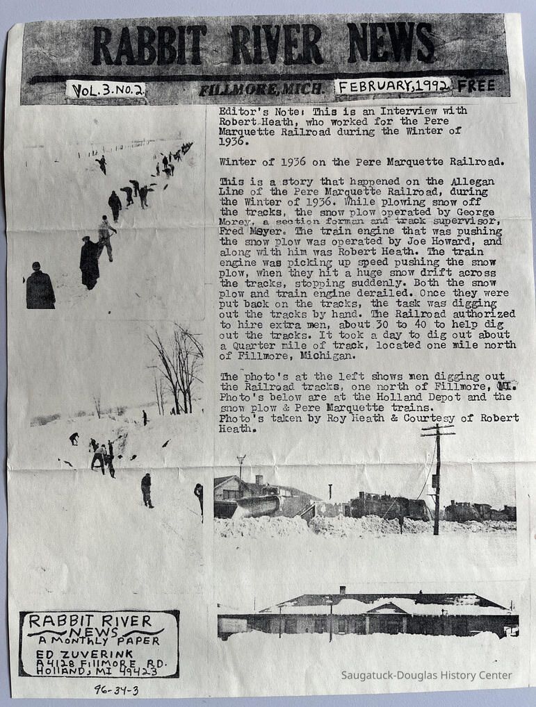 Vol 3 No. 2, dated February 1992, photos and interview with Robert Heath on the (blizzard) winter of 1936 and the Pere Marquette Railroad, Allegan line. Names George Morey snow plow operator and Fred Meyer track supervisor.