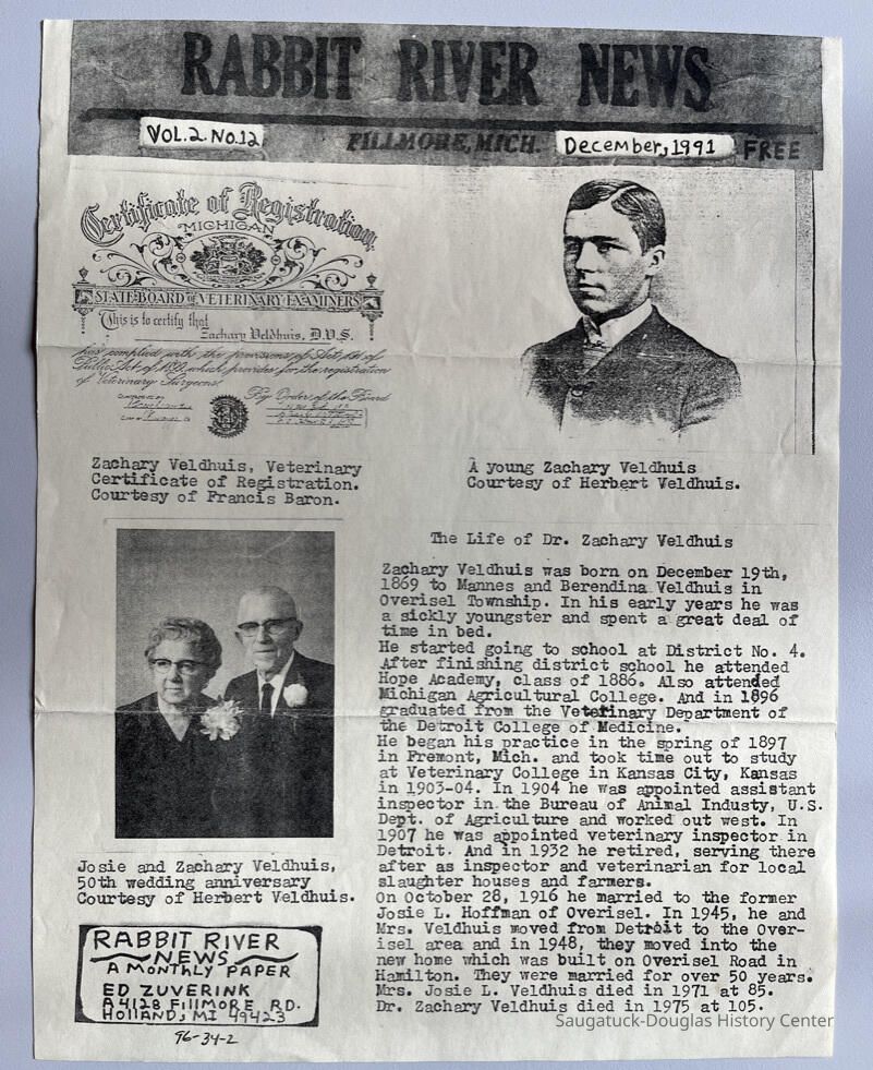 Vol 2 No. 12, dated December 1991, about Josie L. (Hoffman) and Dr. Zachary Veldhuis (1869-1975), a veterinary doctor.