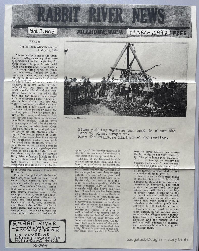 Vol 3 No. 3, dated March 1992, photo of stump pulling machine from Fillmore Historical Collection and text about Heath township from Allegan Journal, May 11, 1878. Text describes economic possibilities of the land, pine, iron or, corn, farming, swamps, creeks.