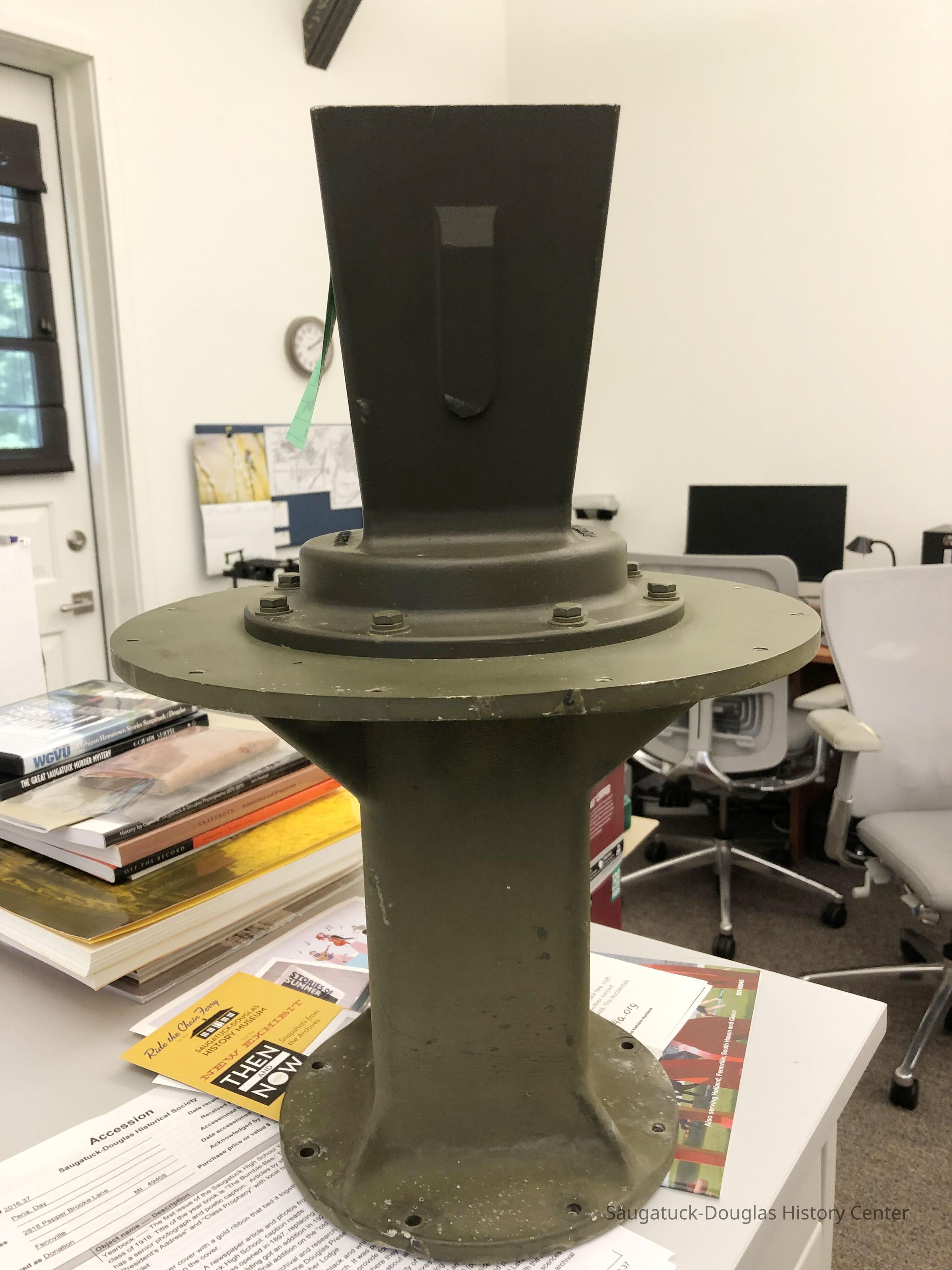 Robust metal object from the radar installation. A trapizoid shaped funnel, with interior fins, is bolted to a circular based that is fared on both ends. Painted green.Context