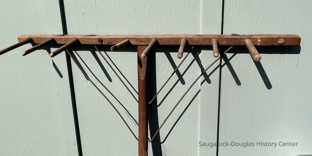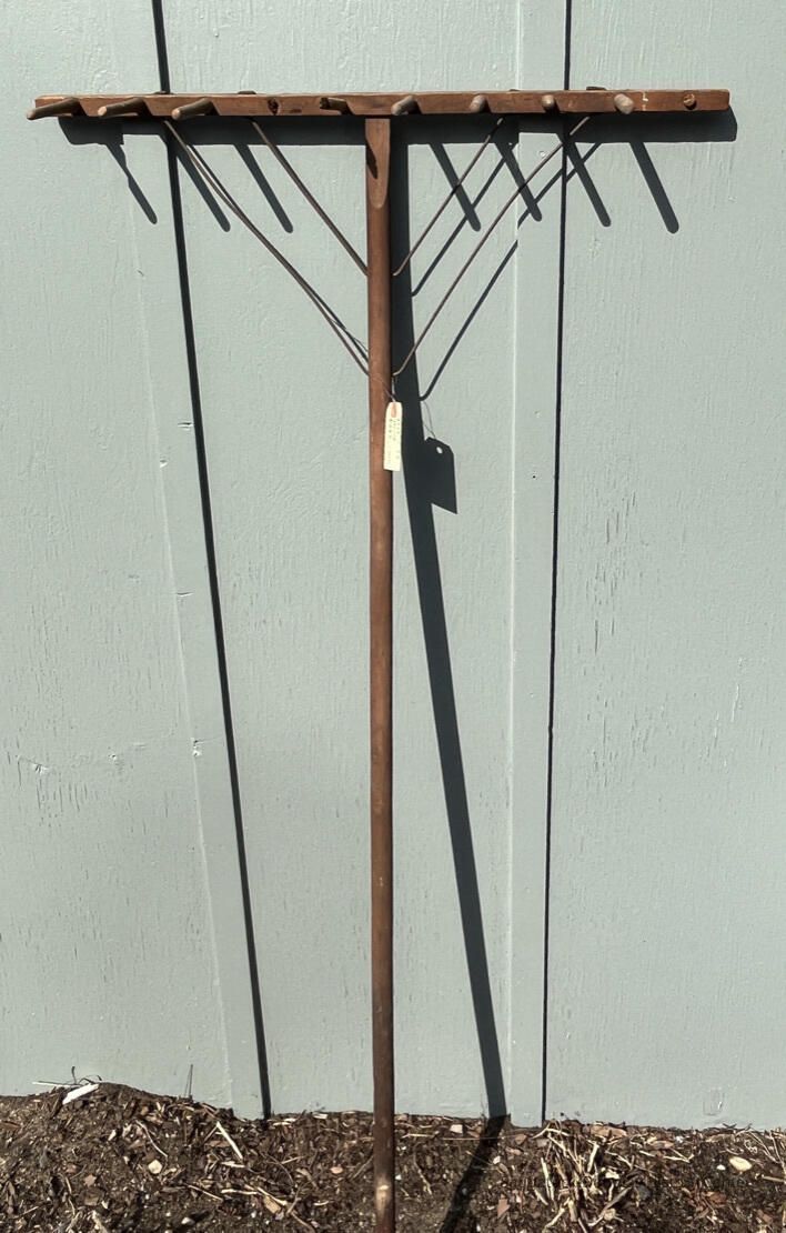 Wooden hand rake with 5" pegs and metal stabilizers from the House estate.Acquisition
