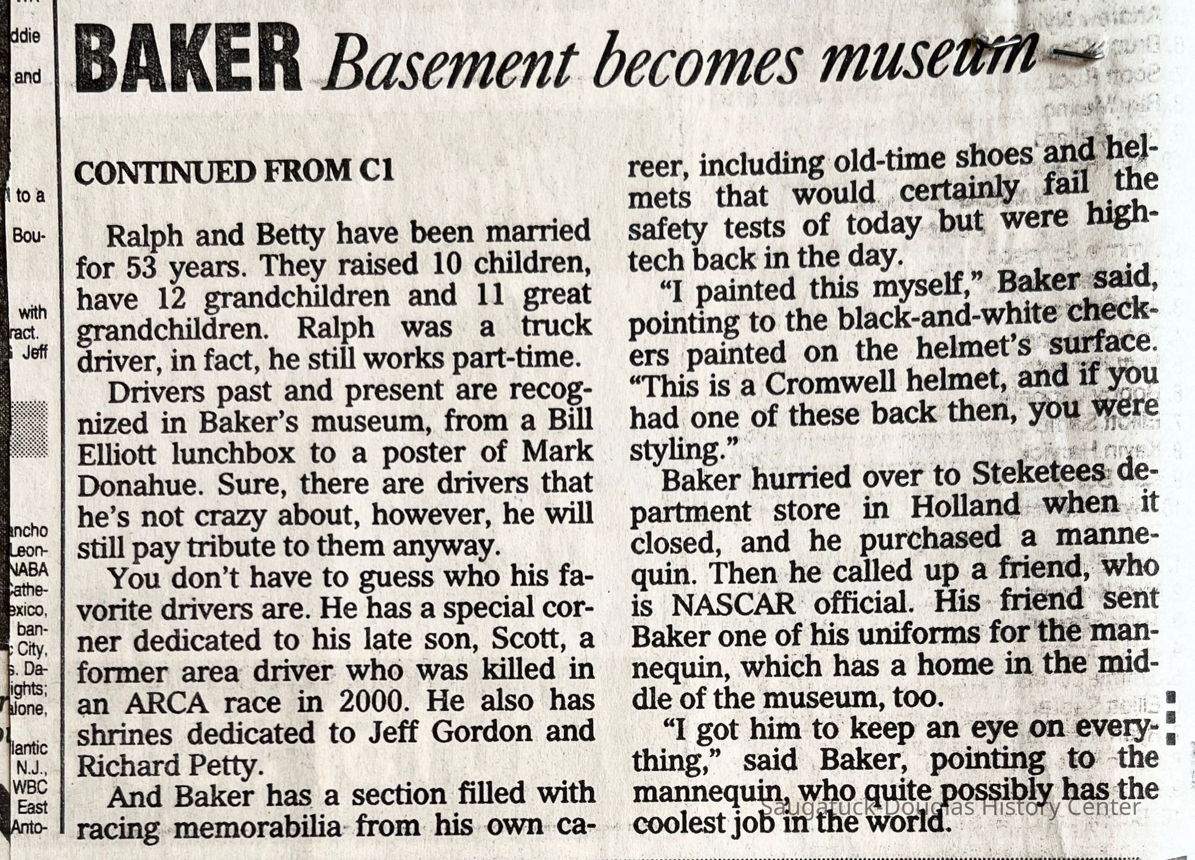 "Racing History - Local legend Baker has mini-museum of memorabilia" by Steve Kaminski, Grand Rapids Press, 22 July 2004.Context