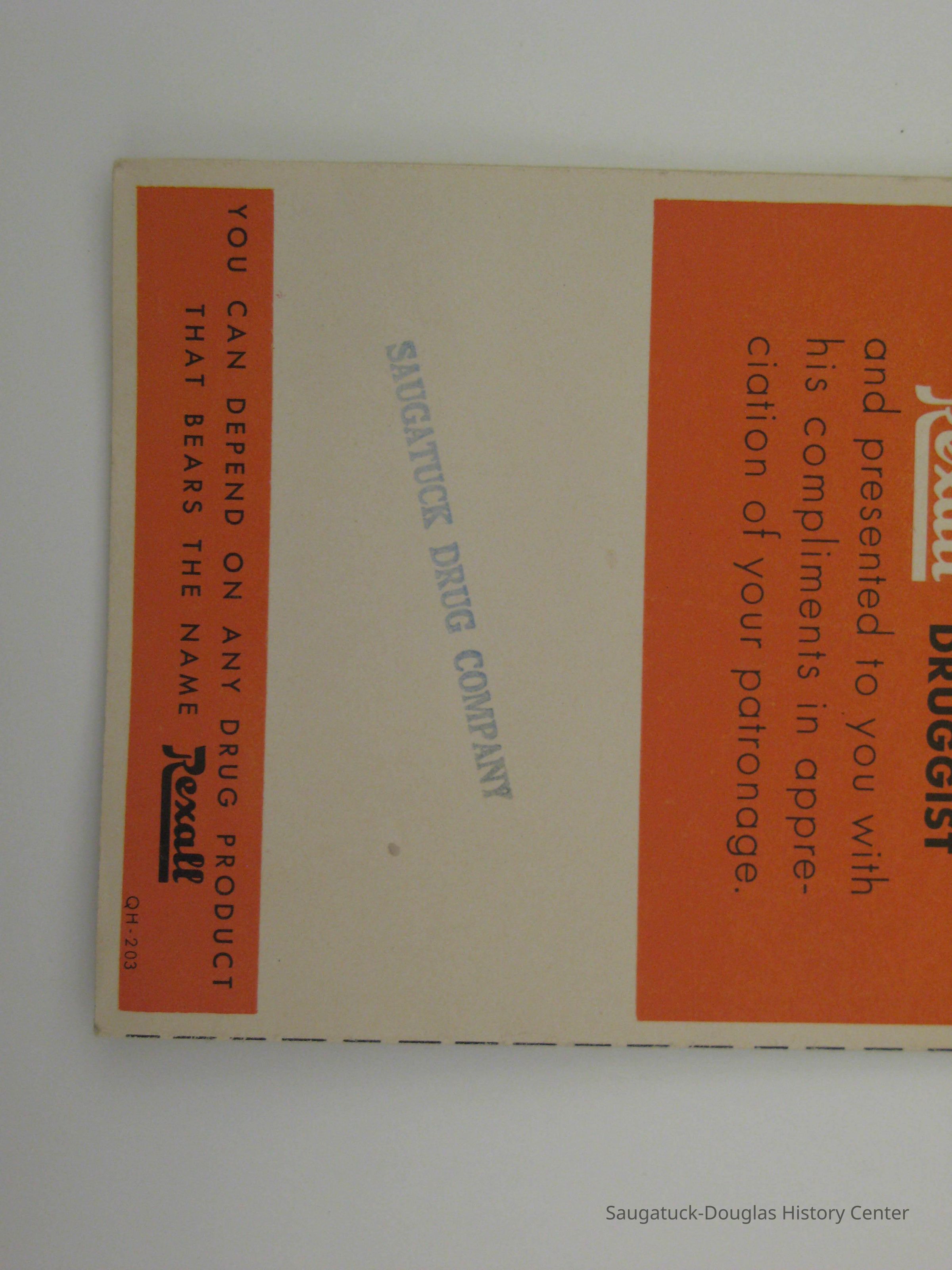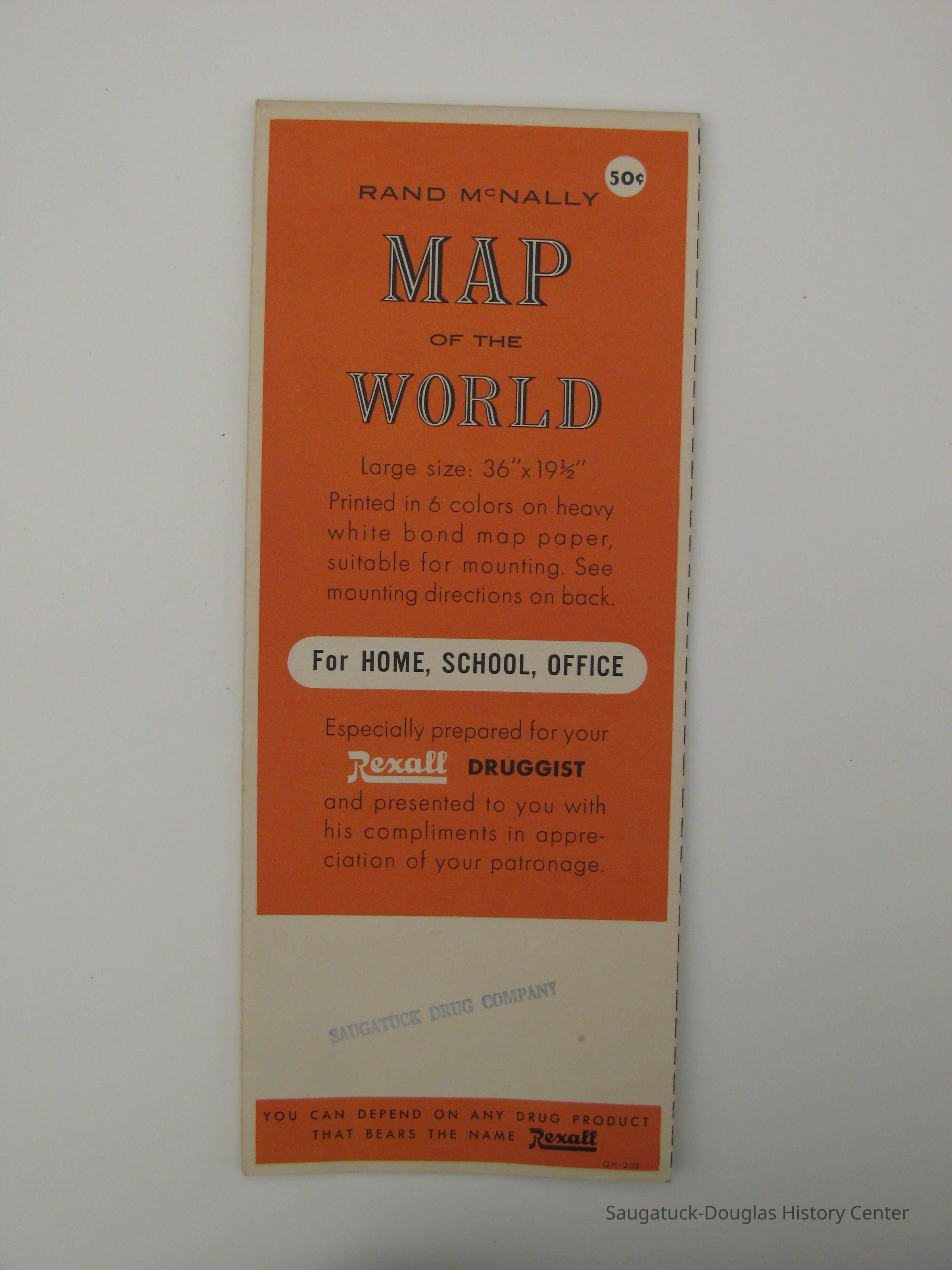 Rand McNally Map of the World that could be hung on the wall. The front of the map shows that it could be purchased for 50 cents and there is a stamp at the bottom that says, "Saugatuck Drug Company." Most likely, this is where the map was purchased by Dianne Moker, or one of her family members. The map still has its mounting instructions which indicates that it was never hung up. Based on the style of the map, it is most likely from the 1930s, but the exact date is unconfirmed. It displays the world, with North and South America in the center. Each country is labeled and highlighted in different colors.Collection