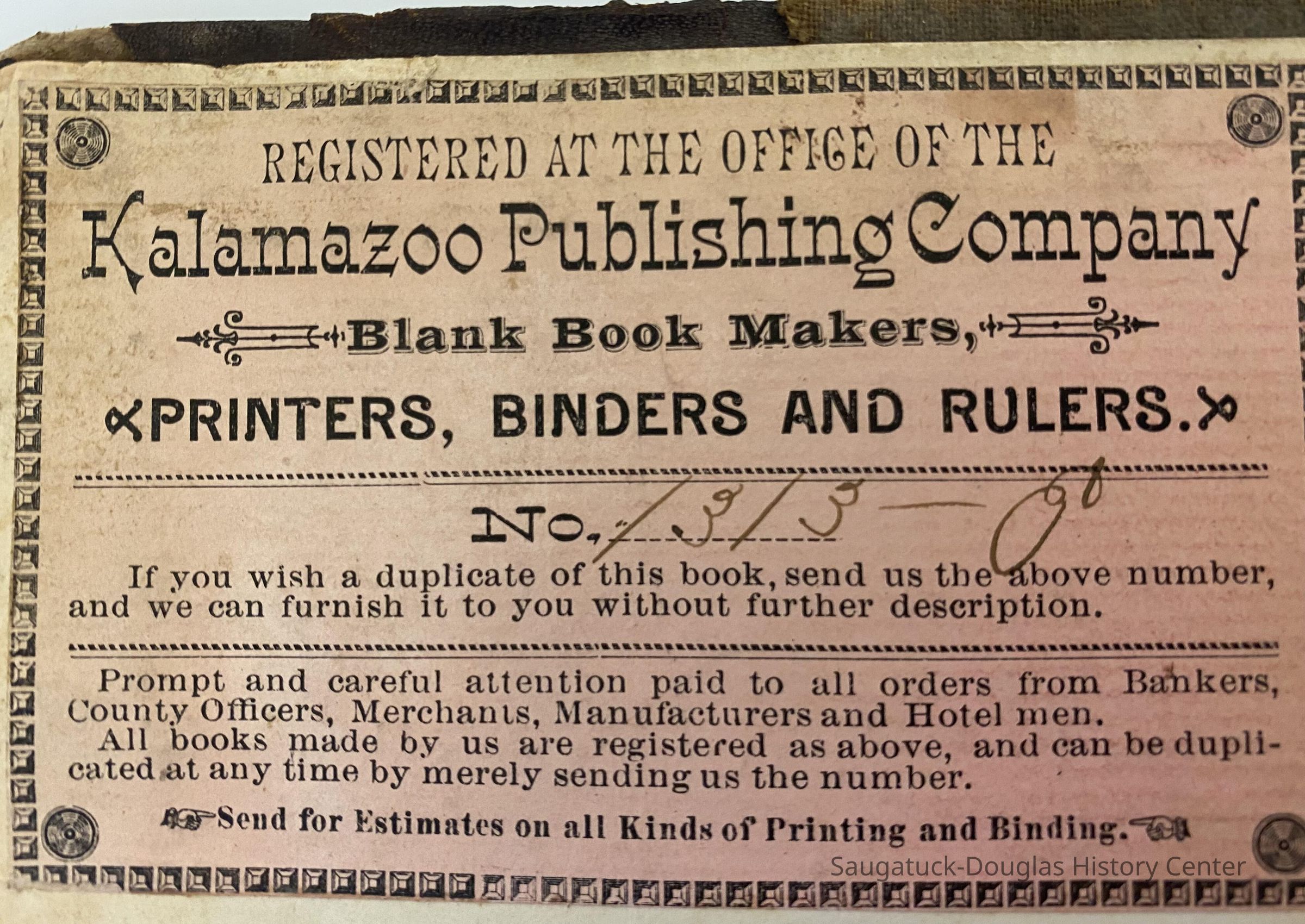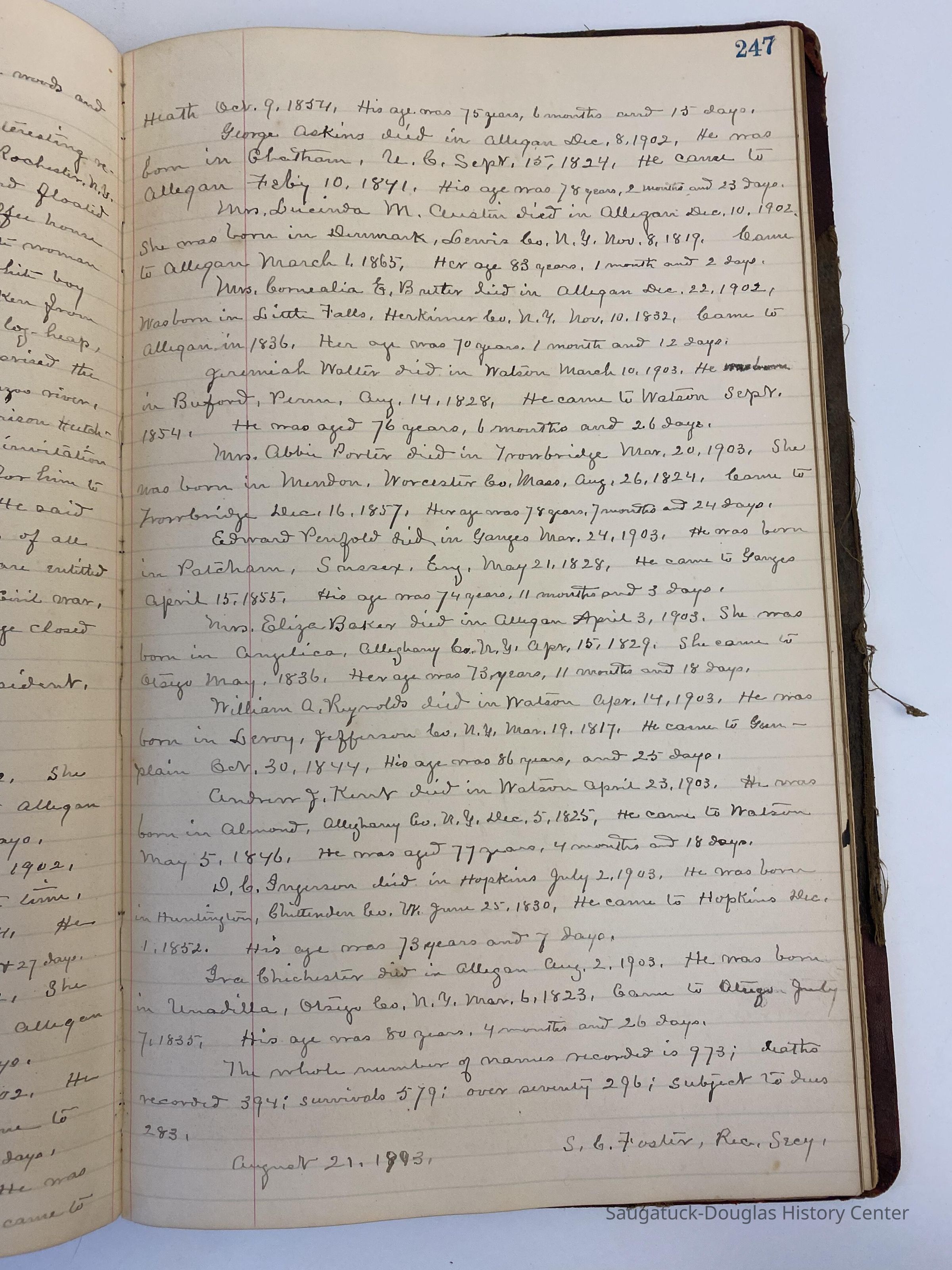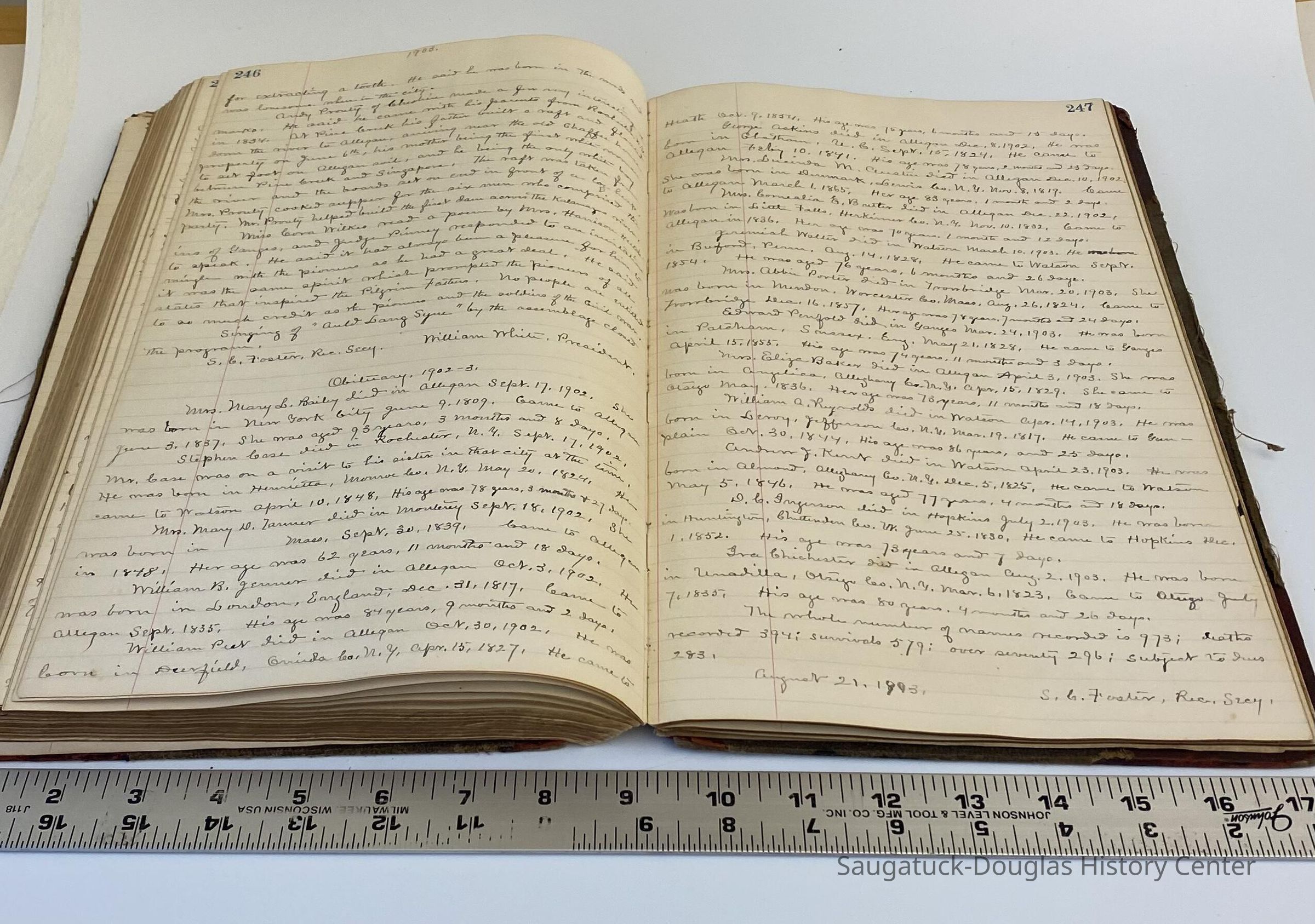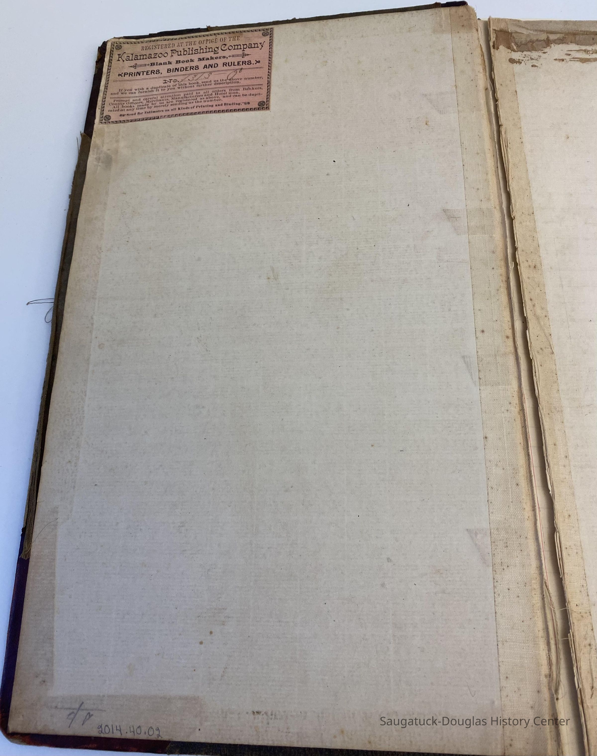 A bound volume of records from the Pioneer Society of Allegan County, State of Michigan. Spine of book has leather with gold lettering identifying book as Records from the Pioneer Society of Allegan County from Kalamazoo Publishing Company. Inside are handwritten minutes from 1875 to 1903 of meetings discussing the history of Allegan County leading up to the Centennial and beyond.