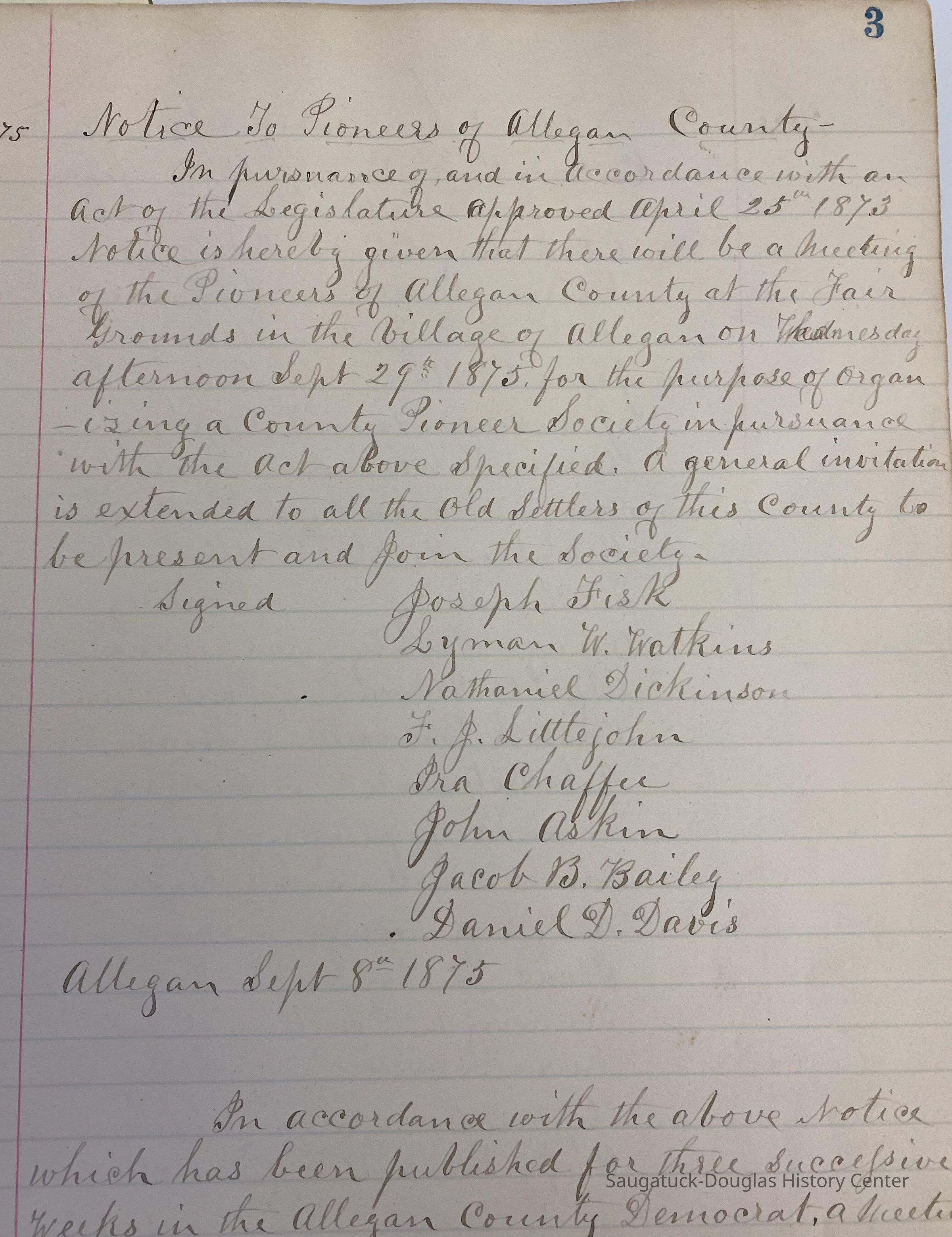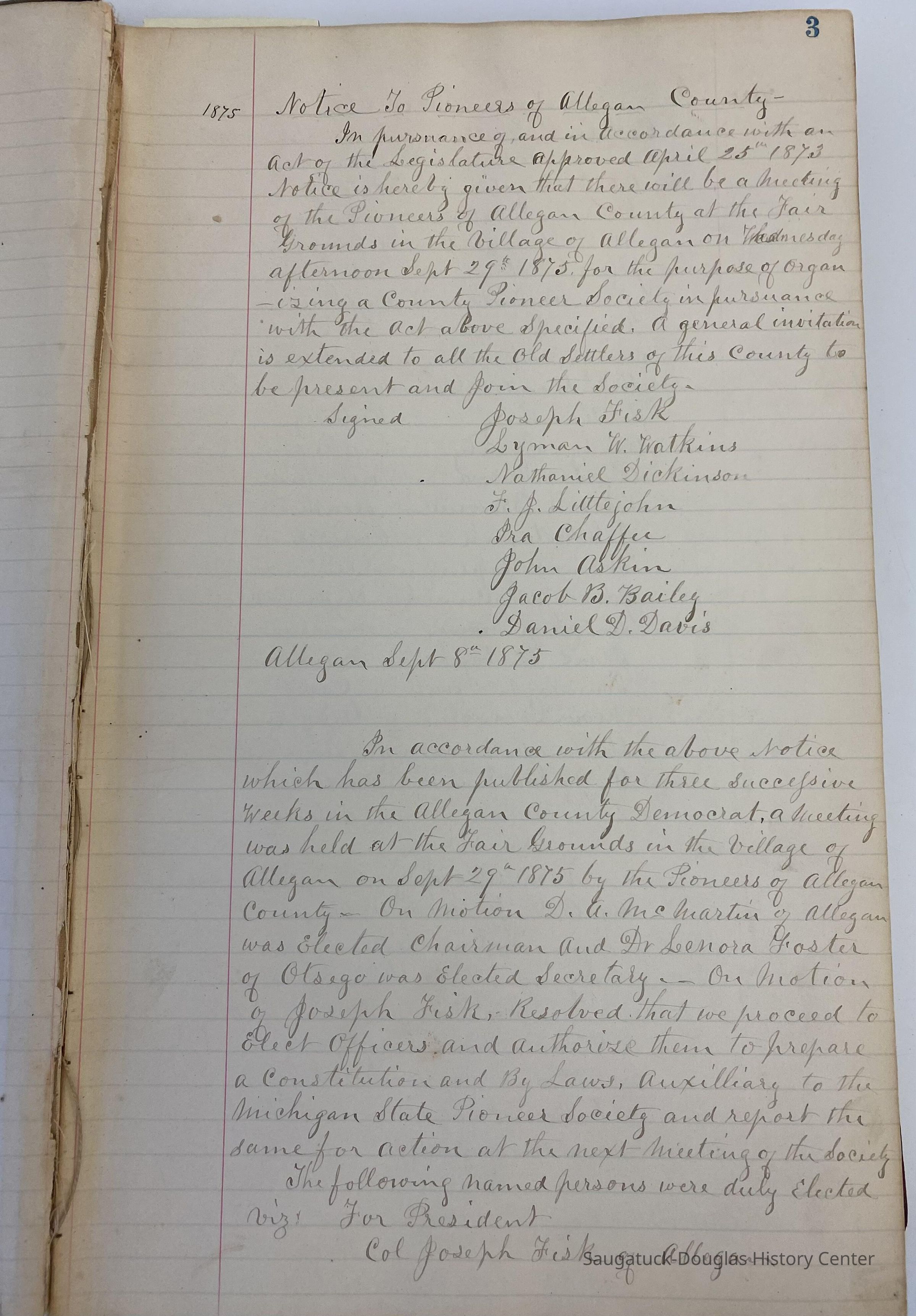 The first meeting was held September 8, 1875 at the Allegan County Fairgrounds. Officers were elected and a constitution was written. A list of vice presidents (from each township) is listed on page 2.Collection