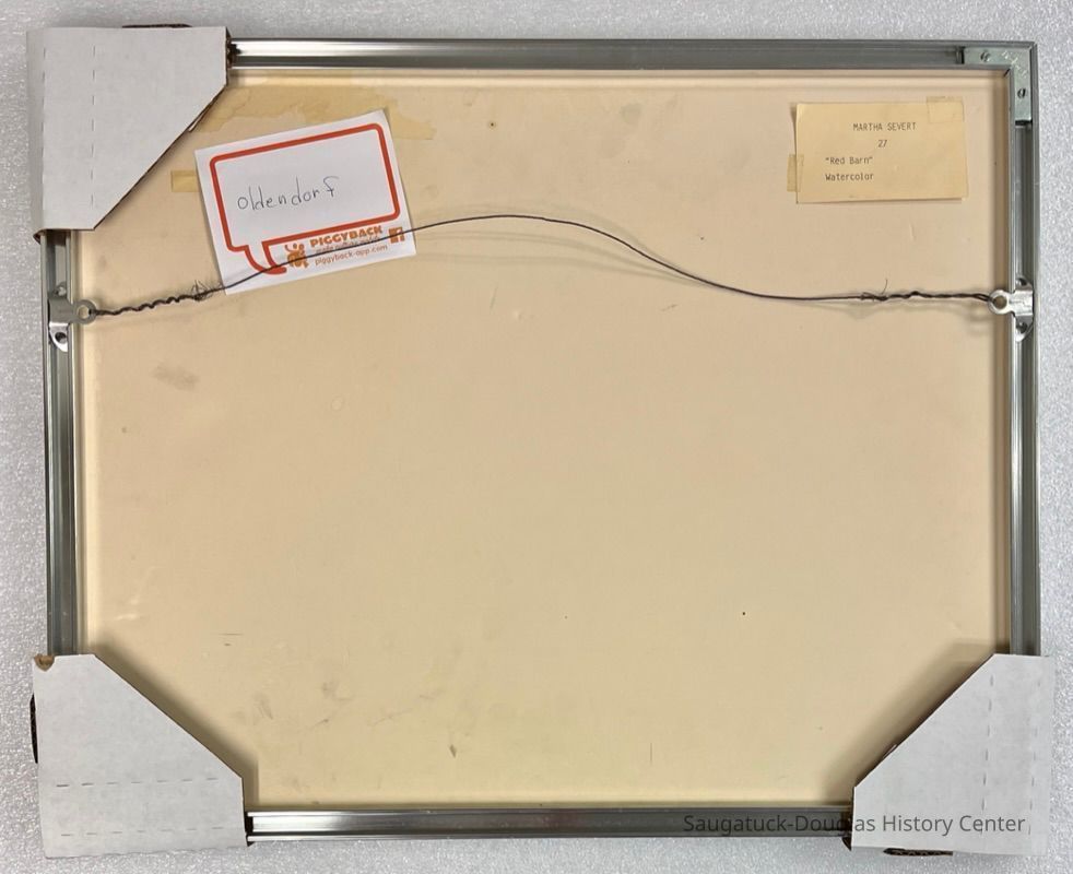 A label on the back of the frame identifies the work as "Red Barn" watercolor Martha Severt 27.