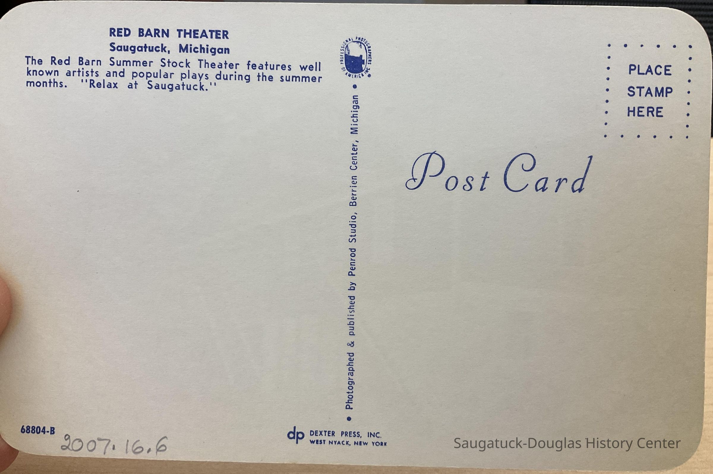 Caption on reverse side: The Red Barn Summr Stock Theater features well know artists and popular plays during the summer months. "Relax at Saugatuck."Subject Person/Organization