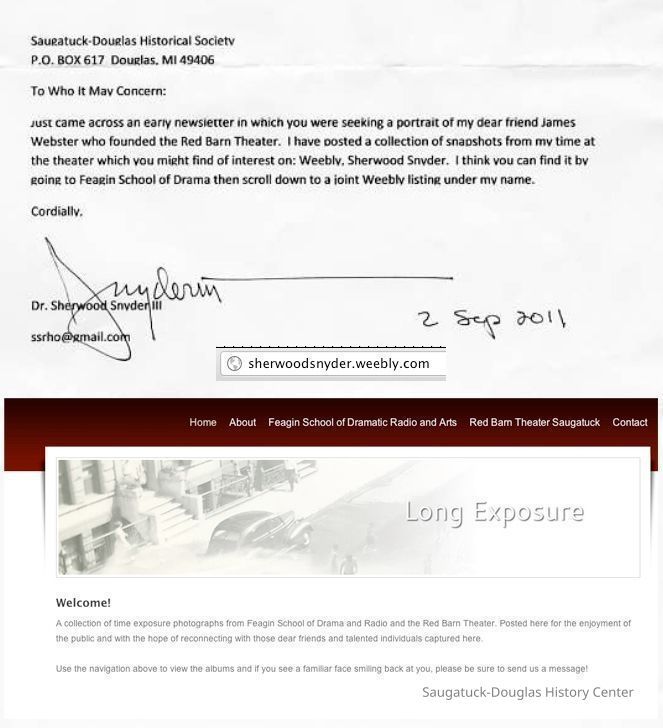 There would be no Red Barn Theatre had it not been for James Webster. He started The Saugatuck Summer Players in 1948, producing and directing his shows in the old Saugatuck High School. He found a talent pool within the locals, visiting tourists and from the Kalamazoo Civic Players and the Twin City Players of Benton Harbor and St. Joseph, two well established theater groups. After three successful years, in 1951, Mr. Webster moved the group to the Gray Gables barn in Douglas and took on the name of The Red Barn Theatre. Eager to expand, he purchased the old barn north of Saugatuck on the Belvedere estate and by 1954, The Red Bar Theatre of Saugatuck was on its way to becoming one of the finest summer theatres in the state. After three short but highly successful seasons, Mr. Webster was forced to retire owing to ill health. During those three years, the internship program grew, drawing students from across the Nation, adding support for such ambitious seasons as the seventh in which eleven productions of merit were mounted between 23 June and closing 11 September. Mr. Webster died in 1966 at the age of 53.