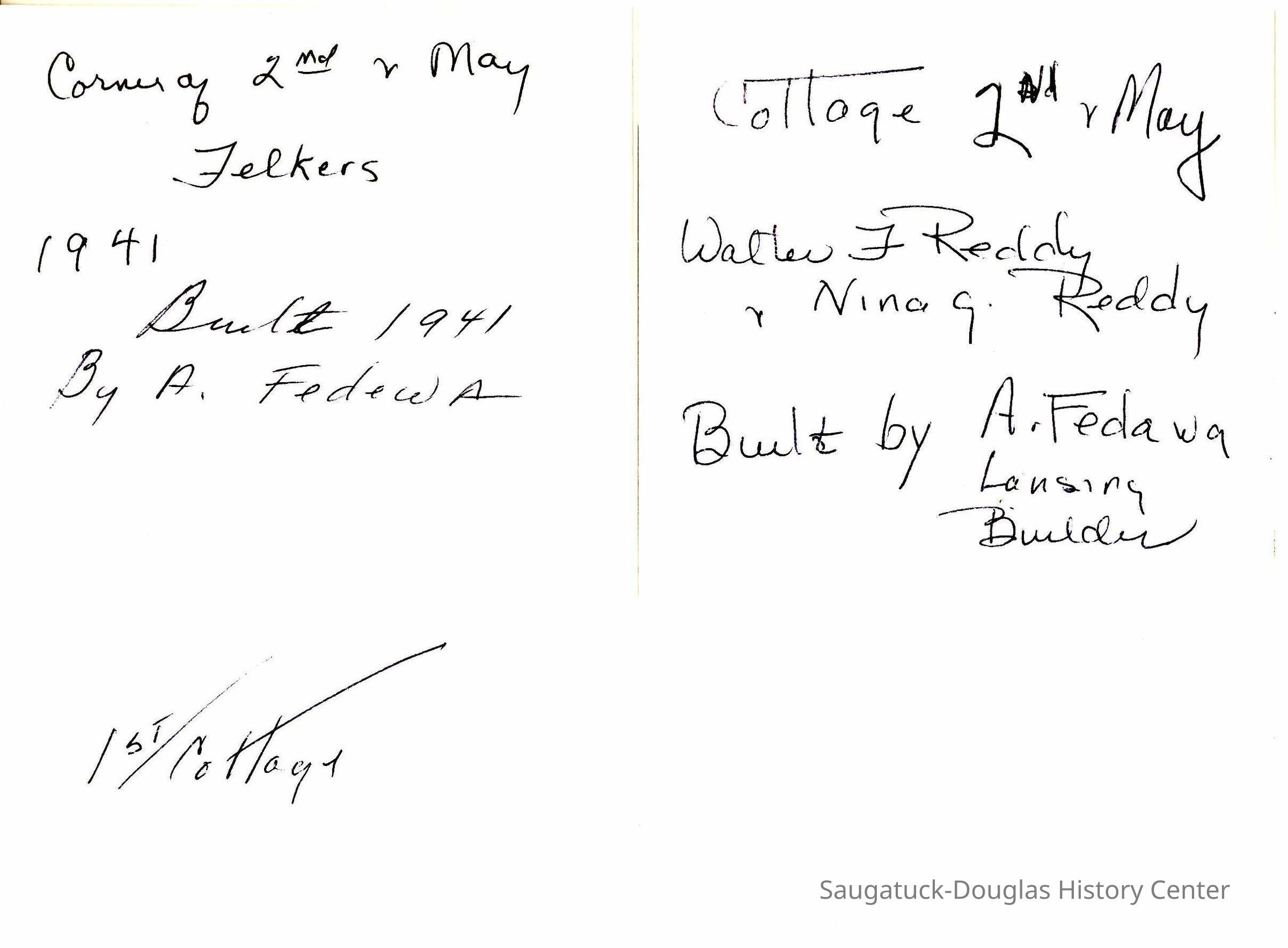 In 1941 one of the auditors who worked with Walter offered him some property in Douglas which he had bought in an unpaid tax foreclosure. He sold Walter several parcels of what was the Felker's farm for "one dollar and other good and valuable considerations". Walter then hired a builder from Lansing, Arnold Fedewa, to construct the first family cottage in the subdivision at Second and May Streets. Walter originally assumed that the cottage would be for occasional weekend use. His wife and children, however, loved the area so much that they packed up when school in Lansing ended and remained until school reopened. A small but interesting out building was subsequently built on the property west of the cottage as an extra sleeping space for guests.
